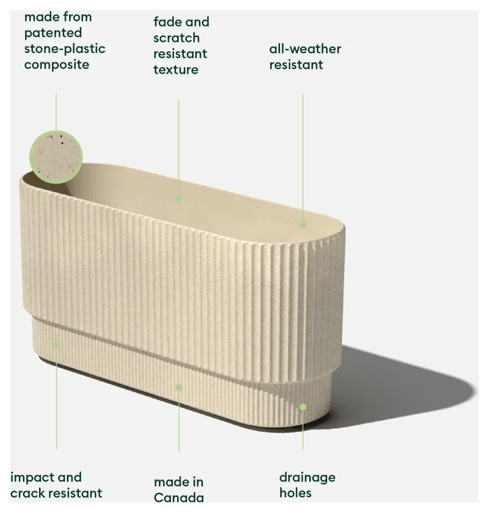 Minimal design and modern appeal. With softened, fluted lines in all the right places, the Demi Long planter is the perfect all-season flower pot for nearly any plant in any space, whether indoors waiting to greet your guests at the foyer or out on the front porch. Made with drainage holes, you don''t have to worry about overwatering your plants. Demis are made from a patented, heavy-duty concrete-plastic composite that is durable and impact-resistant. All Demi planters are crack-resistant and are specially treated with UV inhibitors to prevent fading. Veradek planters are designed and made in Canada, so you can rest assured you are receiving the highest quality of planters that''ll last all year round.