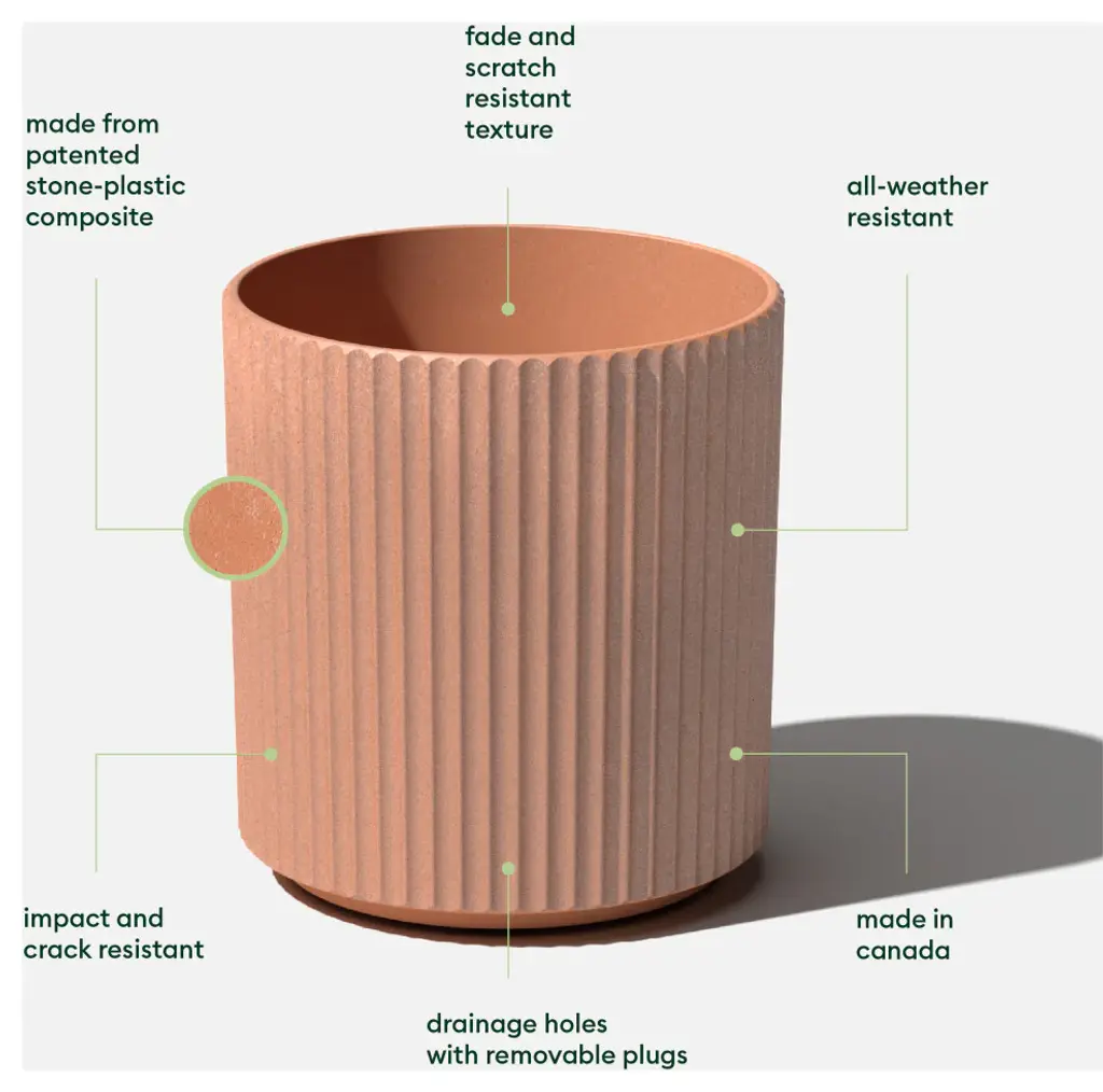 Inspired by traditional Roman columns, the fluted edges on the Veradek Demi Planter help to create a cozy indoor or outdoor space in the living room, patio or backyard. Pre-drilled drainage holes allow for planting a variety of different greenery such as trees, tall plants or flowers without having to worry about overwatering. This sturdy yet lightweight round planter is proudly crafted in Canada from a patented plastic-stone composite, making it resistant to cracks, fading and UV and allowing it to withstand extreme temperatures ranging from -20 to +120 degrees. With the ideal balance of design, structure and purpose, the Demi will add the finishing touches needed to transform a house into a home.
