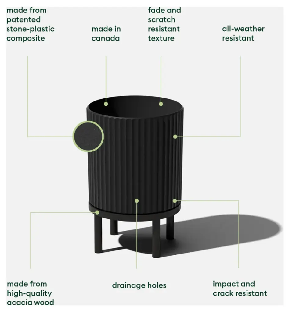 Minimal design and modern appeal. With softened, fluted lines in all the right places, the Raised Demi planter is the perfect all-season flower pot for nearly any plant in any space, whether indoors waiting to greet your guests at the foyer or out on the front porch. Made from a patented, heavy-duty concrete-plastic composite, Demi planters have the look of concrete, while still maintaining the durable, impact-resistant performance of plastic. This fluted planter comes with an acacia wood stand that''s perfect for adding some height to your favorite plants. All Demi planters are crack-resistant and are specially treated with UV inhibitors to prevent fading. These Veradek planters are designed and made in Canada, so you can rest assured you are receiving the highest quality of planters that''ll last all year round.