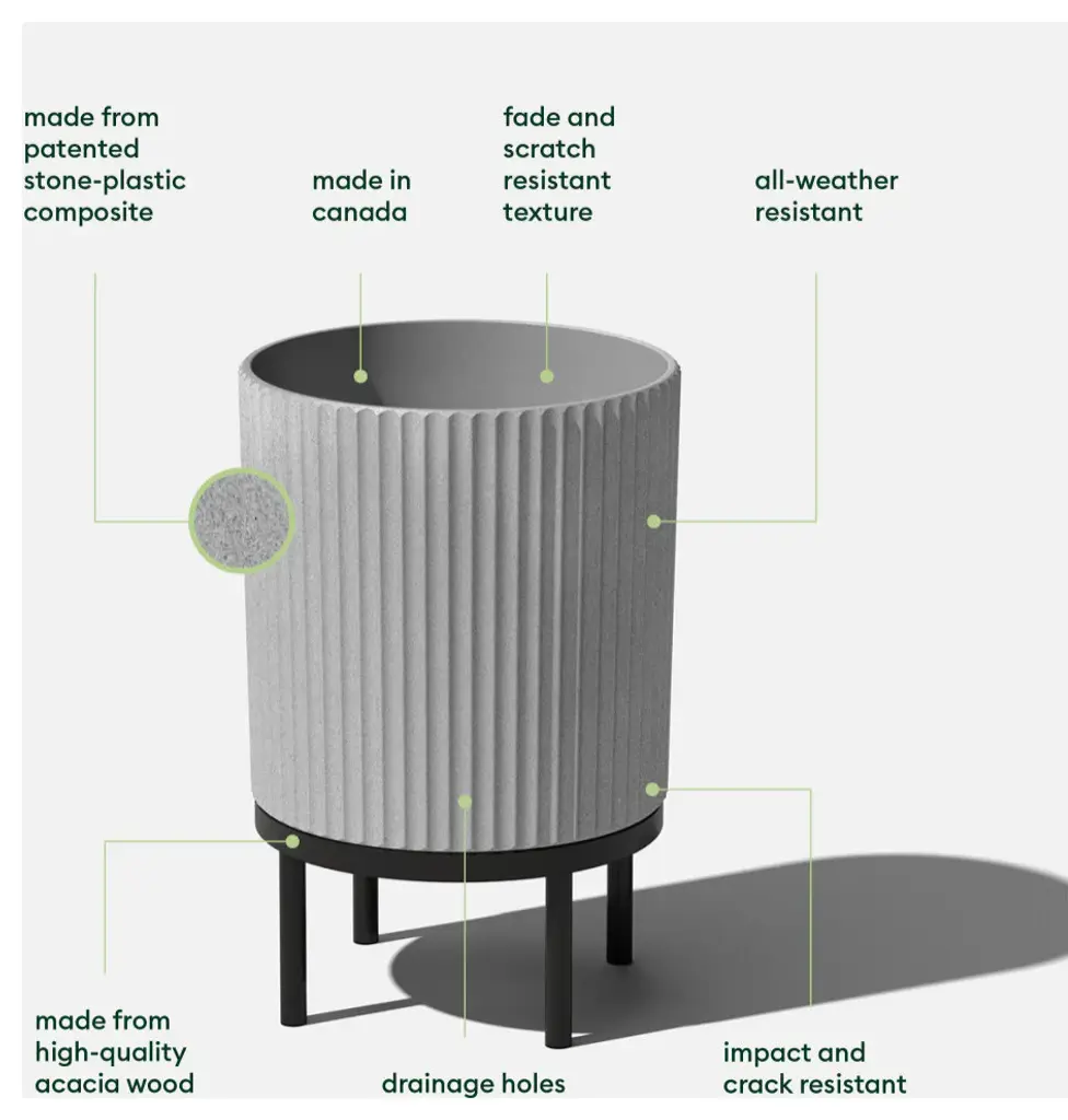 Minimal design and modern appeal. With softened, fluted lines in all the right places, the Raised Demi planter is the perfect all-season flower pot for nearly any plant in any space, whether indoors waiting to greet your guests at the foyer or out on the front porch. Made from a patented, heavy-duty concrete-plastic composite, Demi planters have the look of concrete, while still maintaining the durable, impact-resistant performance of plastic. This fluted planter comes with an acacia wood stand that''s perfect for adding some height to your favorite plants. All Demi planters are crack-resistant and are specially treated with UV inhibitors to prevent fading. These Veradek planters are designed and made in Canada, so you can rest assured you are receiving the highest quality of planters that''ll last all year round.
