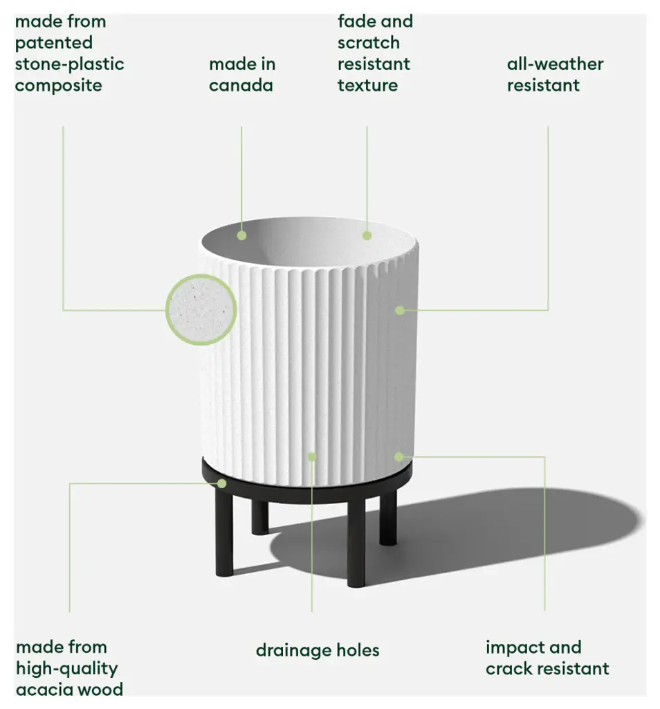Minimal design and modern appeal. With softened, fluted lines in all the right places, the Raised Demi planter is the perfect all-season flower pot for nearly any plant in any space, whether indoors waiting to greet your guests at the foyer or out on the front porch. Made from a patented, heavy-duty concrete-plastic composite, Demi planters have the look of concrete, while still maintaining the durable, impact-resistant performance of plastic. This fluted planter comes with an acacia wood stand that''s perfect for adding some height to your favorite plants. All Demi planters are crack-resistant and are specially treated with UV inhibitors to prevent fading. These Veradek planters are designed and made in Canada, so you can rest assured you are receiving the highest quality of planters that''ll last all year round.