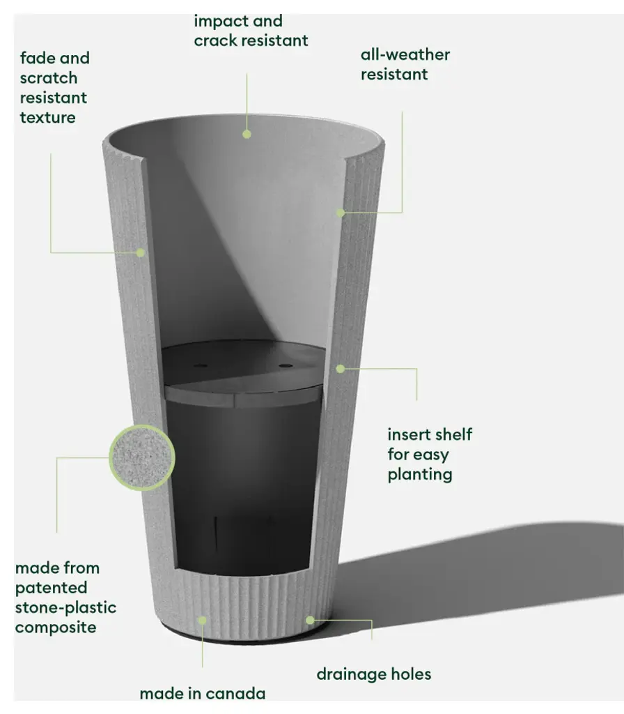 Minimal design and modern appeal. With softened, fluted lines in all the right places, the Demi tall planter is the perfect all-season flower pot for nearly any plant in any space, whether indoors waiting to greet your guests at the foyer or out on the front porch. With a removable insert shelf, you can save soil or easily change your plant arrangements. Made from a patented, heavy-duty concrete-plastic composite, Demi planters have the look of concrete, while still maintaining the durable, impact-resistant performance of plastic. All Demi planters are crack-resistant and are specially treated with UV inhibitors to prevent fading. These Veradek planters are designed and made in Canada, so you can rest assured you are receiving the highest quality of planters that''ll last all year round.