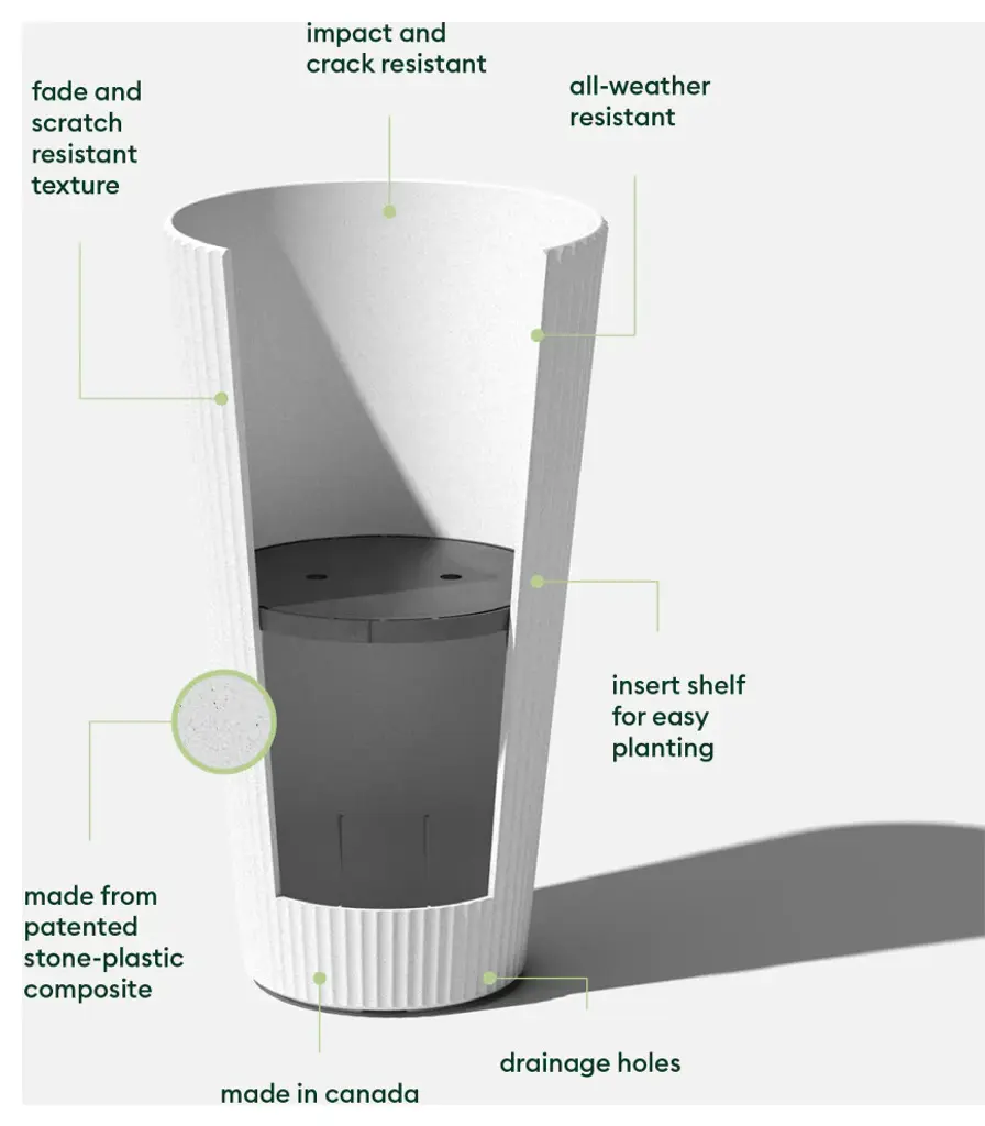 Minimal design and modern appeal. With softened, fluted lines in all the right places, the Demi tall planter is the perfect all-season flower pot for nearly any plant in any space, whether indoors waiting to greet your guests at the foyer or out on the front porch. With a removable insert shelf, you can save soil or easily change your plant arrangements. Made from a patented, heavy-duty concrete-plastic composite, Demi planters have the look of concrete, while still maintaining the durable, impact-resistant performance of plastic. All Demi planters are crack-resistant and are specially treated with UV inhibitors to prevent fading. These Veradek planters are designed and made in Canada, so you can rest assured you are receiving the highest quality of planters that''ll last all year round.