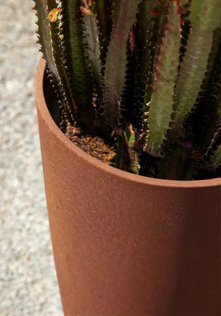 A deep rust color combined with a tall, curved body makes the Selena planter the perfect addition to your outside space watch as the plastic and steel develops an even rust finish, adding character, charm and a pop of color. Made from a patented plastic and steel composite, this tall planter is all-weather resistant to splitting, cracking, UV damage and can withstand temperatures ranging from -20 to +120 degrees. The drainage holes also allow for proper water drainage and prevent root rot. The Veradek Patina Series is proudly made in Canada, so you can rest assured that your planter will last all-year round.