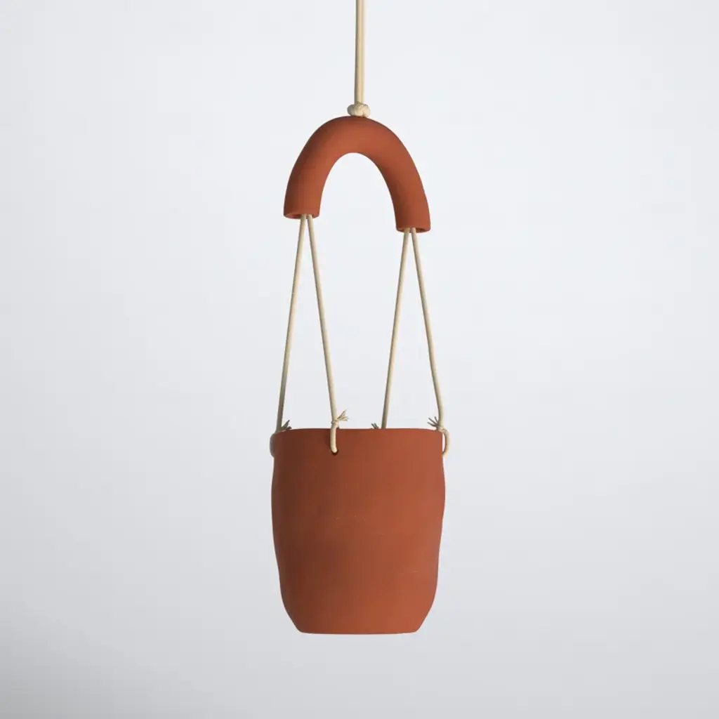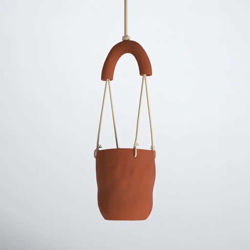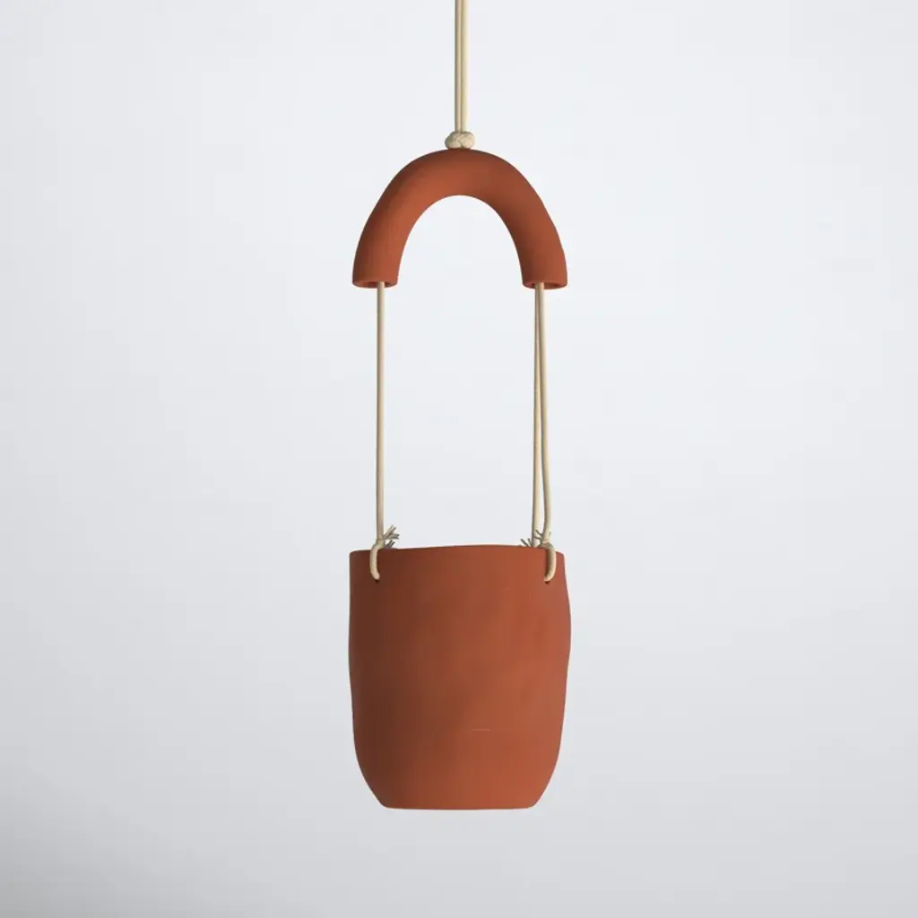 This hanging planter pot brings a homespun, rustic-inspired feel to any room in your home. A hand-formed arch is strung onto the white rope as a decorative detail, while the matching pot is perfect for a drop-in houseplant that's a bit smaller in size. It comes in a warm organic tone with a clay-like hand-formed surface for a bit of boho boldness. Place it in the corner of your kitchen or sunroom in front of a large south-facing window.