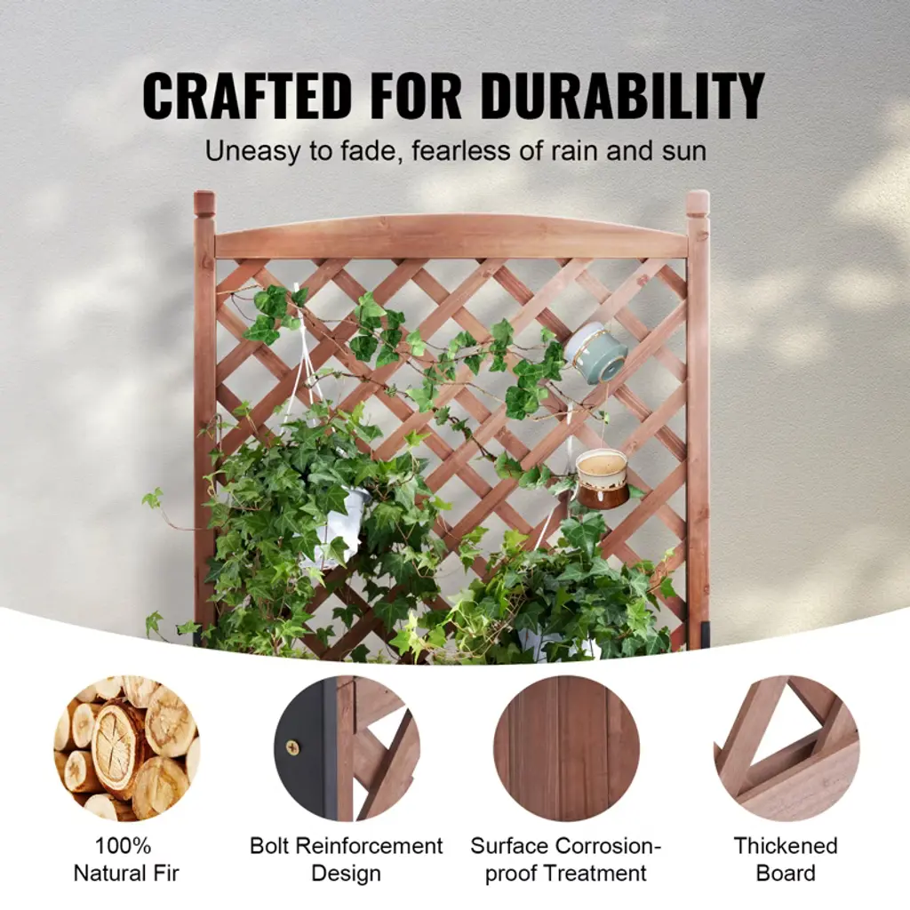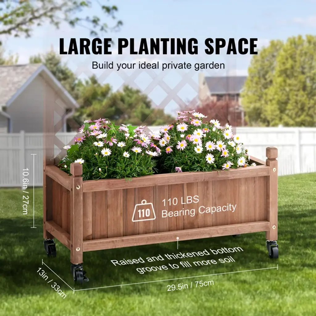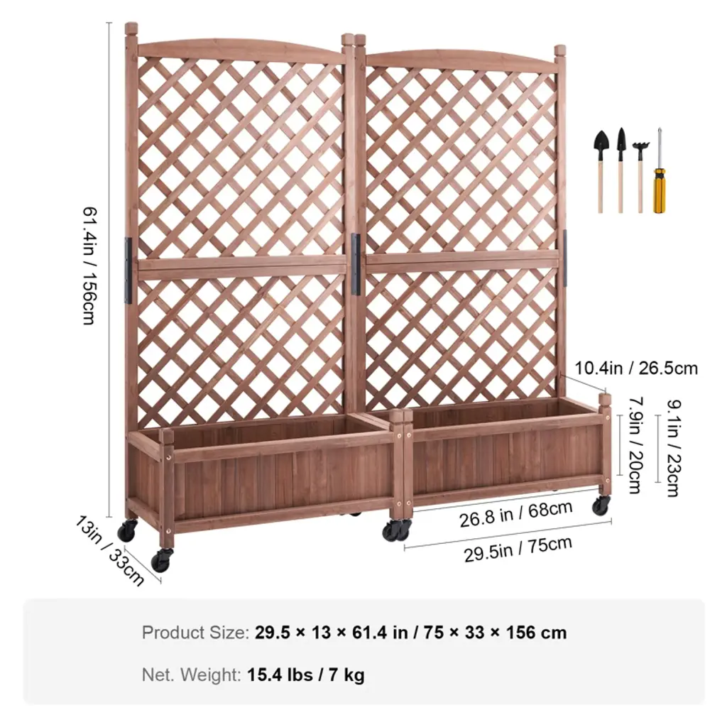 Feature: More Space for More Planting: VEVOR's 2pcs raised and thickened wood planter with trellis is the perfect addition to make your dream garden a reality. The sturdy frame grid ensures your plants are fully supported, while also allowing climbing vines to reach new heights. With 110 LBS maximum bearing capacity of each raised bed, you can plant all your favorite veggies and flowers without worry. First Choice for Planting: From beautiful flowers and climbing plants to hanging baskets and privacy fences, this bed is perfect for all your garden needs. Whether it's courtyard decoration or balcony greening, our raised garden bed is your go-to solution for outdoor green plant growth. Plus, it's widely used in gardens, parks, and green belts. Crafted Solid Wood: Made with solid natural fir wood and treated with anti-corrosive paint, this high-quality planter box is built to last. With its waterproof properties, it's perfect for long-term outdoor use without fading. Plus, the reinforcement of 8 uranium screws makes it more stable and secure than ever before. Outshine the Competition: Designed with bottom drainage holes to prevent root rot and a lattice network frame that creates a stable environment for your plants to grow and flourish. Plus, the garden bed comes equipped with universal wheels, making it easy to move and maintain your garden without any heavy lifting. Install in Minutes: With pre-drilled holes and multiple planting tools provided, assembly is a breeze. Just follow the easy-to-use instructions and fasten the boards together with the included screws. You'll be ready to decorate your living space with your new garden in no time and enjoy it with your family and friends! Package Content: Raised Garden Bed with Trellis x 2 Planting Tool Set x 3 Screwdriver x 1 Instruction Manual x 1