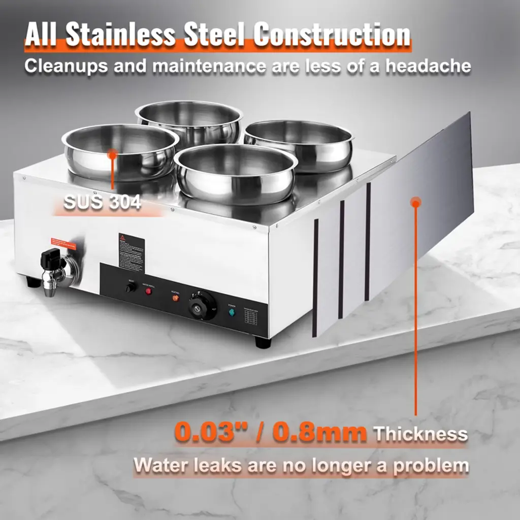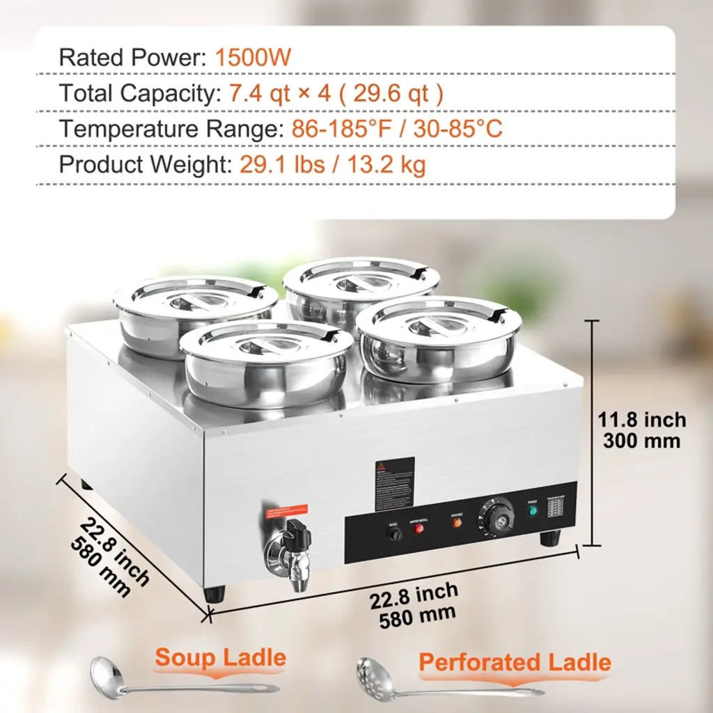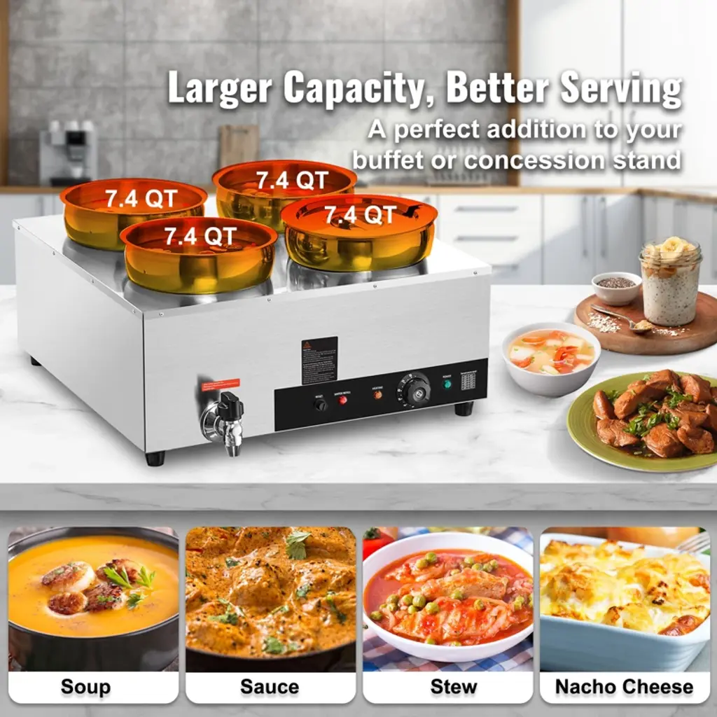 Feature: Fast Heating, Lasting Warmth: This impressive food warmer comes with a powerful 1500-watt stainless steel heating tube that rapidly warms up your food to maintain its hot and delicious flavors. You can adjust the temperature output to suit your preference, ranging from 86 - 185℉ / 30 - 85℃, thanks to the temperature controller. Robust Stainless Steel Build: Built with all stainless steel material, cleanups and maintenance are less of a headache. The stainless steel pot ensures added durability and peace of mind, while the thickened wall (0.03" / 0.7 mm) provides sturdiness and has a secure water seal. Additional Security: We have upgraded our food warmer with newly designed "Dry Burning Indicator" and "Reset Button". The dry-burning indicator function automatically stops heating the food when the temperature exceeds 248°F (120°C). To resume operations, simply refill the water and press the Reset Button. Details Made for You: The soup pot is thoughtfully designed with water level markers inside for effortless water maintenance. The container features a faucet for draining water after use, reducing the hassle of cleaning the machine’s interior. Additionally, two extra long-handled ladles are included, perfectly suited for deep pots. Includes Four 7.4Qt Soup Pots: Our commercial soup warmer comes equipped with Four 7.4Qt round pots with their respective lids, allowing you to serve different dishes simultaneously. Feel free to change up your menu from soups and sauces to stew, or even nacho cheese and chocolate. Package Content 1 x Soup Warmer 4 x Soup Pot 7.4qt 1 x Teflon Tape 1 x Drainage Faucet 1 x Soup Ladle 1 x Slotted Spoon