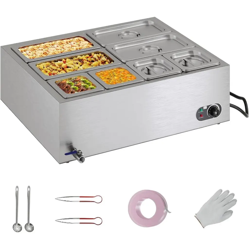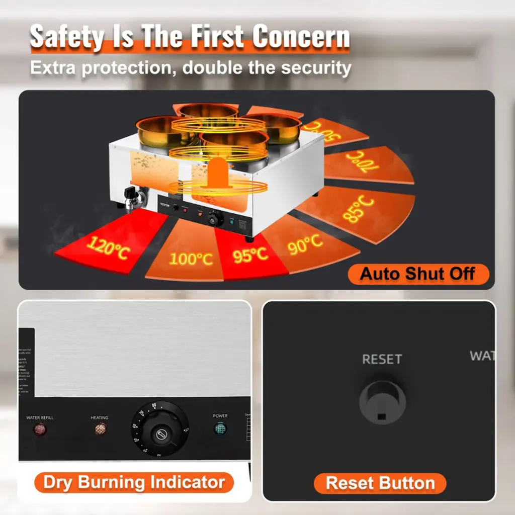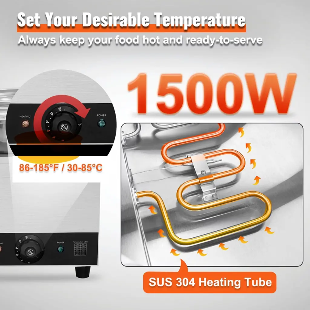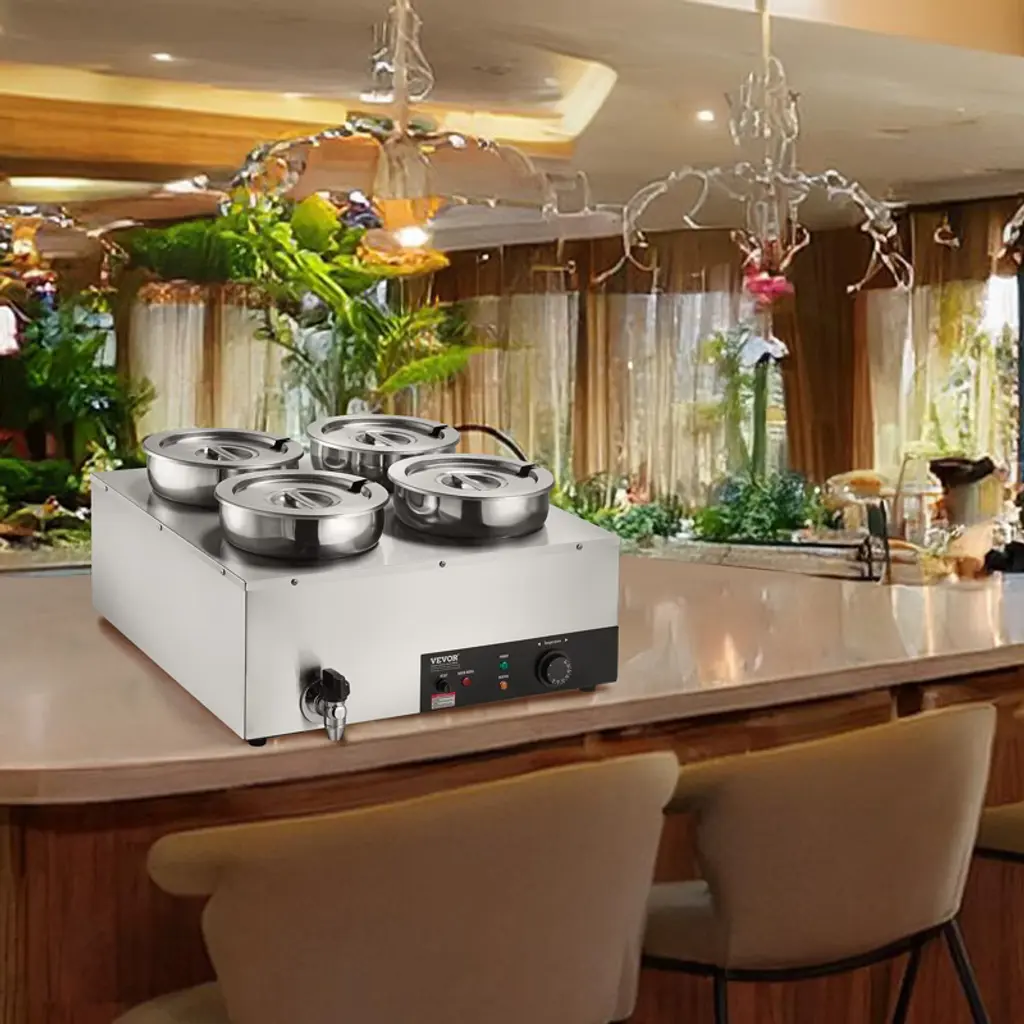 Feature: Fast Heating, Lasting Warmth: This impressive food warmer comes with a powerful 1500-watt stainless steel heating tube that rapidly warms up your food to maintain its hot and delicious flavors. You can adjust the temperature output to suit your preference, ranging from 86 - 185℉ / 30 - 85℃, thanks to the temperature controller. Robust Stainless Steel Build: Built with all stainless steel material, cleanups and maintenance are less of a headache. The stainless steel pot ensures added durability and peace of mind, while the thickened wall (0.03" / 0.7 mm) provides sturdiness and has a secure water seal. Additional Security: We have upgraded our food warmer with newly designed "Dry Burning Indicator" and "Reset Button". The dry-burning indicator function automatically stops heating the food when the temperature exceeds 248°F (120°C). To resume operations, simply refill the water and press the Reset Button. Details Made for You: The soup pot is thoughtfully designed with water level markers inside for effortless water maintenance. The container features a faucet for draining water after use, reducing the hassle of cleaning the machine’s interior. Additionally, two extra long-handled ladles are included, perfectly suited for deep pots. Includes Four 7.4Qt Soup Pots: Our commercial soup warmer comes equipped with Four 7.4Qt round pots with their respective lids, allowing you to serve different dishes simultaneously. Feel free to change up your menu from soups and sauces to stew, or even nacho cheese and chocolate. Package Content 1 x Soup Warmer 4 x Soup Pot 7.4qt 1 x Teflon Tape 1 x Drainage Faucet 1 x Soup Ladle 1 x Slotted Spoon
