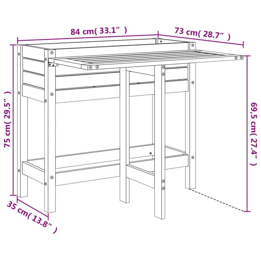 This vidaXL Garden Planter with Folding Tabletop is a fantastic upgrade for your outdoor areas, blending functionality with rural charm. Built from solid pine wood, it comes with a foldable tabletop, perfect for planting or serving. Ideal for any garden, balcony, or patio - just right for casual hangouts or some personal gardening time. Smart Folding Design: This planter's foldable tabletop not only works as a handy plant stand but also gives you a spot for tools, drinks, or snacks. Fold it down to save space when not in use and still look good doing it.Durable Material: Built from top-notch solid pine wood, this garden planter is ready for outdoor weather while adding a rustic feel. The matte finish keeps it looking great and lasting longer, giving your plants a steady home.Ideal for Various Settings: Whether it's your balcony, terrace, or patio, this planter fits right in. It blends beautifully with your garden decor while being a practical planting table, making gardening easy and fun for everyone.Efficient Planting Solution: With measurements of 33.1 in in length and 28.7 in in height, this planter offers plenty of space for lots of plants to thrive. Its nice texture and rustic look are not just good for the eyes but also practical for gardening.Outdoor Adaptability: Made explicitly for outdoor use, this planter works for loads of plant types and can change for seasonal plants or herbs. Protect and display your greenery to showcase nature's beauty right in your backyard.