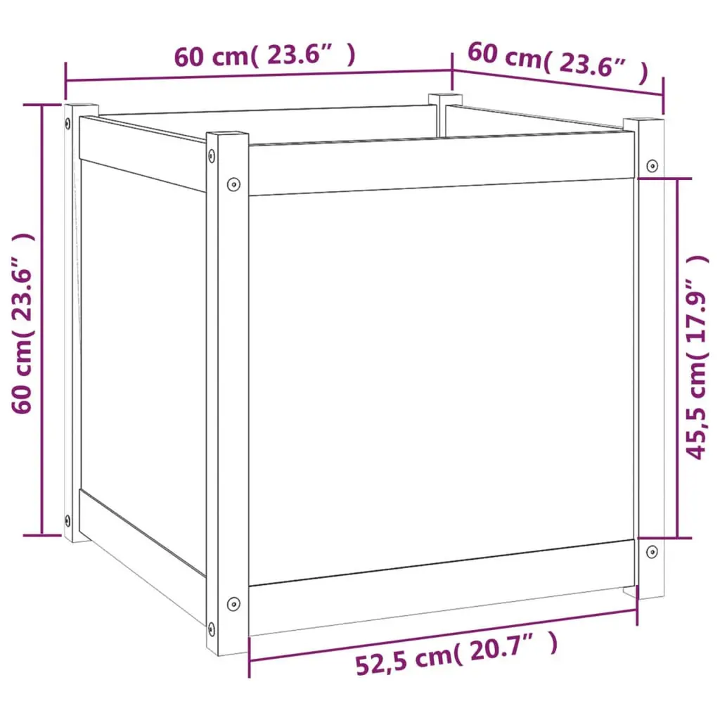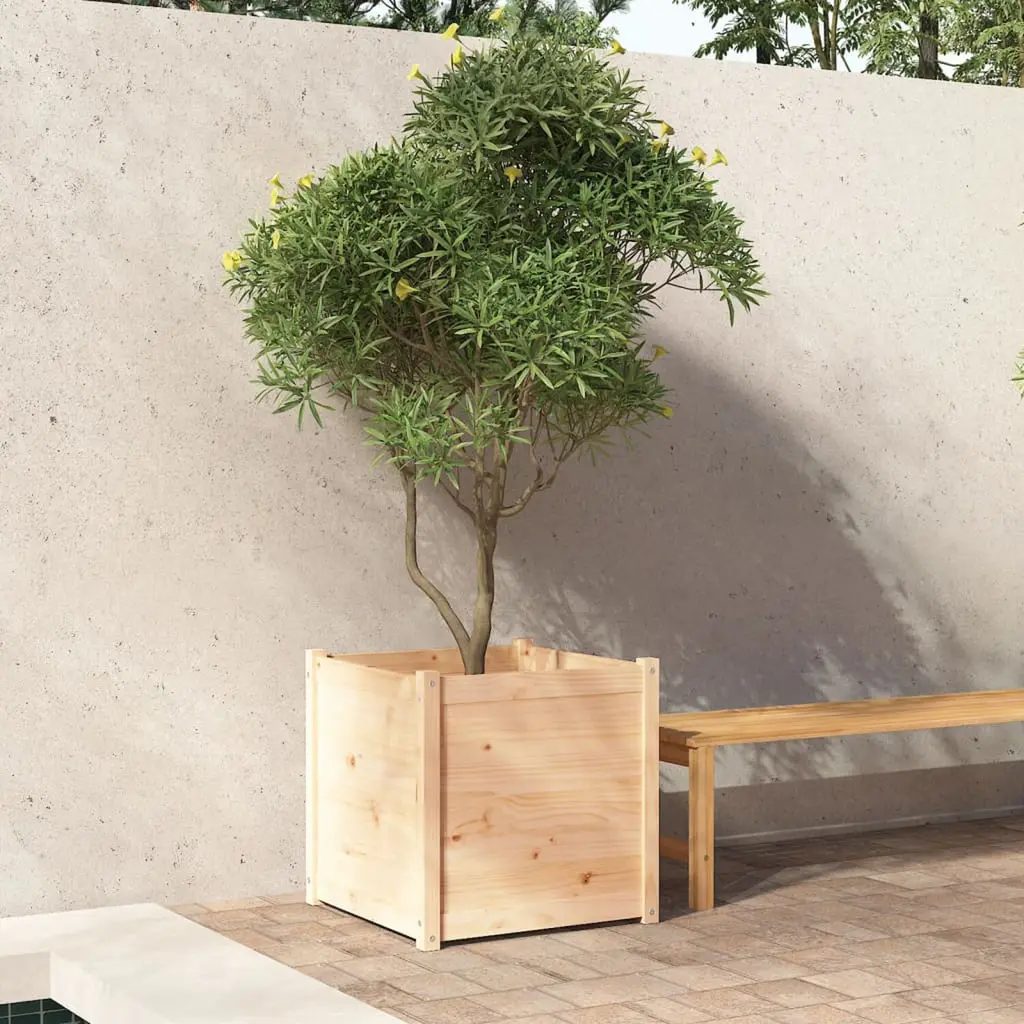 This garden planter is made from solid pinewood, offering a solid way to grow your favorite plants or flowers in a delightful outdoor area. With its spacious size, this square planter gives plenty of room for roots to grow, making it suitable for everything from fragrant herbs to bright flowers, effortlessly adding character to your balcony or garden. Durability: Crafted from solid pinewood, this planter is made to last against the elements, ensuring your investment pays off for many planting seasons.Weather-Resistant: The untreated surface allows for a natural weathered look while keeping its strength in changing climates.Versatile Use: Perfect for outdoors like patios or backyards, this planter can elevate any space, giving you a dedicated area to nurture your plants.Stylish Appearance: With its smooth finish and rustic charm, this planter serves both practical and decorative purposes in your garden.Great Size: Measuring 23.6 in on each side, this large planter is perfect for those wanting to create a vibrant display with many plants or a big centerpiece.