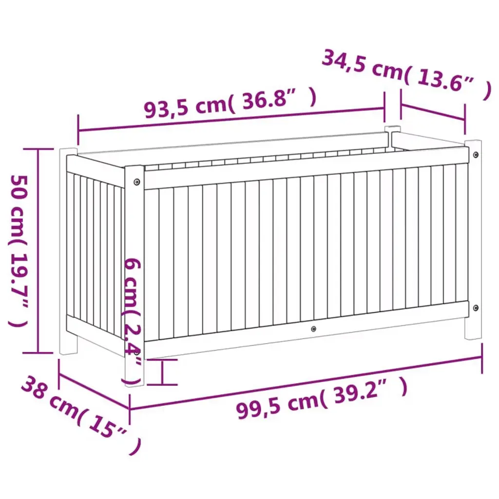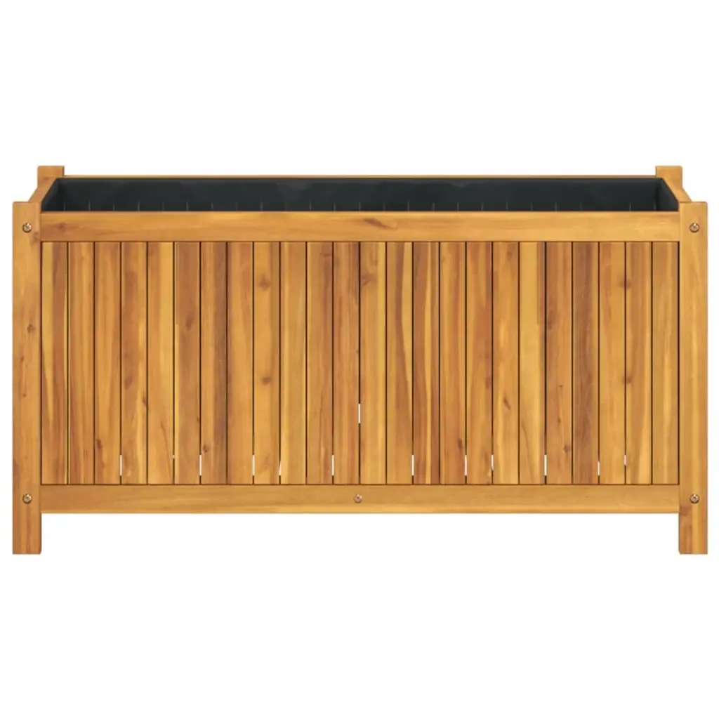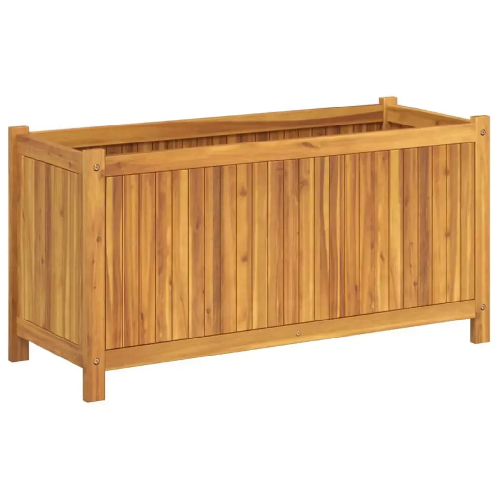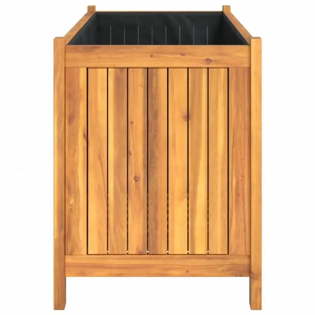 This wooden garden planter brings rustic charm and practical beauty to any outdoor space. Crafted from solid acacia wood with a warm, natural finish, it’s designed to showcase your favorite flowers, herbs, or greenery while standing up to the elements. Its sturdy construction and decorative vertical inlays make it a standout centerpiece for patios, balconies, gardens, or terraces.Key Features• Made from durable solid acacia wood with a rich honey-brown finish• Rectangular shape with decorative vertical slatted inlays for a classic look• Includes a black waterproof liner for easy planting and maintenance• Raised on short legs for improved drainage and stability• Suitable for both indoor and outdoor useSpacious and Functional Design• Overall dimensions: 15.0" W x 39.2" L x 19.7" H• Ample planting space for a variety of flowers, herbs, or small shrubs• Integrated drainage ensures healthy plant growthEasy Care and Assembly• Simple to clean—just wipe with a damp cloth• Assembly required; all hardware included• SKU: 366441Perfect for Versatile Outdoor Settings• Ideal for gardens, patios, balconies, or terraces• Complements a wide range of outdoor décor stylesEnhance your outdoor living area with this elegant and durable garden planter, designed to provide years of enjoyment and reliable performance.