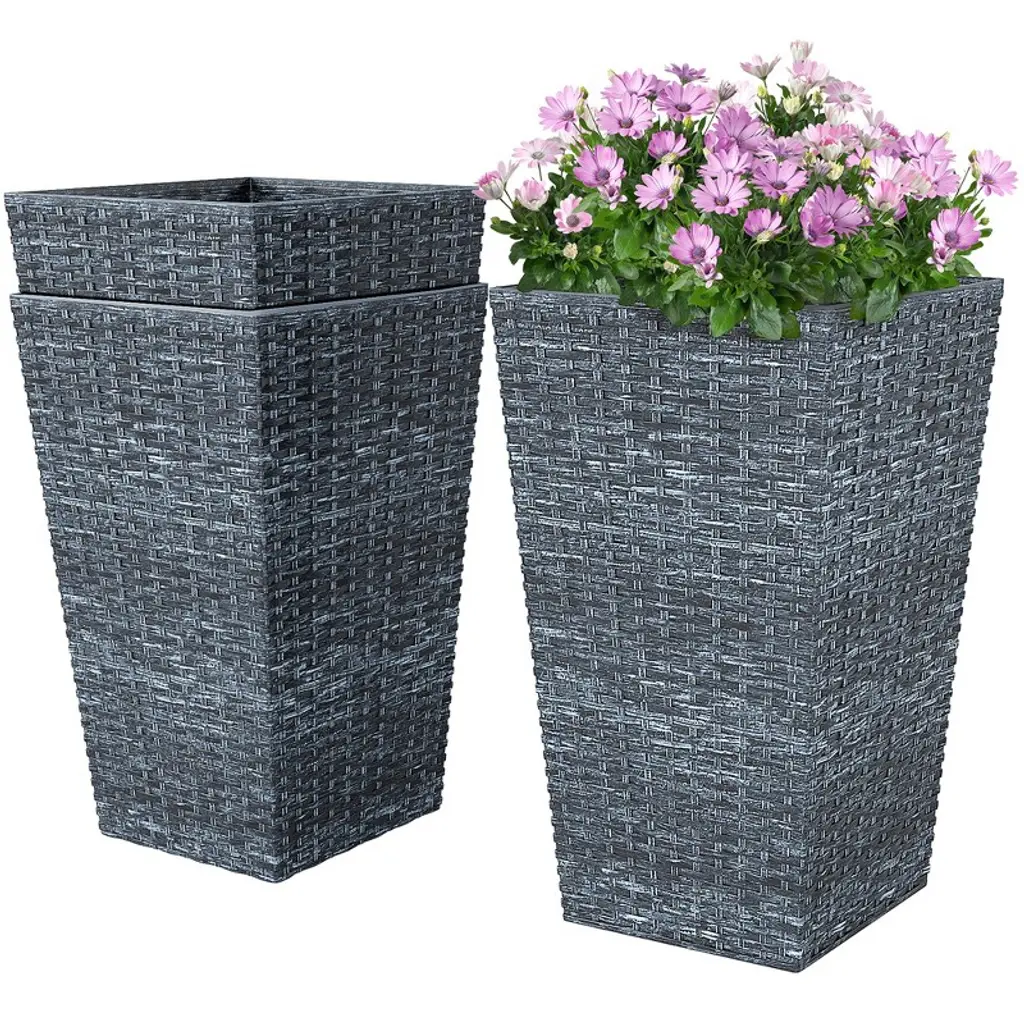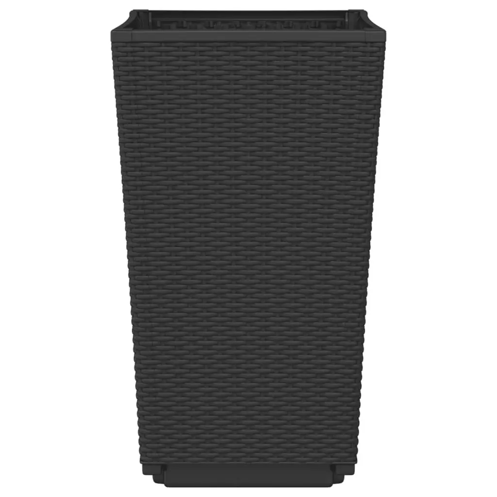 This set of planters brightens up your outdoor area with their modern design, perfect for growing flowers, herbs, or veggies. Made from sturdy polypropylene, these black planters combine style with practicality, making them a top pick for anyone looking to add some greenery to their balcony, patio, or terrace while keeping things classy. Durable Construction: Each planter is made from high-grade polypropylene, built to handle outdoor conditions and keep looking good. They resist wear and tear, giving you planters that last season after season. Modern Textured Finish: The rattan-like finish adds sophistication, blending well with outdoor decor. Its texture not only looks nice but also adds grip and gives a visual starting point for any garden display. Great for Planting: With dimensions of 12.8 in x 12.8 in x 22.4 in, these planters have ample space for planting, whether you're growing herbs or colorful flowers. The generous capacity supports healthy roots, leading to thriving plants. Lightweight & Versatile: Easy to move, so you can switch things up in your garden or on the patio without hassle. Any gardening enthusiast loves the ability to change up layouts easily. Perfect for Outdoor Use: Made specifically for outdoor settings, these planters withstand sun and rain while keeping their integrity. Perfect for elevating balconies, patios, or terraces.