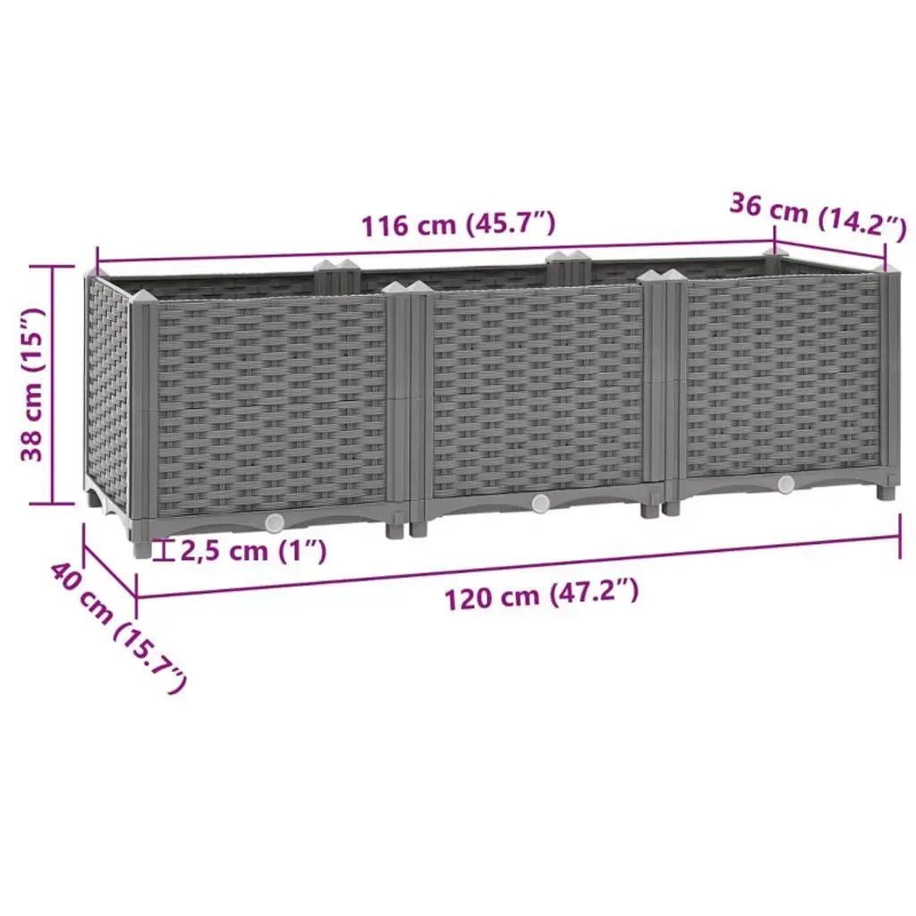 Bring modern style and practical gardening to your outdoor space with this raised bed planter, crafted from durable polypropylene with a contemporary rattan-like texture. Designed for versatility and easy maintenance, this planter is ideal for growing flowers, herbs, or vegetables in your garden, patio, or balcony. Key Features • Durable polypropylene construction for long-lasting outdoor use • Weather-resistant and easy to clean • Modern woven rattan-style design adds a stylish touch • Raised design helps reduce strain on your back and knees • Suitable for a variety of plants, including flowers, herbs, and vegetables Available Sizes • 63" x 15.7" x 15" • 47.2" x 15.7" x 15" • 15.7" x 15.7" x 9.1" • 31.5" x 15.7" x 9.1" • 47.2" x 15.7" x 9.1" • 63" x 15.7" x 9.1" • 15.7" x 15.7" x 15" • 31.5" x 15.7" x 15" • 15.7" x 15.7" x 28" • 31.5" x 31.5" x 9.1" • 31.5" x 31.5" x (9.1"-15") • 31.5" x 31.5" x 15" • 31.5" x 15.7" x 28" • 47.2" x 15.7" x 28" • 63" x 15.7" x 28" Available Colors • Black • Blue grey • Brown • Light gray • White Why Choose a Raised Bed Planter? • Improves soil drainage and aeration • Helps prevent weed growth • Keeps your garden organized and tidy • Makes gardening accessible for all ages Upgrade your outdoor gardening with this stylish and functional raised bed planter, available in multiple sizes and colors to suit your space and style.