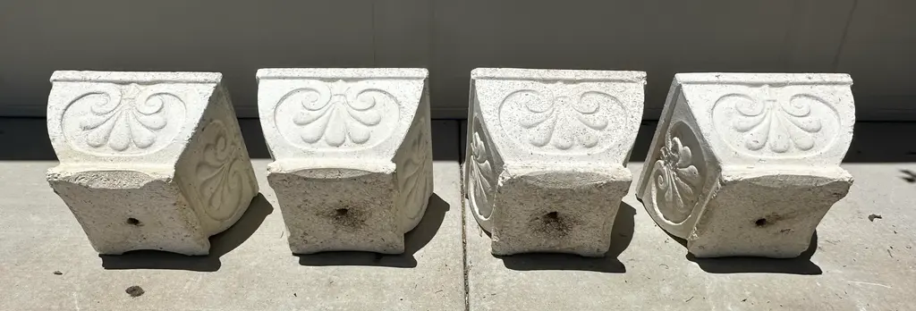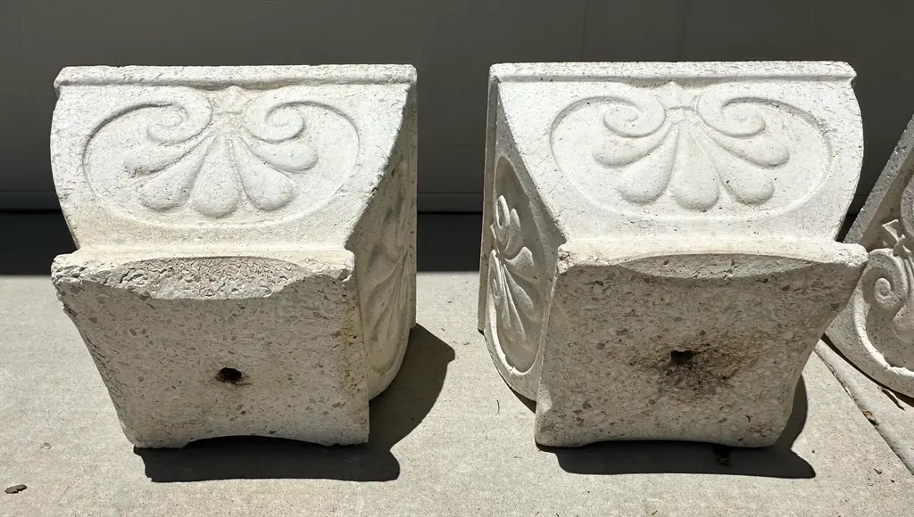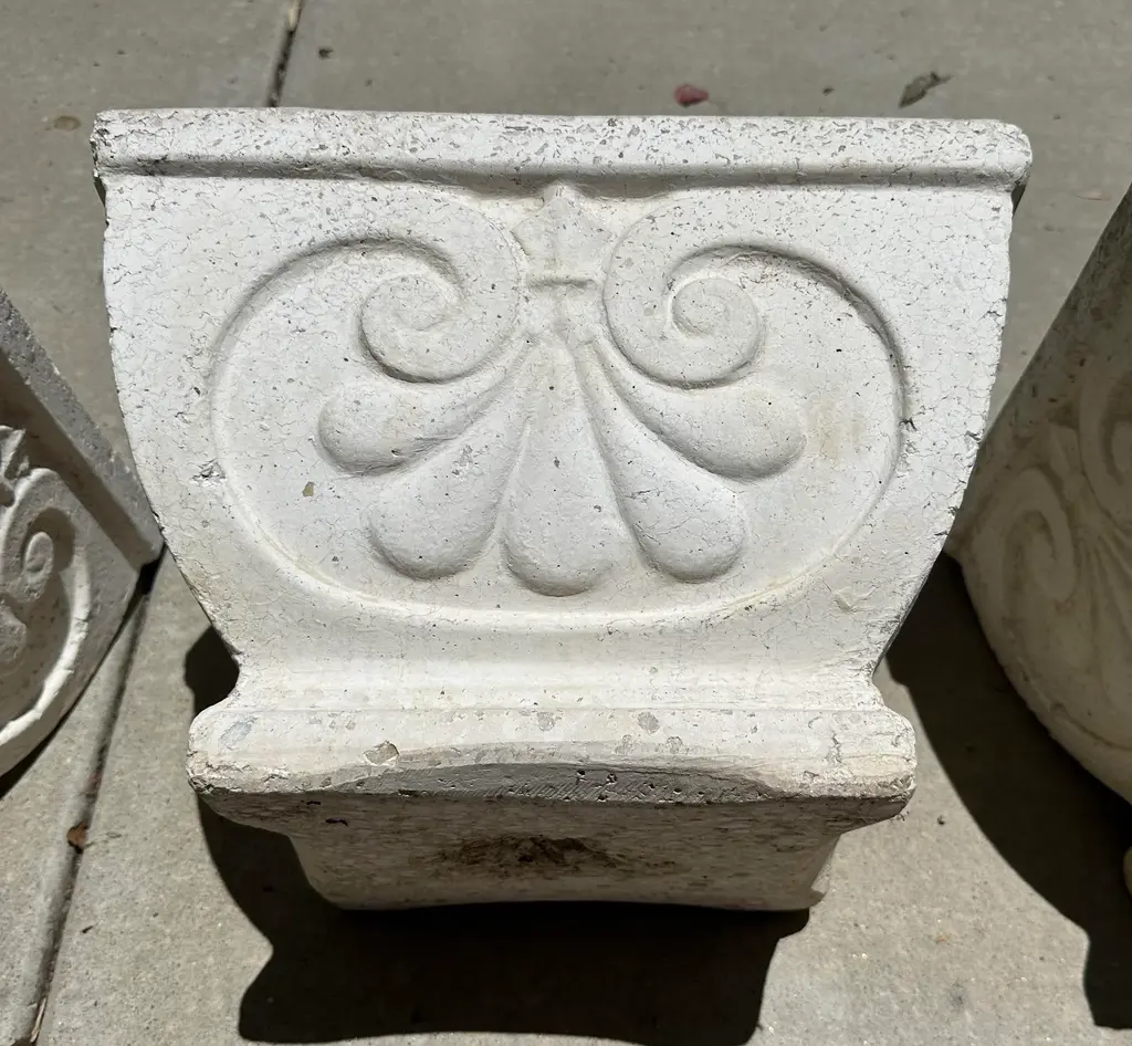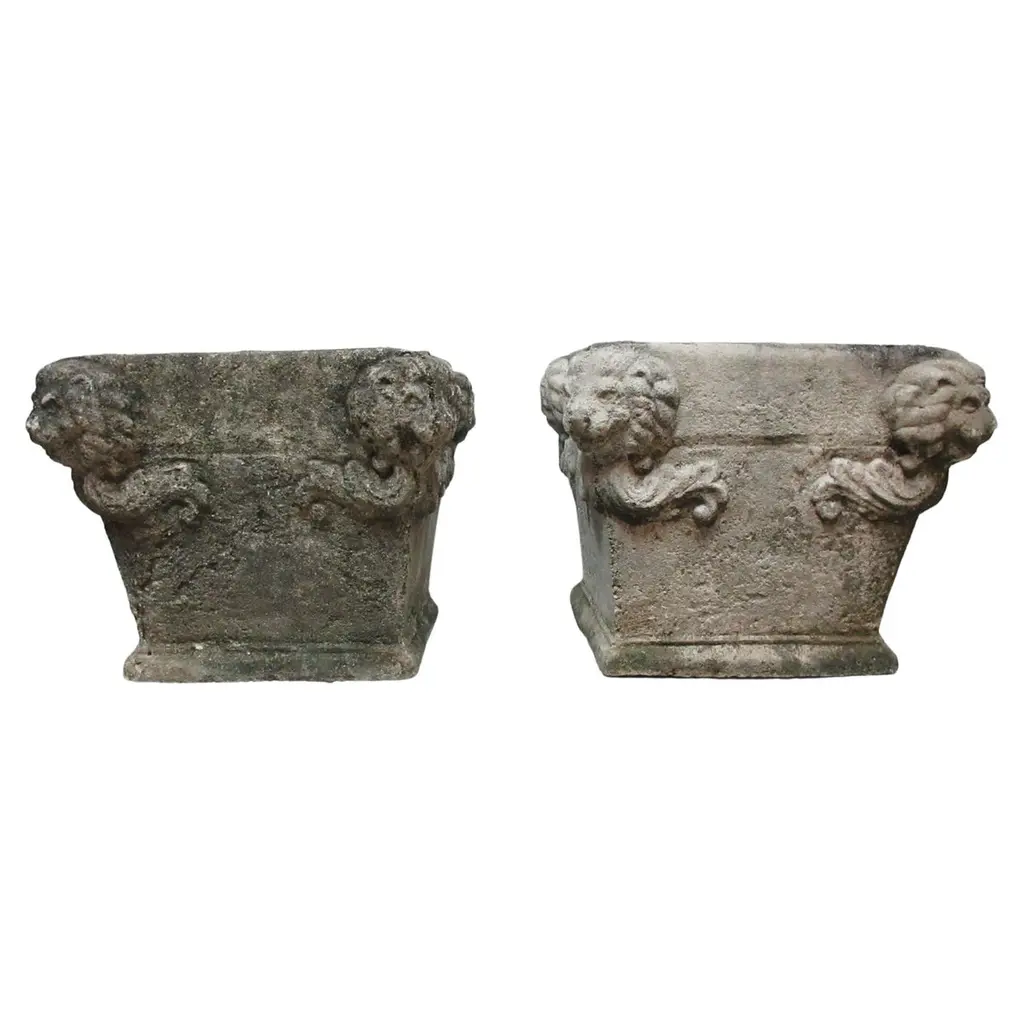 Pair of Vintage 1950s Fleur de lis Square Stone Aggregate Concrete Garden Planters. These Spectacular Custom made Stone Aggregate Planters are absolutely stunning. The beautiful stones in the concrete make the planters shimmer and shine, truly one of a kind. The exquisite fleur de lis design is on all four sides. Planters can be used both indoors & or outdoors. These amazing Planters will make a great addition to any garden, patio, or Indoor/outdoor setting. Planters are being sold in Pairs (2 to a set) 5 sets available(Total of 10 available) Dimensions 10 1/2” Height 14" Width 14" Depth 10 1/2" Square Base