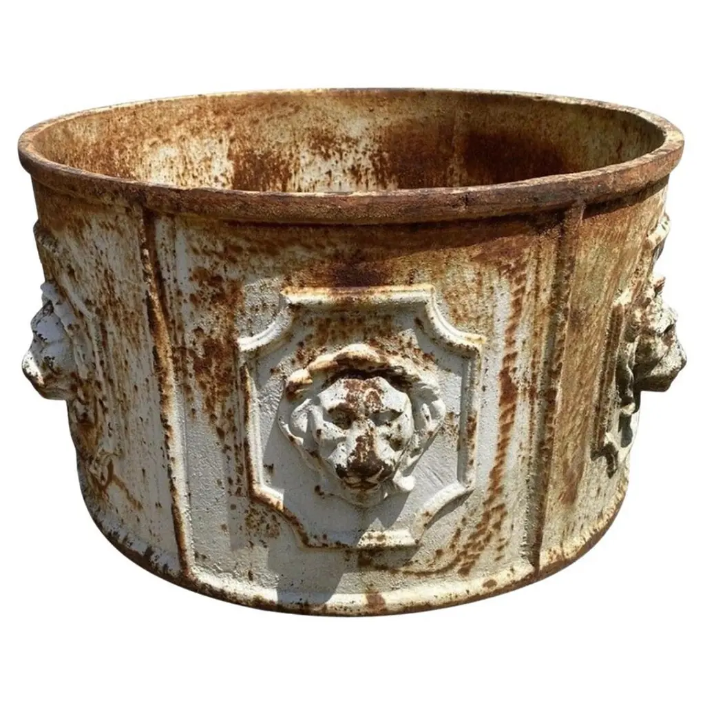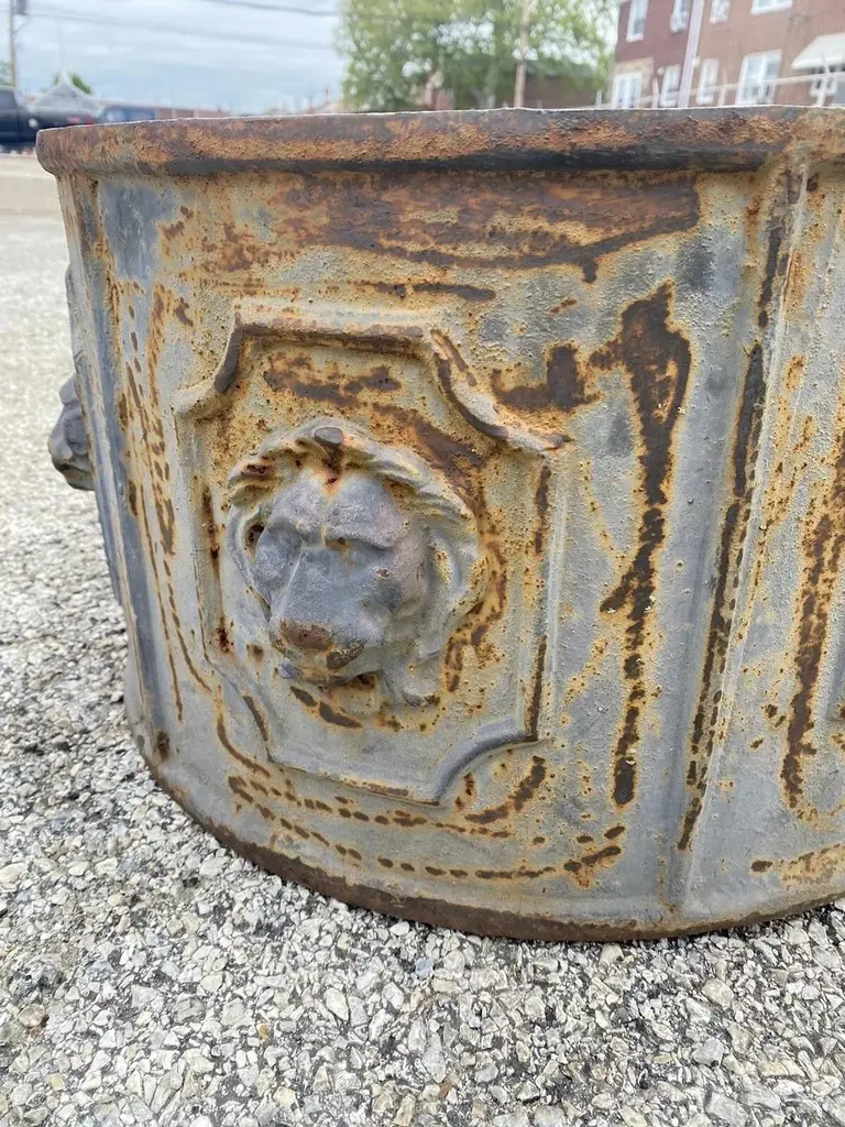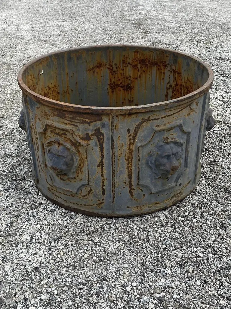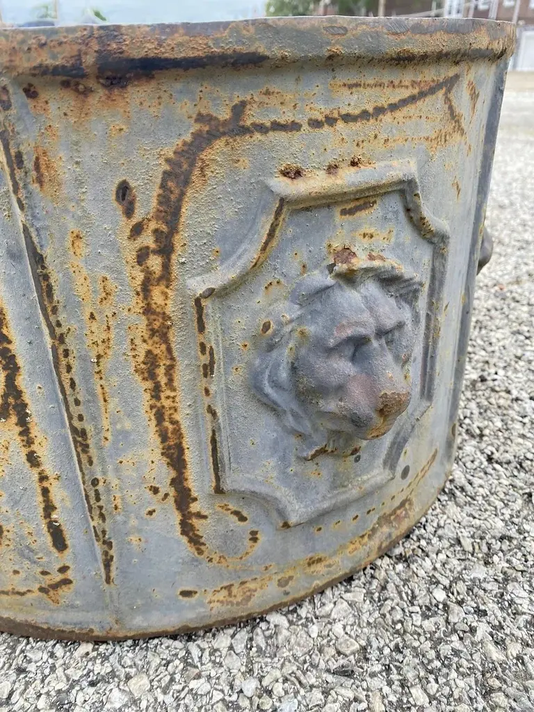 Vintage English Regency Cast Iron Round Lion Heads Gray Planter