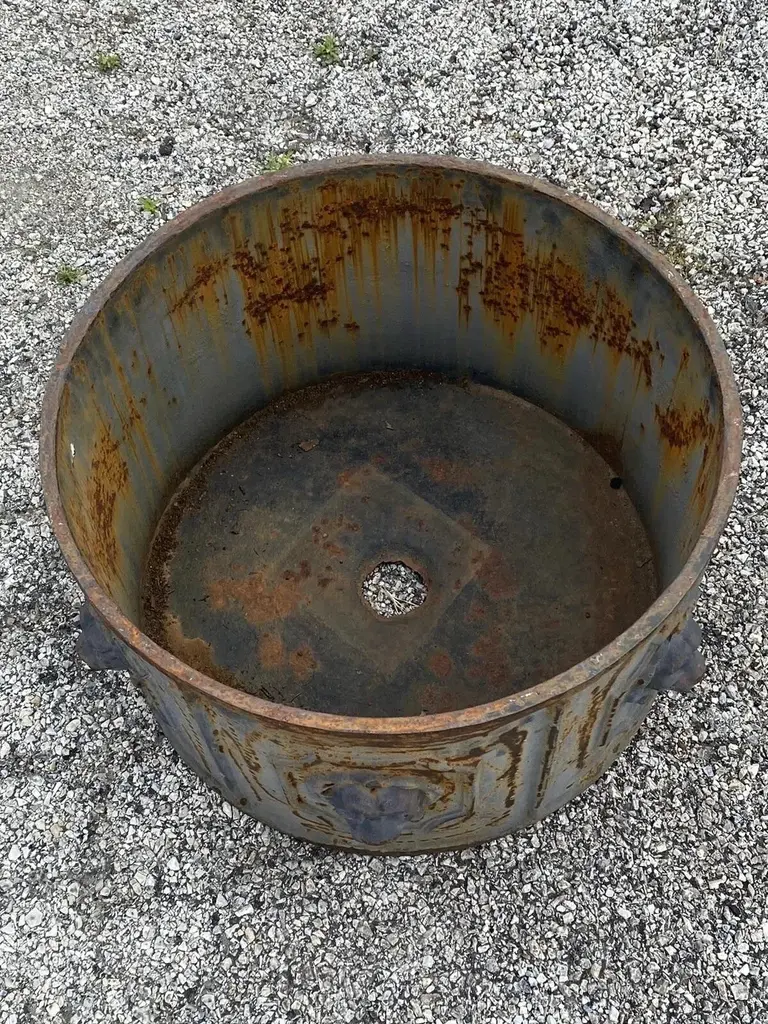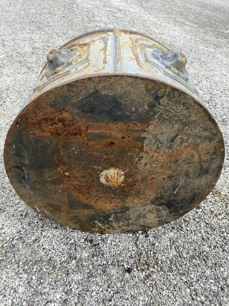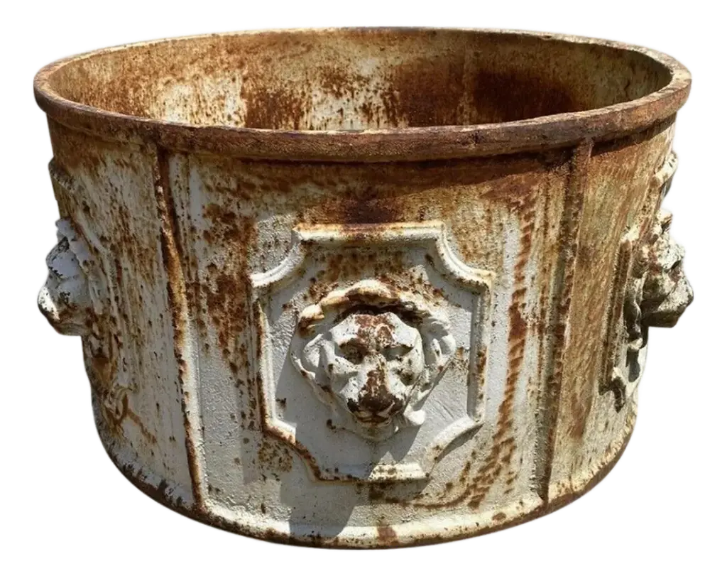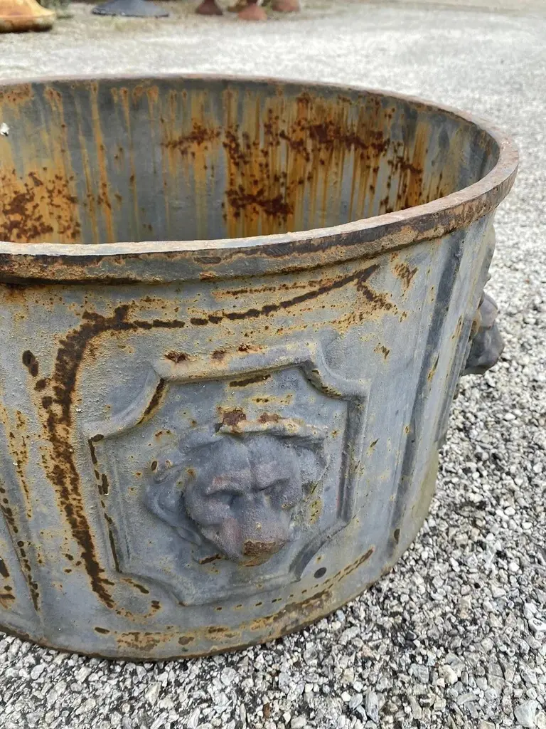 Vintage English Regency Cast Iron Round Lion Heads Gray Planter