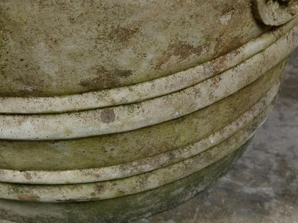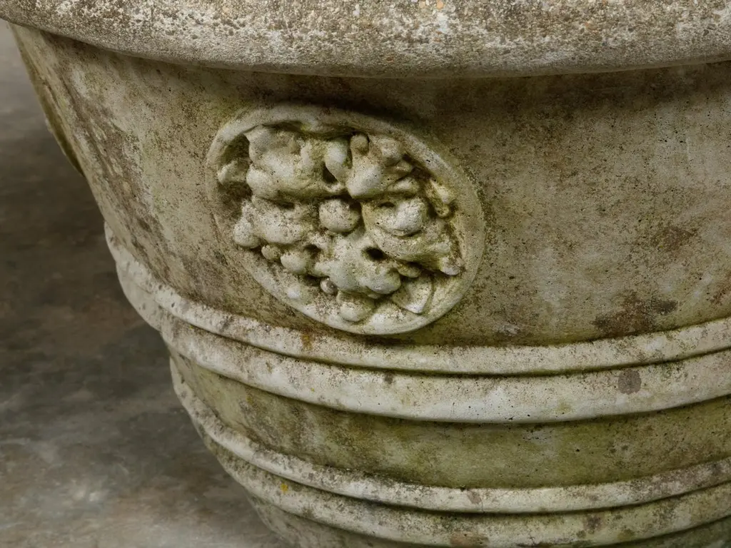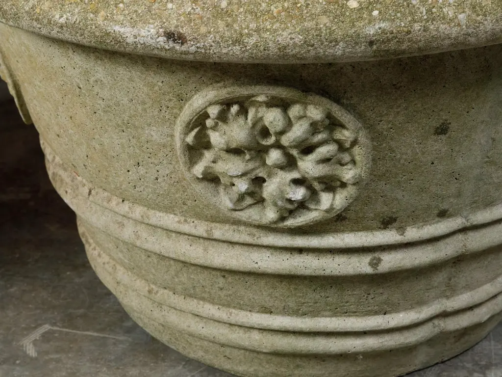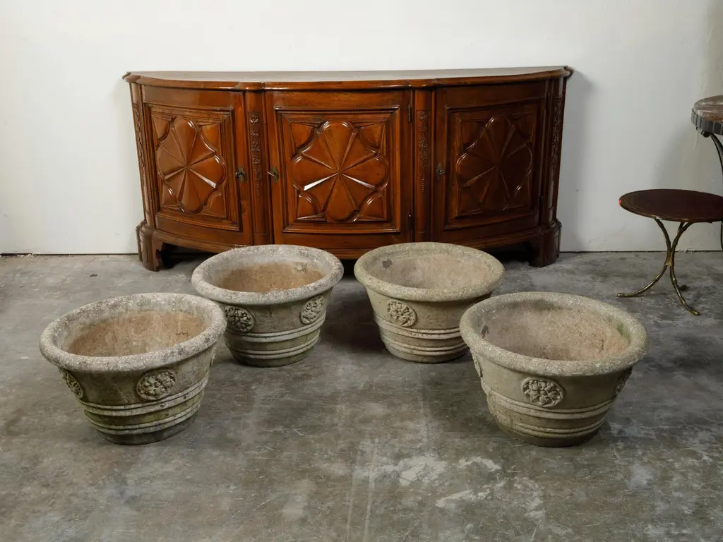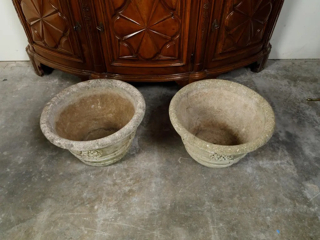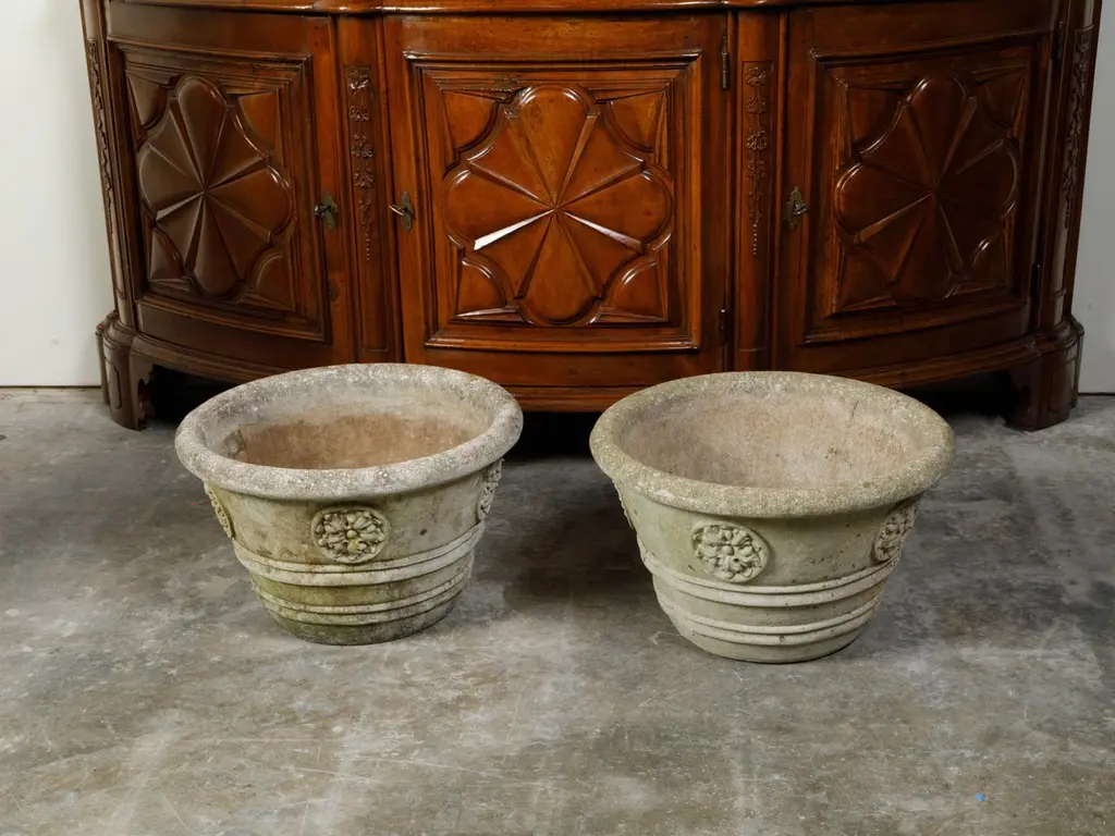 A pair of vintage cast stone planters from the mid 20th century, with rosette motifs. We have two pairs available, priced and sold $3,750 per pair. Created during the Midcentury period, each of this pair of planters features a circular tapering cast stone body adorned with rosette motifs in its upper section and concentric rings in the lower part. Boasting a nicely weathered patina revealing their life outdoors, this pair of cast stone planters circa 1950 will make for an elegant addition to any garden!