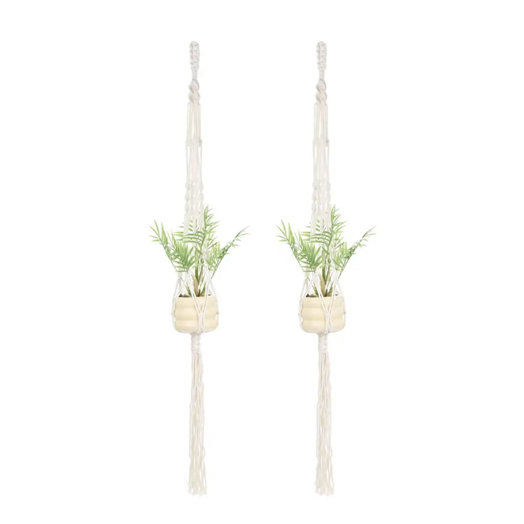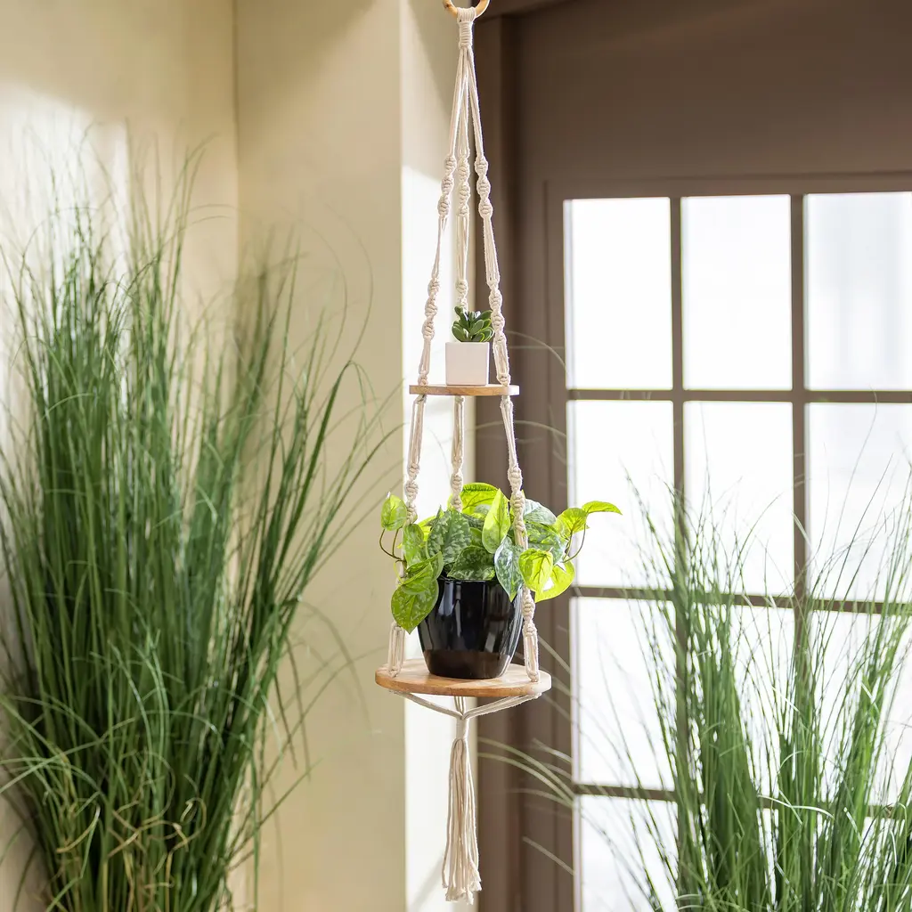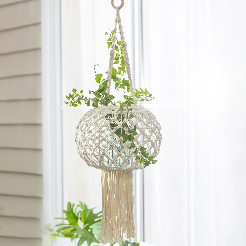 Elevate plant displays with this Macrame and Metal Hanging Planter. Perfect for displaying houseplants, florals and more, this planter features a natural look which will enhance any greenery. This contemporary-style planter shows off the natural beauty of any plant with a finely crafted design. The planter is secured in the middle of the piece and is encircled by two rings with trailing macrame and beaded details for a fresh look.