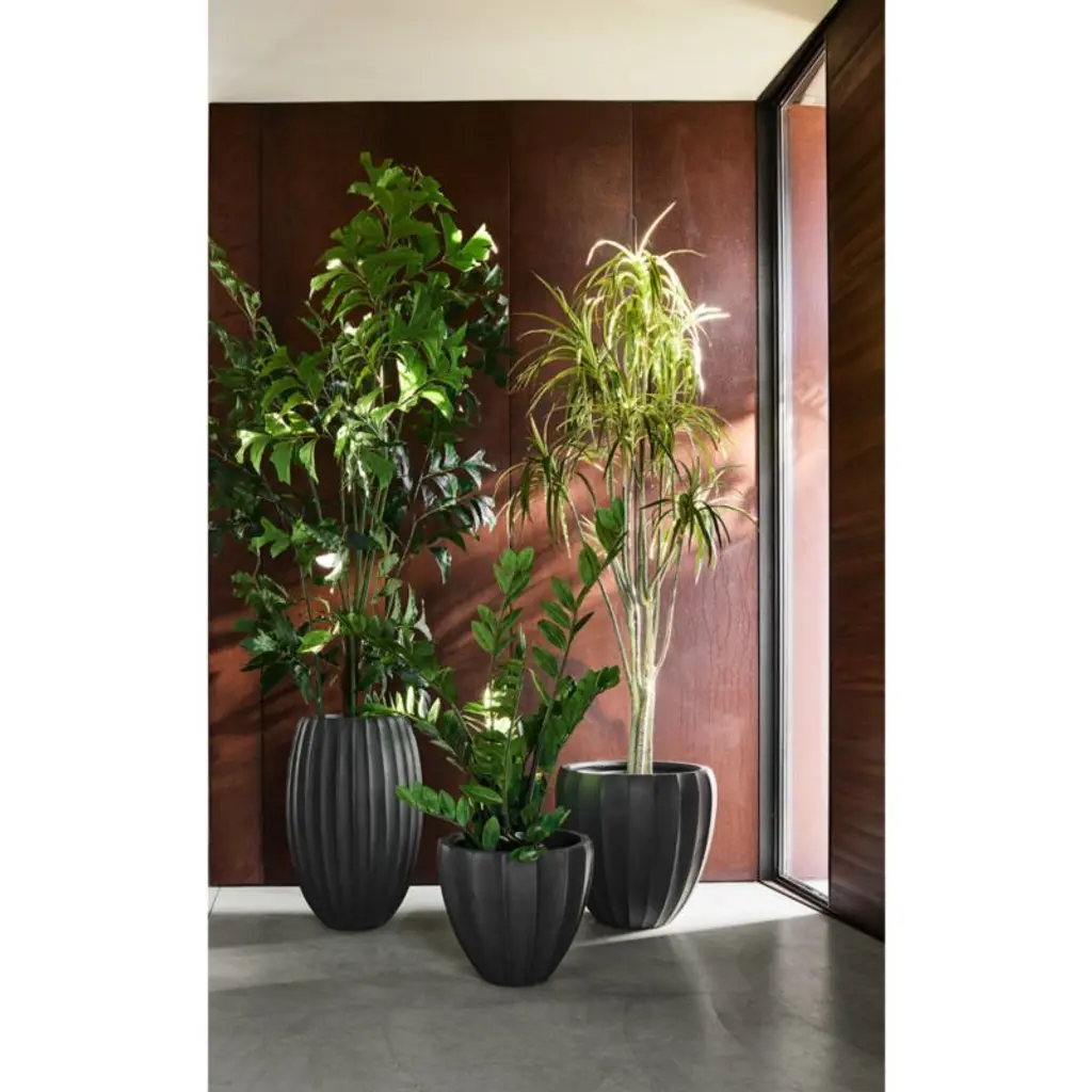 The organic ridges and curves of this planter evoke the fascinating silhouettes of gourds, paper lanterns and seed pods. Finished in black, the small planter has an architectural presence on porches, patios and other outdoor spaceswe especially love using it to pot seasonal flowers or decorative grasses. Create a striking botanical display by grouping the stone and cement planter with the other black and white pieces in our exclusive Warren collection.