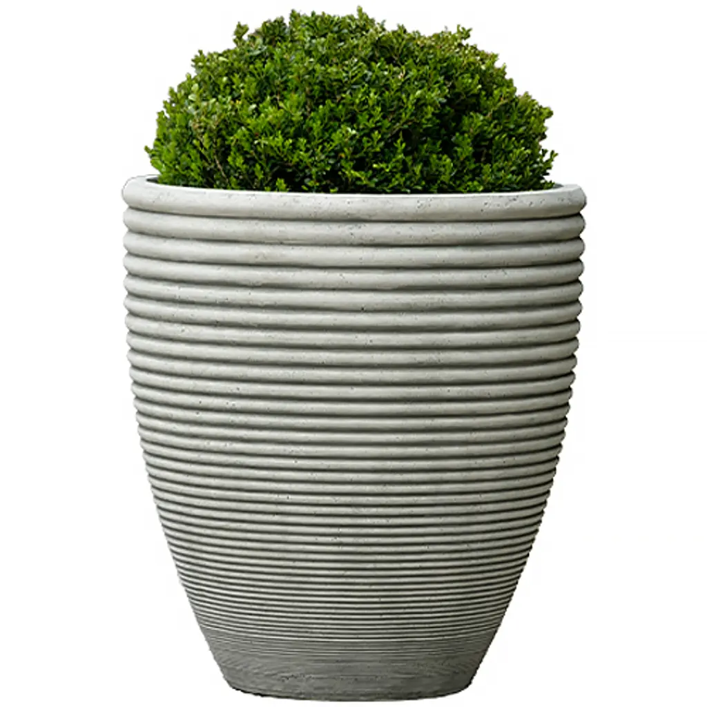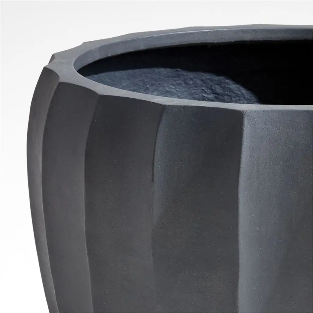 The organic ridges and curves of this planter evoke the fascinating silhouettes of gourds, paper lanterns and seed pods. Finished in black, the wide planter has an architectural presence on porches, patios and other outdoor spaceswe especially love using it to house a tree or lush tropical plant. Create a striking botanical display by grouping the medium stone and cement planter with the other black and white pieces in our exclusive Warren collection.