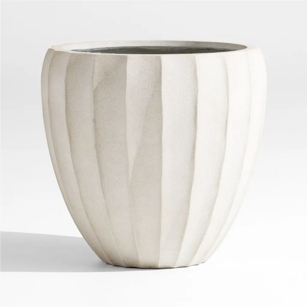 The organic ridges and curves of this planter evoke the fascinating silhouettes of gourds, paper lanterns and seed pods. Finished in warm white, the wide planter has an architectural presence on porches, patios and other outdoor spaceswe especially love using it to house a tree or lush tropical plant. Create a striking botanical display by grouping the medium stone and cement planter with the other black and white pieces in our exclusive Warren collection.