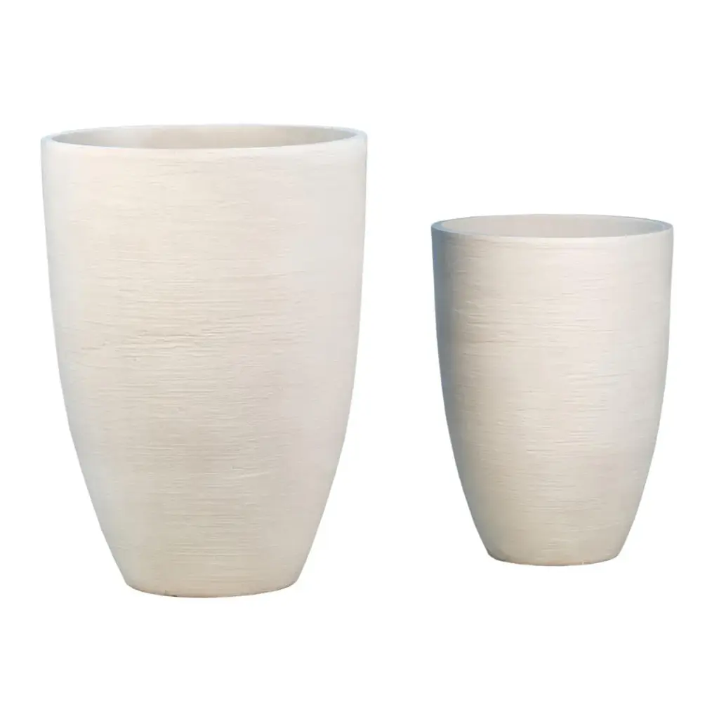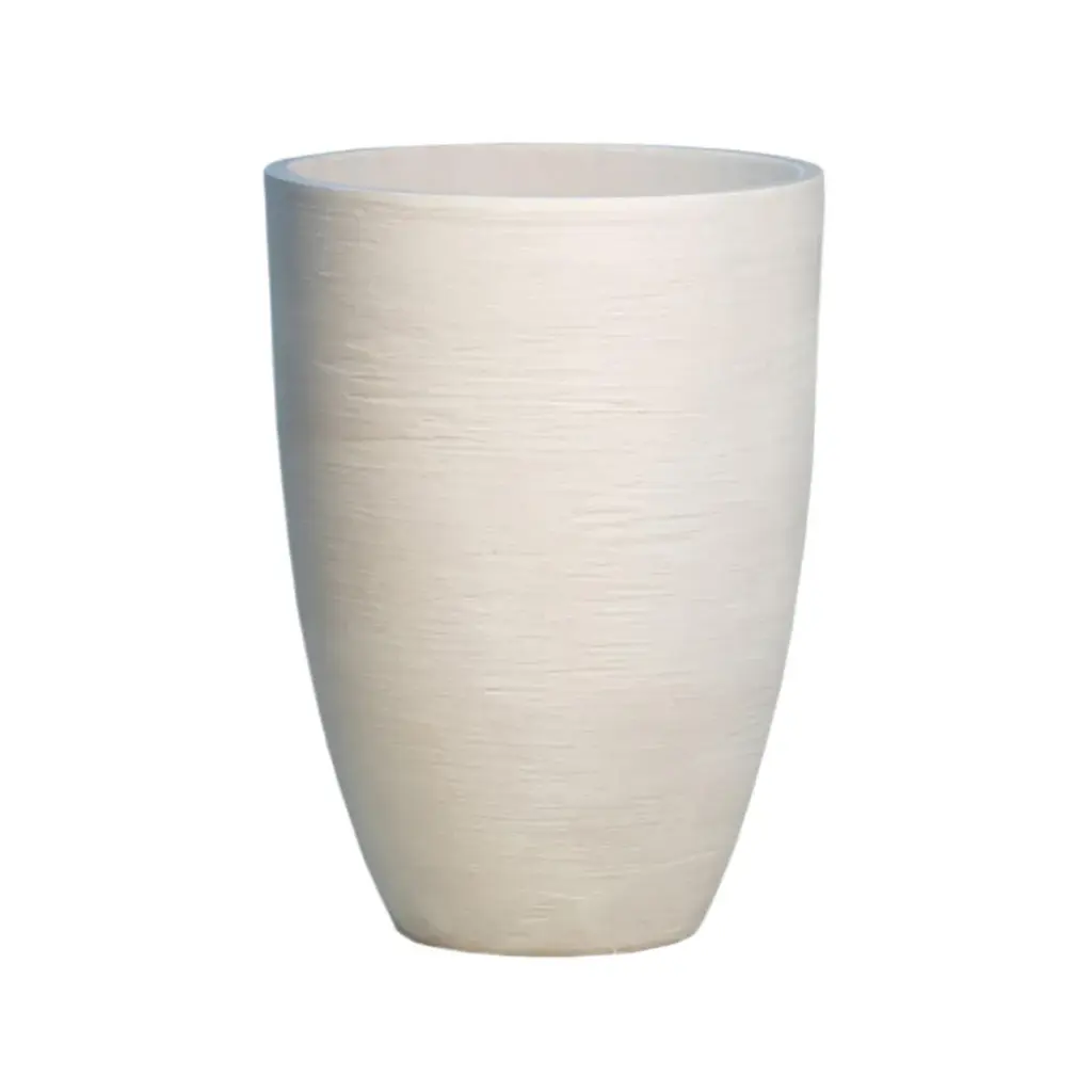 Modern outdoor planter with the look of modern cement without the weight. Easy to use and move light weight resin composite material in beautiful fresh white. Drainage hole is included. Opening at top measures 14". Each pot may in exact finish, natural textures, and slight imperfections. Each sold individually.