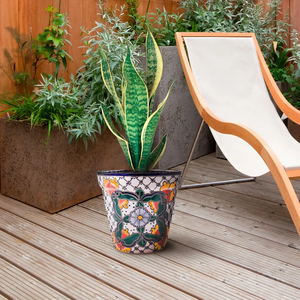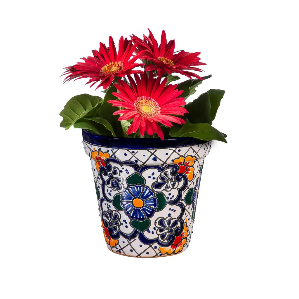 Bring quality craftsmanship to your home with this Talavera planter, handmade by skilled artisans in Mexico. This planter features a gorgeous floral design with bright colors and a raised texture that will delight your senses. The glaze coating is applied by hand and seals in the intricate artistry and gives the planter a wonderful shine, making it safe for display indoors or out. Feature this planter in your living room, entryway, porch, deck and more. The hand-painted colors perfectly complement greenery, florals or neutral spaces in need of a colorful upgrade. Bottom drainage hole included.