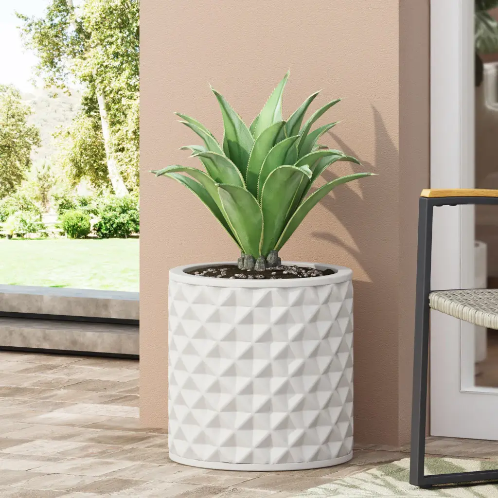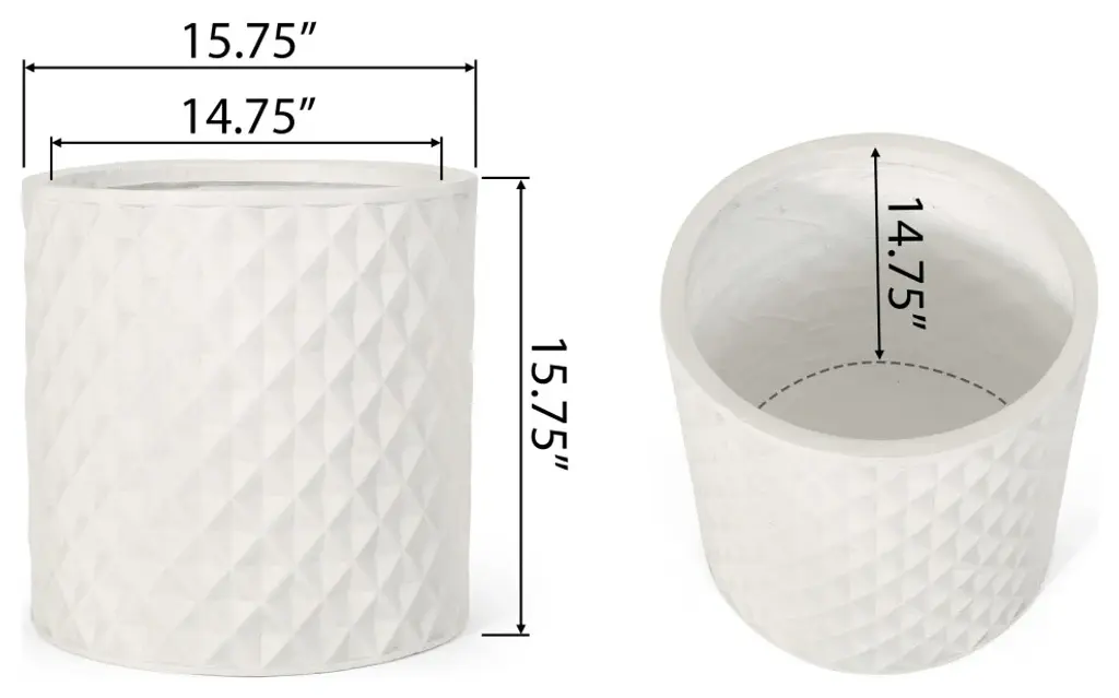Tie your outdoor decor together with seamless grace. From its stunning diamond pattern to its lightweight concrete structure, our planter will instantly enhance your patio or backyard space with style. This accessory offers a durable construction to ensure that your plant has a stable home to grow. Complemented with a natural stone finish, this planter offers a classic look to your garden or porch. Perfectly crafted to hold your plants, this piece is the perfect accessory for your green thumb.• • A TOUCH OF PERSONALITY: Bring your outdoor area to life with our delightful cast stone planter. With sleek aesthetics, this accessory will not only enliven your backyard or patio space but also provides space to grow plants.• • CAST STONE: Constructed with lightweight concrete, this planter offers a natural stone look with a debossed diamond pattern that also has a highly durable structure and is resistant to outdoor elements.• • DRAINAGE HOLE INCLUDED: Each planter includes a drainage hole at the bottom so that excess water will not pool. This prevents water from becoming stagnant, which promotes healthier roots.• • THREE SIZES: Choose among three different sizes for an accessory that is perfect for you and your outdoor space. The large planter is 15.75"W x 15.75"D x 15.75"H, the medium planter is 13.00"W x 13.00"D x 13.00"H, and the small planter is 10.00"W x 10.00"D x 10.00"H. You will love how much your space can transform with the simple addition of this accessory.• • NO ASSEMBLY: This planter comes ready to use straight out of the box. No assembly is required.Includes: One (1) Planter• Material: Lightweight Concrete• Finish: Antique White• No Assembly Required• Large Dimensions: 15.75 inches deep x 15.75 inches wide x 15.75 inches high• Large Inner Dimensions: 14.75 inches deep x 14.75 inches wide x 14.75 inches high• Medium Dimensions: 13.00 inches deep x 13.00 inches wide x 13.00 inches high• Medium Inner Dimensions: 12.00 inches deep x 12.00 inches wide x 12.00 inches high• Small Dimensions: 10.00 inches deep x 10.00 inches wide x 10.00 inches high• Small Inner Dimensions: 9.00 inches deep x 9.00 inches wide x 9.00 inches high