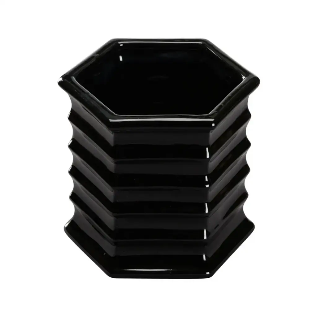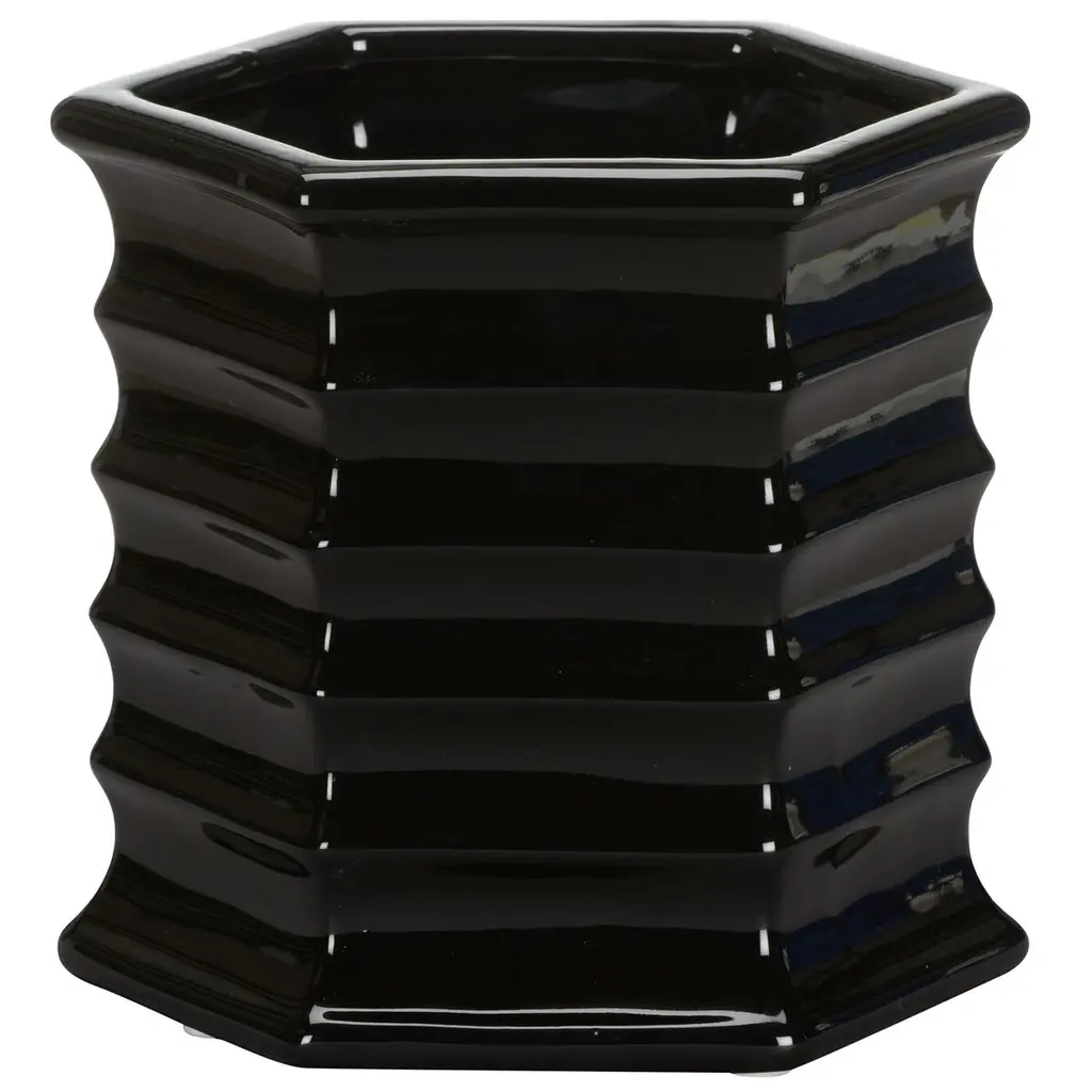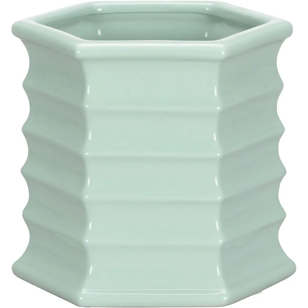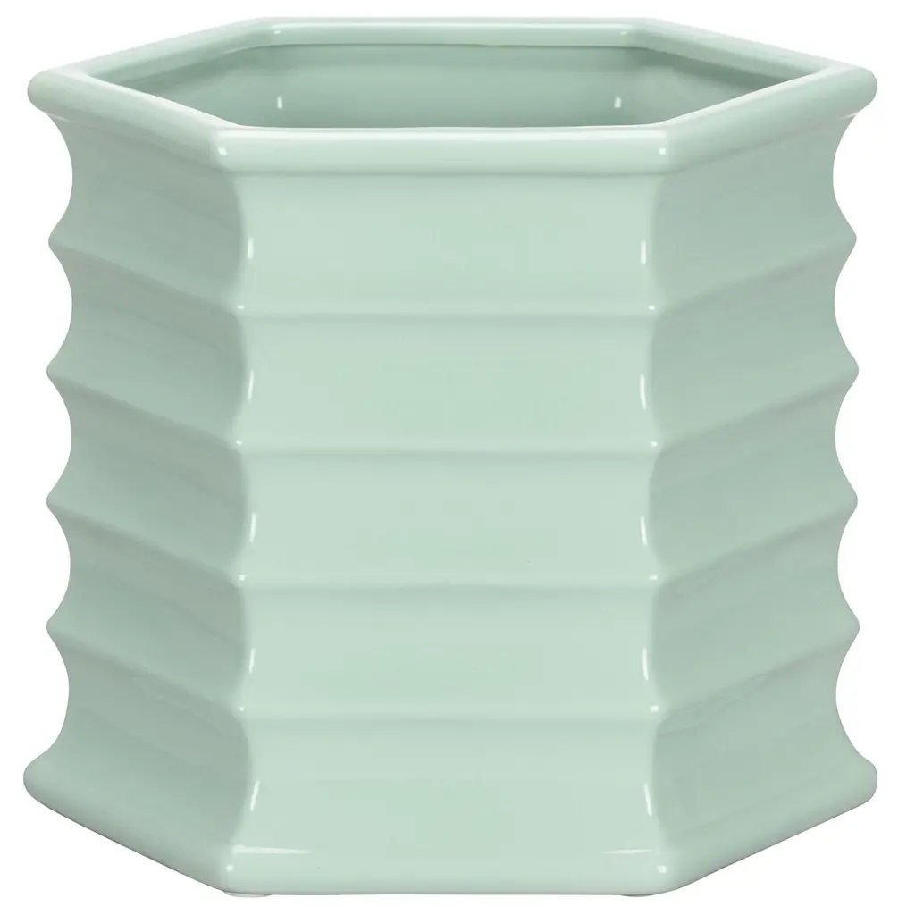 The Willow Planter features a ceramic glazed finish with a unique hexagonal body and inverted scalloped edges. Available in various sizes and colors, it's a stylish choice for showcasing your plants. Designed by Elizabeth Wicker.