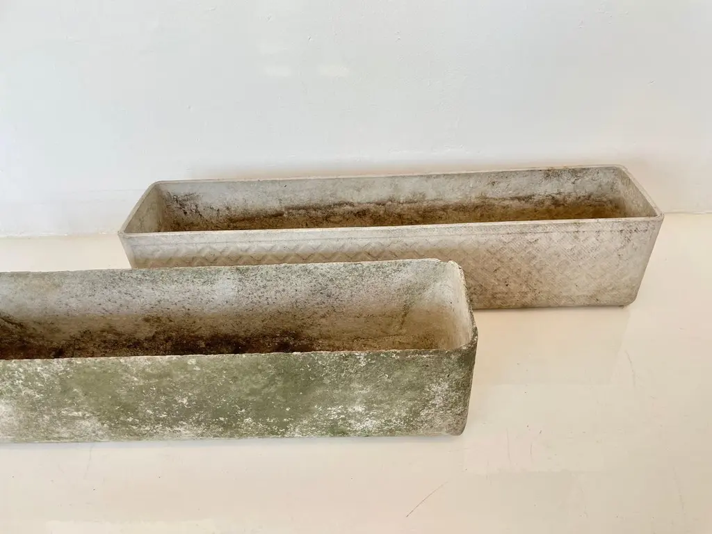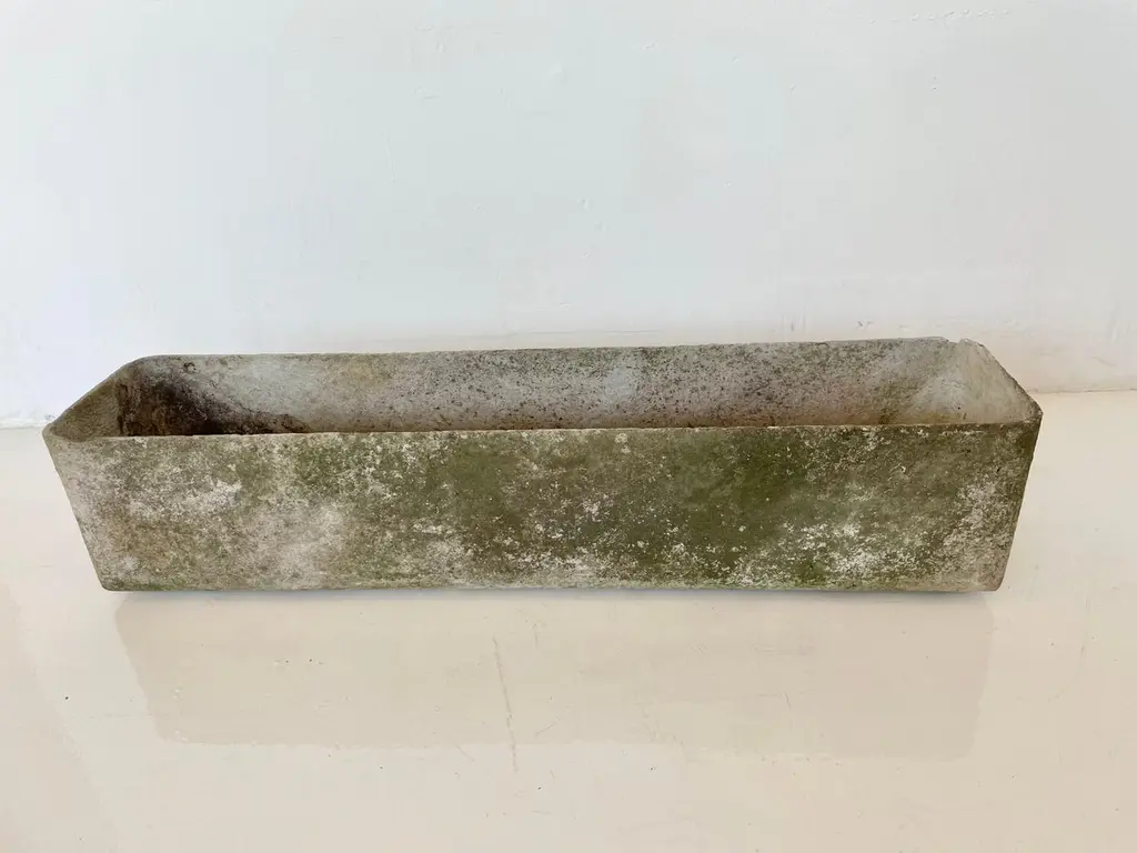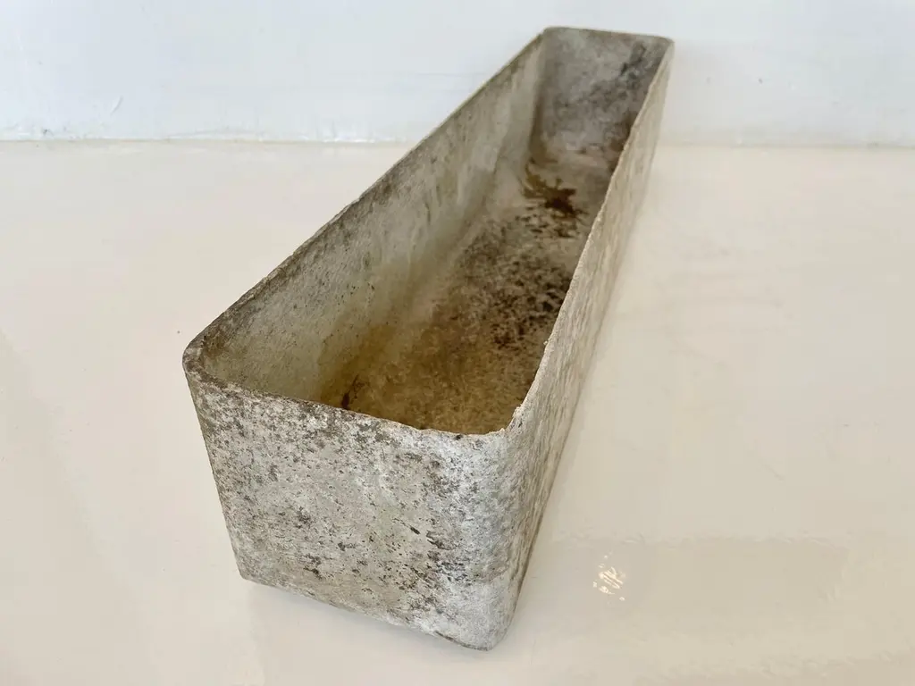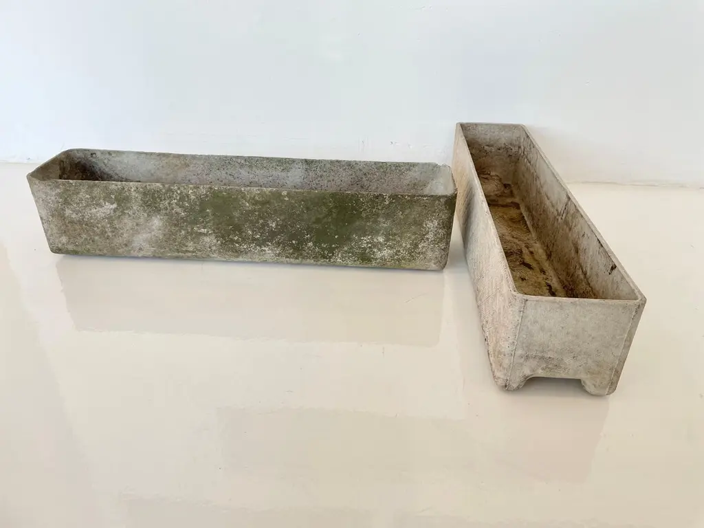 Concrete trough planters by Swiss architect Willy Guhl. Just under 32" long. Factory drilled drainage holes. Perfect depth for narrow spaces. 21 available. Priced individually.