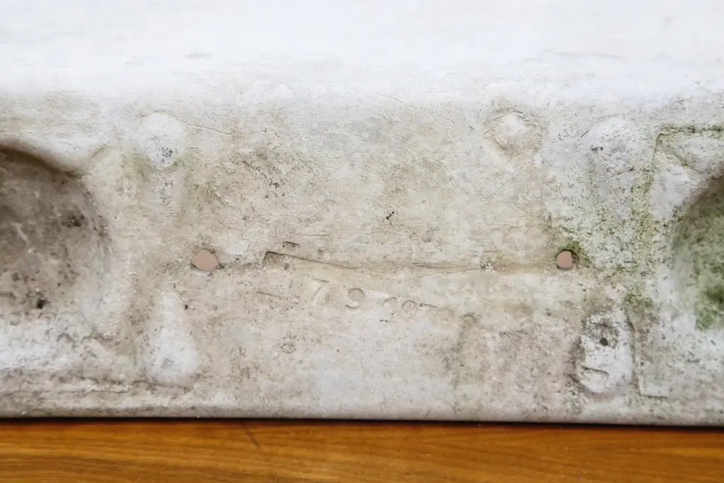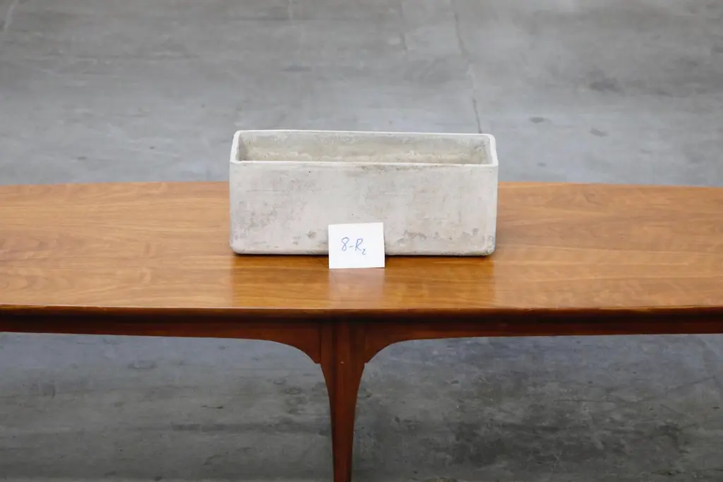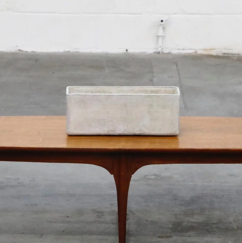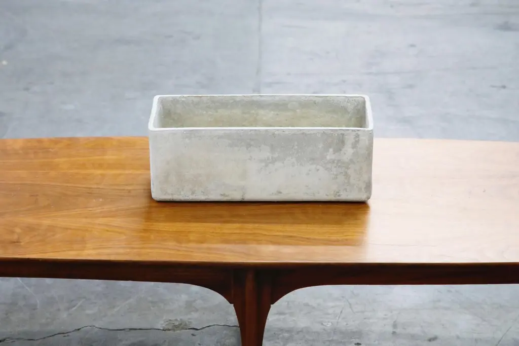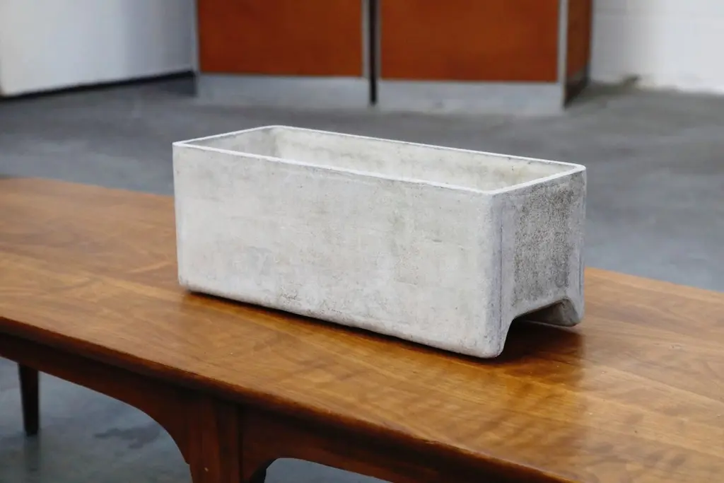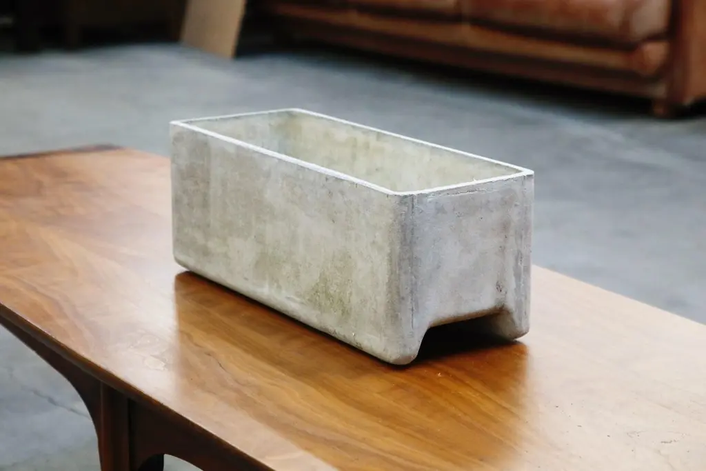 This designer on-trend architectural rectangular concrete planter is by Swiss architect Willy Guhl for Eternit, crafted in the 1970s Switzerland and signed and dated underneath. This special low-profile and rare long sized rectangle-shaped concrete planter has a patinated natural exterior finish and organic aging over decades of UK climate. Excellent planter size for a variety of various uses such as succulents, plants, weeping grass with the planter on a stand, balcony privacy hedge, or any other outdoor decorative use.Consider using this Willy Guhl Concrete Planter Pot in a Architectural, Postmodern, Mid-Century Modern, Scandanavian Modern or Danish Modern garden, yard or penthouse apartment balcony but could also look fantastic in a Contemporary or Zen / Minimalism setting. Also consider mixing it up in a Traditional, Transitional, Classical or Art Deco space with a splash of juxtaposition. Would also be an apt choice in a commercial project such as an outdoor hotel lobby lounge or members club, creative design studio or high-rise executive office balcony.Condition:Sturdy and structurally sound. Has beautiful antiquing and patina throughout from decades of organic aging which can include minor chipping, stains or other blemishes however this lightly distressed look is common, expected and desirable for these early production originals. Measurements:H 6" x W 15.75" x D 6"