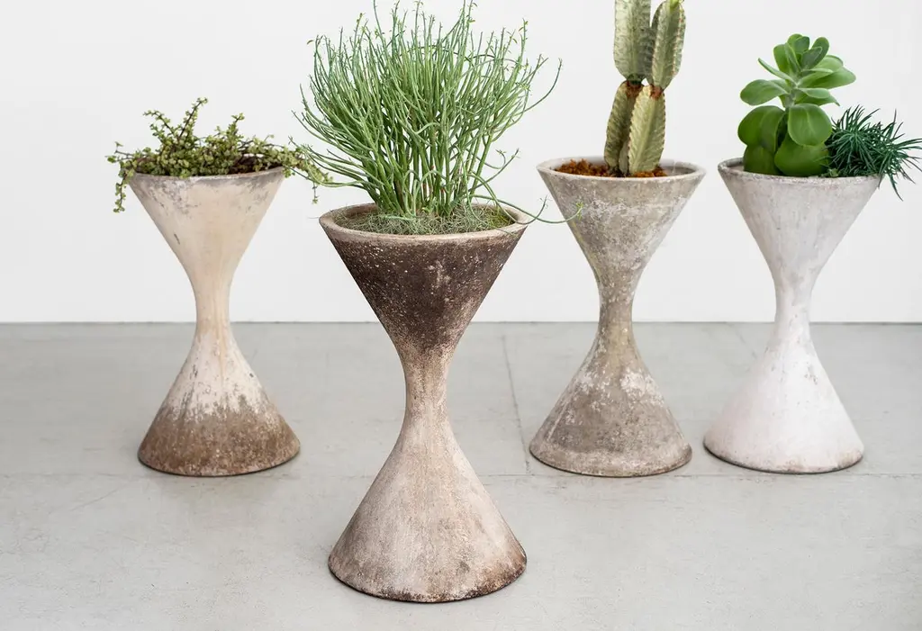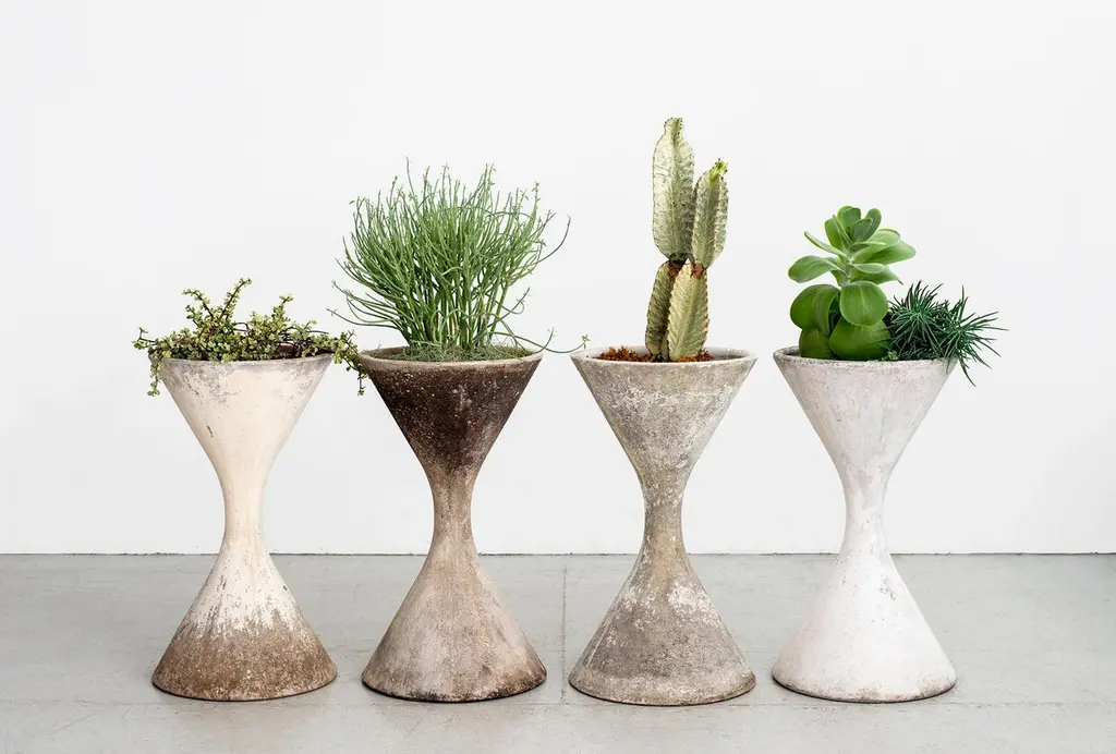Willy Guhl "Diablo" shaped concrete pots.Multiple sizes and quantities of each available.This listing is for 31.5" H x 17.75.