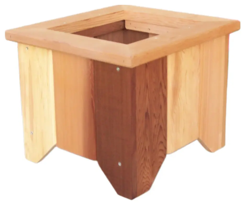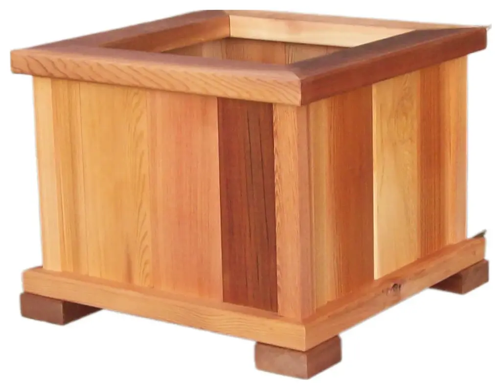 Made of Western Red Cedar "“ full dimension 2"³x4"³ material -not skimpy thin material that you usually find. These planters are like our furniture "“ no rough edges! The legs keep the planter up off the deck so there will be air flow to help prevent rotting and staining or moisture build up. Our planters can be finished with a natural cedar weather stain or purchased unstained.Inside Dimensions: 16.75"³L x 16.75"³W x 12.5"³HOverall Dimensions: 20.5"³L x 20.5"³W x 16.5"³H