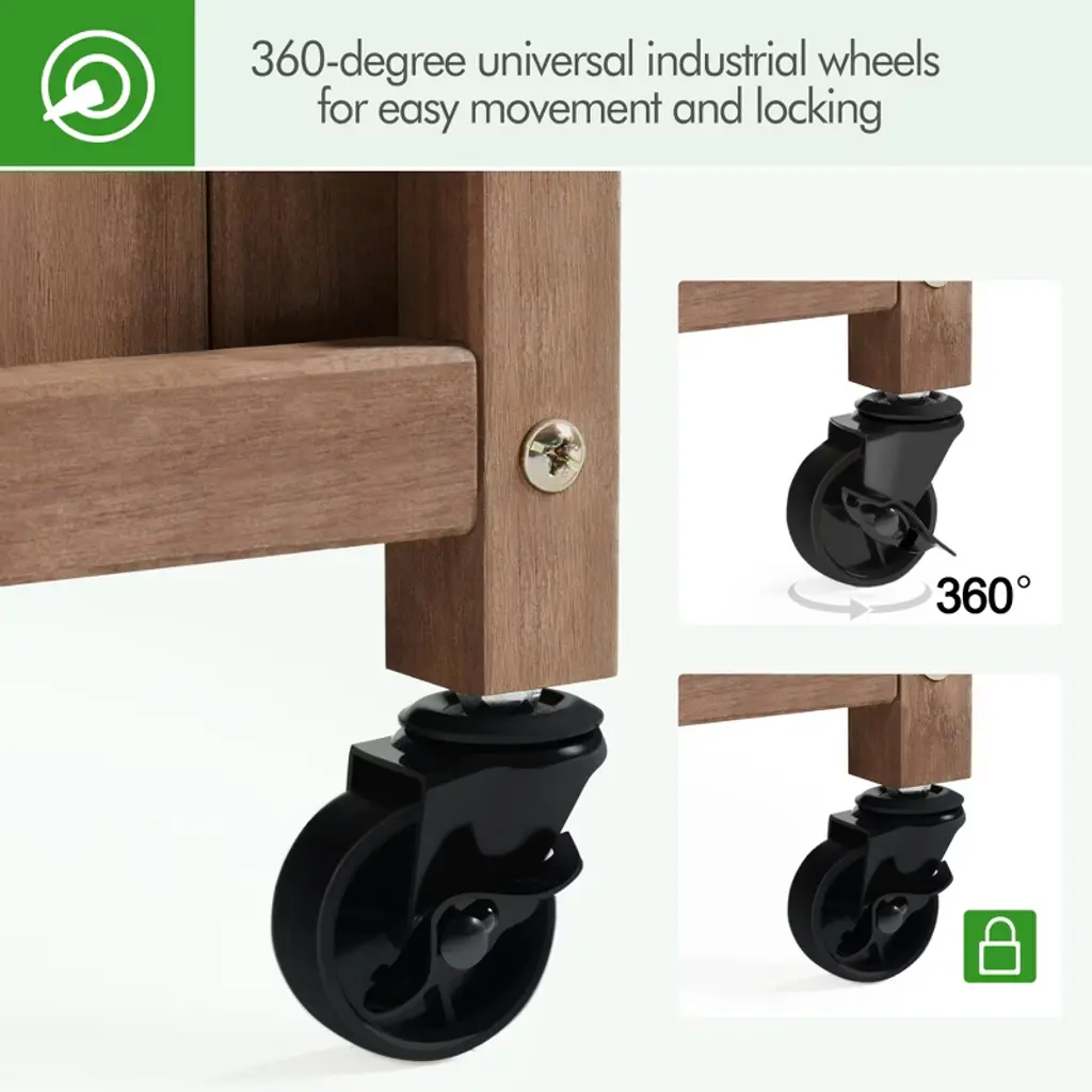 This raised garden bed with lockable castors is designed for climbing vines and can transform any corner into a vibrant, lively space. Made from 100% fir wood, it offers a smooth, neat finish that adds artistic charm to your home. Ideal for all types of plants, it’s versatile enough for gardens, greenhouses, and yards—helping you bring greenery to any space. The built-in drainage system at the bottom ensures proper watering. Additionally, the trellis offers a place to display small items like keychains and photos. A planter box with a trellis not only supports vertical-growing plants but also enhances your décor with style and impact. Specifications: Materials: Fir WoodColor: Dark BrownOverall Dimensions: 35.5″ L × 18″ W × 75″ HTrellis: 35.5″ L × 57″ HBottom Planter Box(inner): 33″ L × 15″ W × 10″ DMaximum Weight CapacityBottom Board (flat): 220 lbTop Shelf (flat): 22 lb Please see the image for exact measurements.Please allow a 1/2″ measurement tolerance.