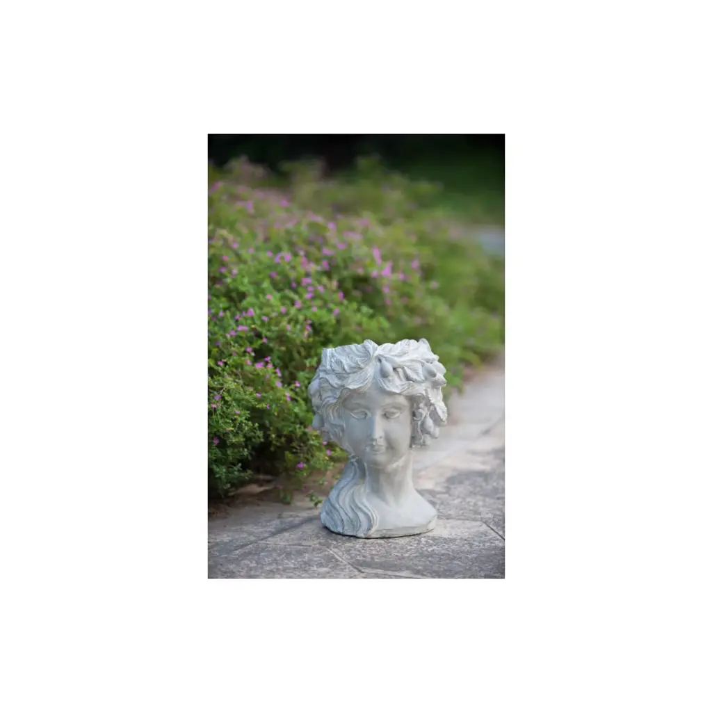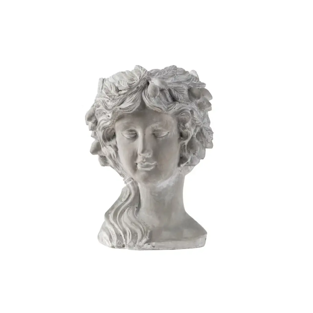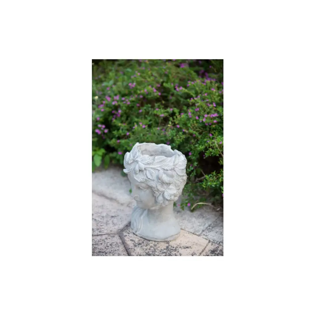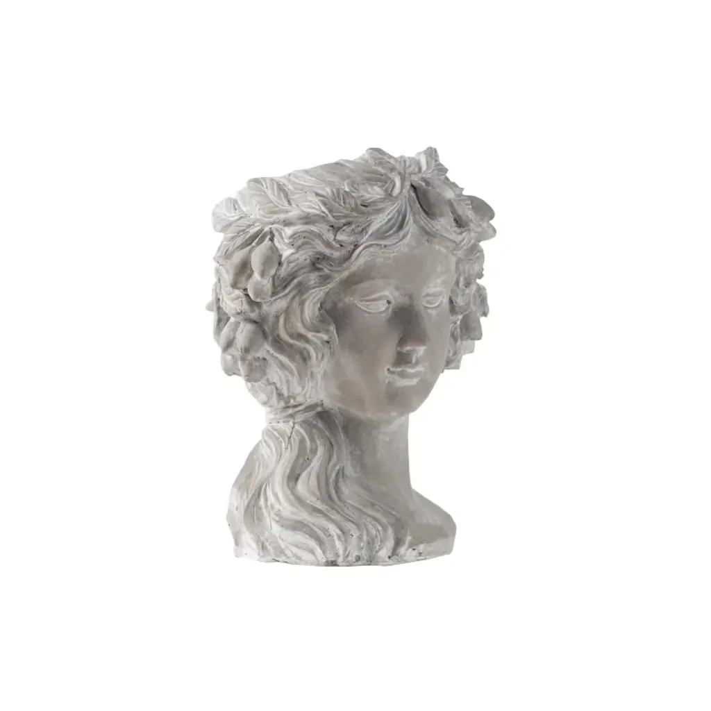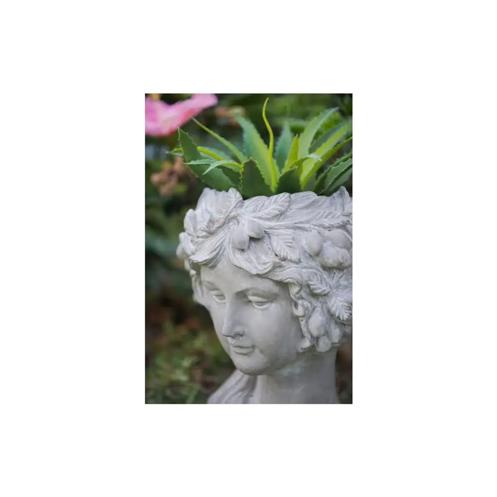 The Design Regal elegance has never looked better than this classic bust planter that boasts Old World charm. Complete with a whitewash stone finish, this head planter is detailed with a fruit wreath. It looks amazing with trailing plants to elevate the lush foliage of the garden.