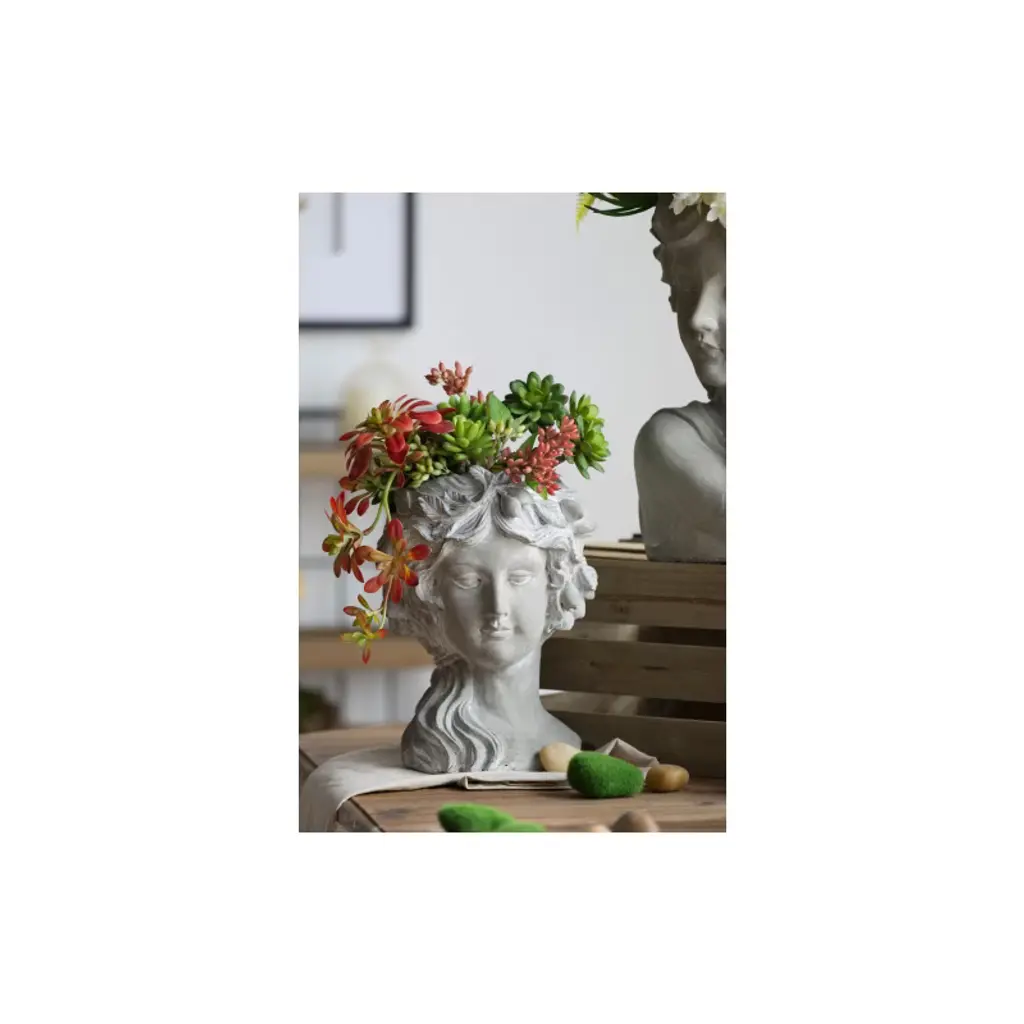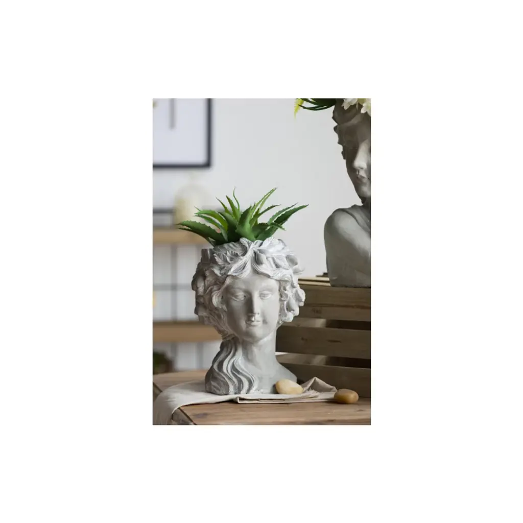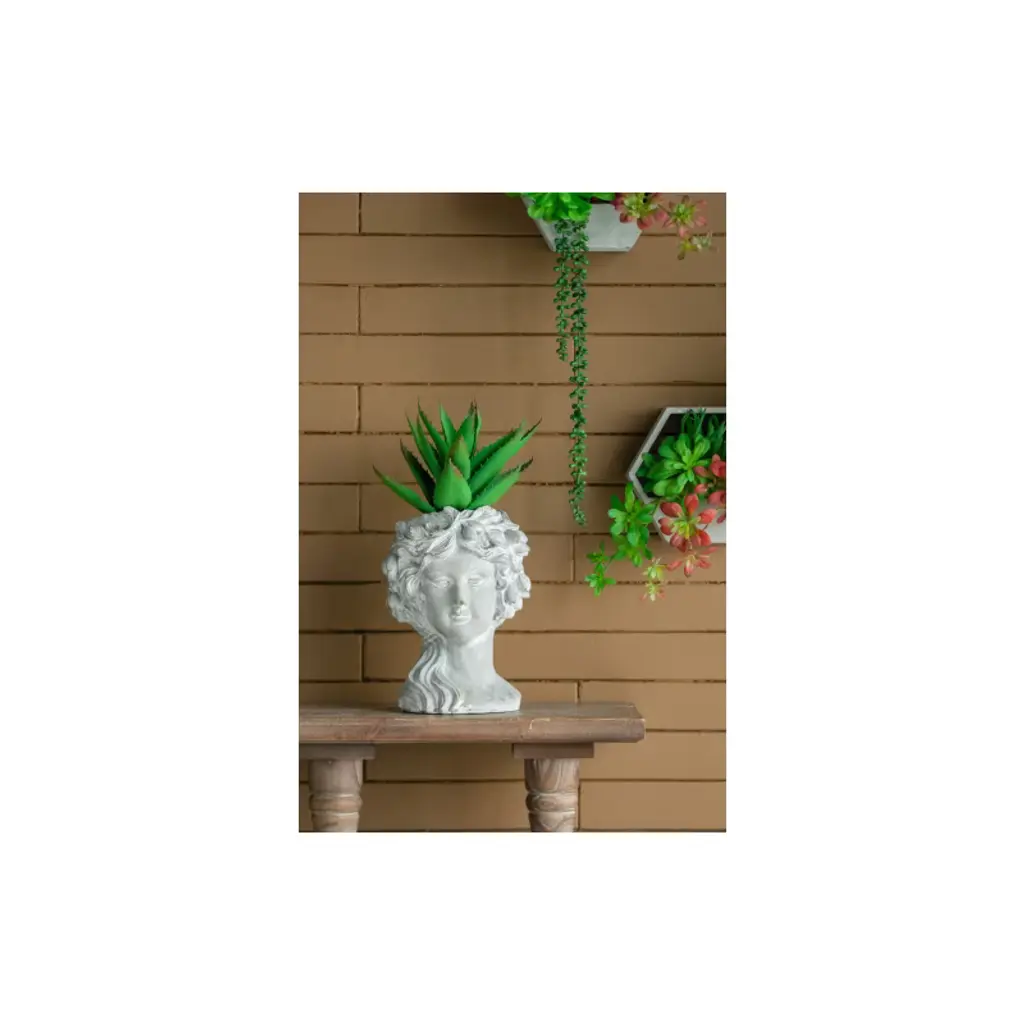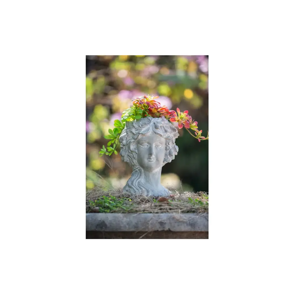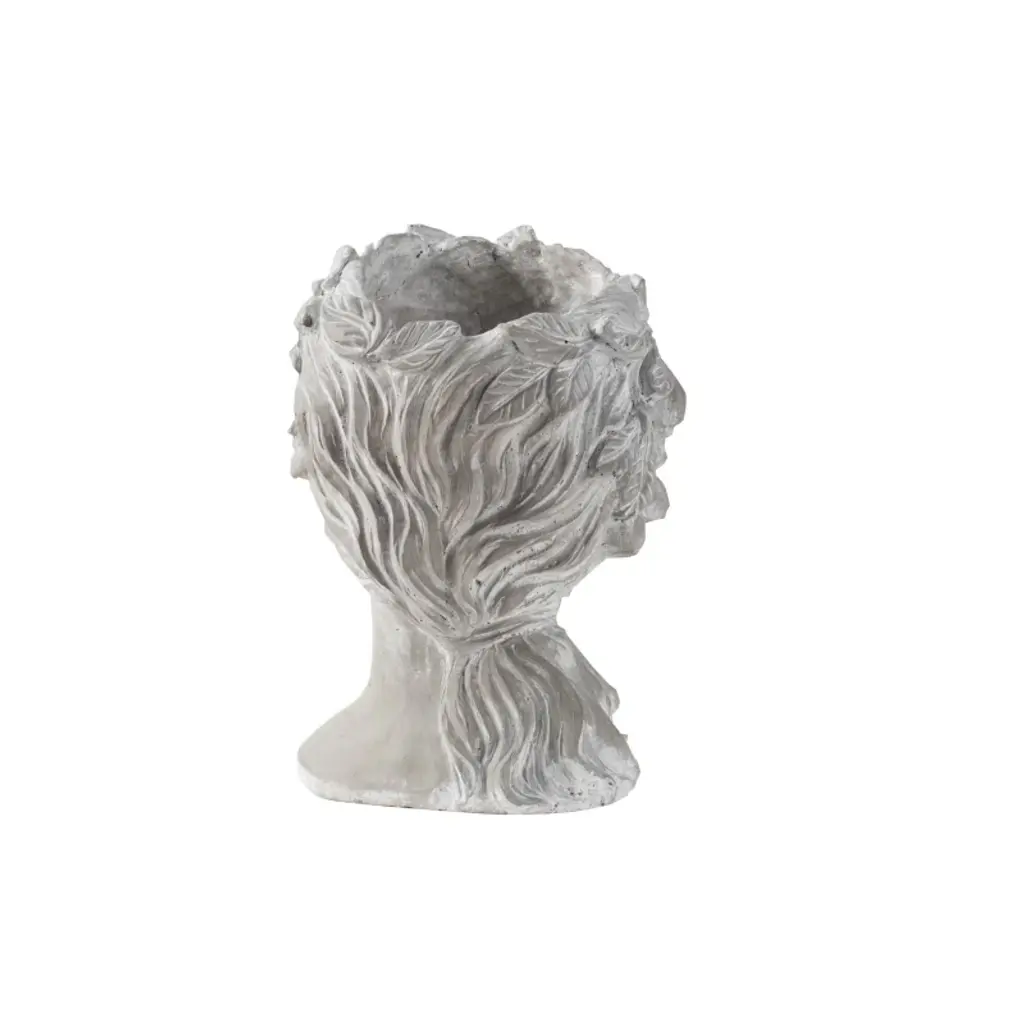The Design Regal elegance has never looked better than this classic bust planter that boasts Old World charm. Complete with a whitewash stone finish, this head planter is detailed with a fruit wreath. It looks amazing with trailing plants to elevate the lush foliage of the garden.