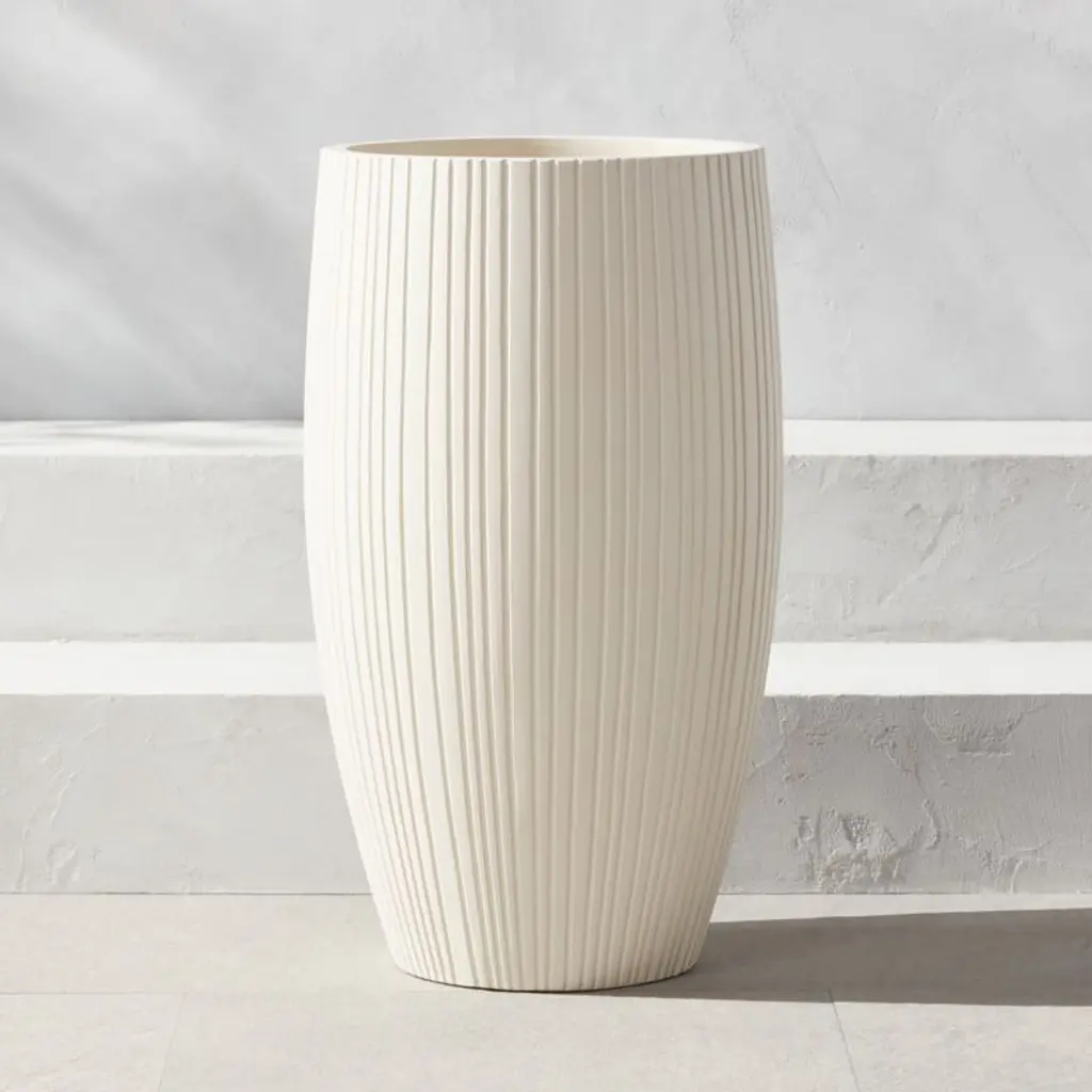 Modern outdoor planter lends effortless refinement to patios, decks and balconies with its ribbed detailing and elegantly tapered base. Crafted of a textured composite, vessel is lightweight and easy to move. Finished in soft white for a look that's light and fresh while contrasting beautifully with lush greenery. Group with the small and medium white outdoor planters for a layered display. CB2 exclusive.