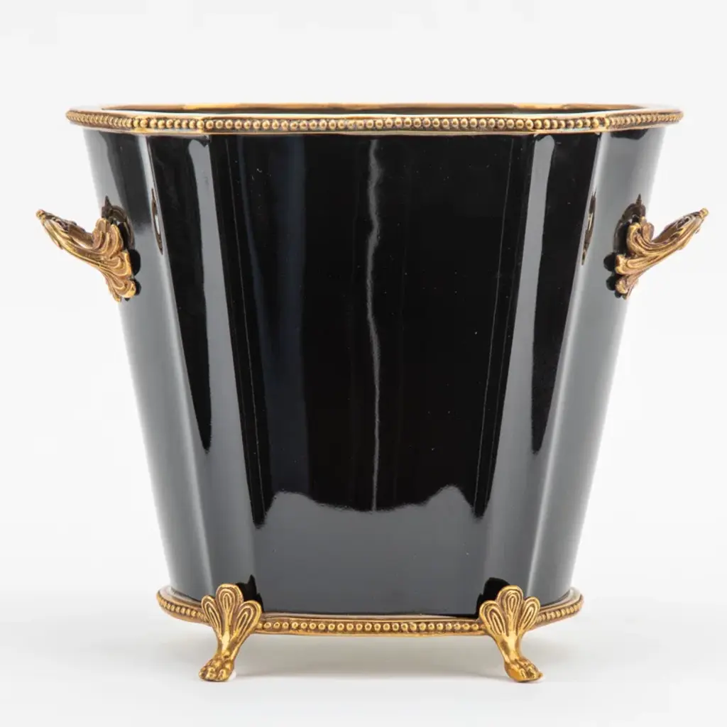 The European interpretation of the classic Chinese blue and white porcelain pottery is sometimes embellished with metal accents. This planter features a metal lip, handles, and foot, offering elegance, durability, and a perfect vessel for your favorite flowers.