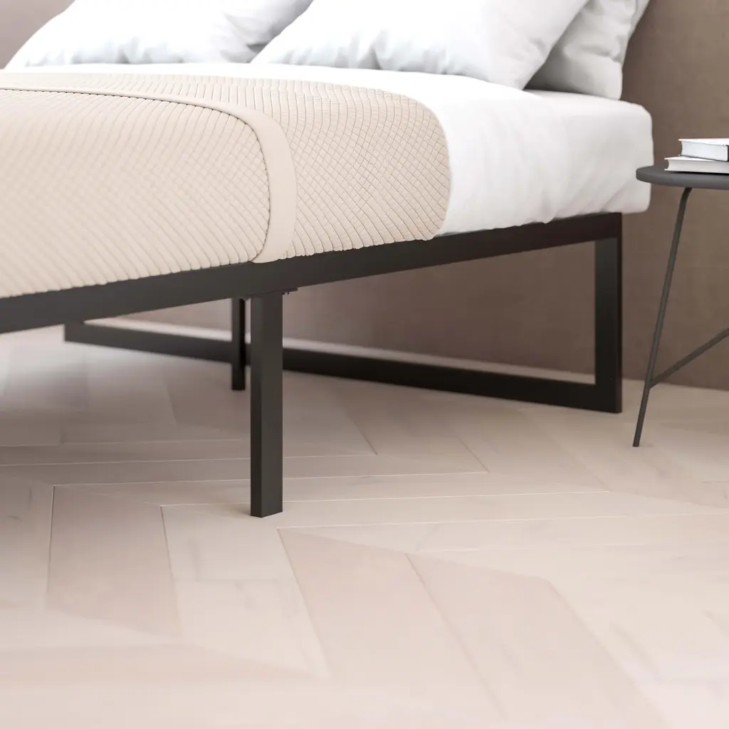 Polish the look of your bedroom or guest room with the sophisticated, artisan design of this textured finish metal platform bed frame. The lack of a headboard and footboard will streamline a modern bedroom but will also give the illusion of an open, airy space in a small room and making the bed is infinitely easier with no obstacles in the way. If you like to change the layout of your room often, this metal bed frame is easily moved making redecorating a breeze. Best of all, the 12.5 inches of clearance under the frame allows for generous underbed storage and easy access for cleaning. If you're looking for a solid, stable metal bed frame that can last for years without breaking down you've come to the right place. This platform bed frame is constructed from 19 gauge solid steel reinforced with metal screw construction to accommodate most users. Solid steel slats stay in place to prevent sagging helping to increase the lifetime of your mattress. This metal platform bed frame will support your memory foam, latex or traditional innerspring mattress with no need for a box spring. Adhesive strips prevent your mattress from moving. Fixed plastic floor glides will prevent damage to your flooring. In case of spills or dust build up, simply clean with a damp cloth. Easily assembled, this metal platform bed frame will be ready to go in 30 minutes or less with the included tools for quick use. Pair this metal platform frame with our 12 Inch CertiPur-US Certified Foam and Pocket Spring Mattress to complete your setup and get an excellent nights sleep.