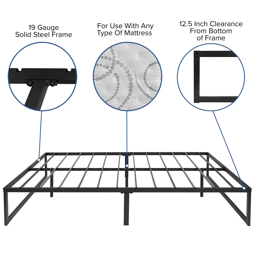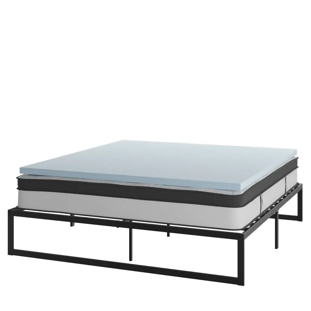 A great night's sleep should never be taken for granted and this bundled set including a 14 inch bed frame, 12 inch mattress and 2 inch memory foam mattress topper can be yours with the click of a button. Bedroom furniture is an investment so durability is always at the top of the must have list. This bed frame foundation with included mattress and memory foam topper features a 14" freestanding metal platform bed frame offering 12.5 inches of clearance for storage and ease of cleaning. Constructed from 19 gauge solid steel with reinforced metal screw construction this frame will hold up to 650 pounds. Solid steel slats hold the included 12" foam and pocket spring mattress and 2" memory foam topper without sagging and does not require a box spring. The lack of a headboard or footboard streamlines any sleep space and will lend vertical real estate to smaller bedrooms. This complete bed set bundle gives you an unparalleled sleeping experience. This medium-firm foam and pocket spring mattress features individually wrapped pocket spring coils for exceptional support and reduced motion transfer alleviating pressure points to help you stay asleep. As if that weren't enough to have you clicking the add to cart button, this bed frame and mattress set comes with a 2" memory foam topper to wrap you in cushioned comfort. The foam is CertiPUR-US Certified so it's free from heavy metals, phthalates, BPDE, formaldehyde and has reduced VOCs. Arriving compressed and boxed for ease of movement, the mattress and topper will fully expand with 48 to 72 hours. Live your best life when you wake up relaxed and refreshed on this 3 piece complete bed set.