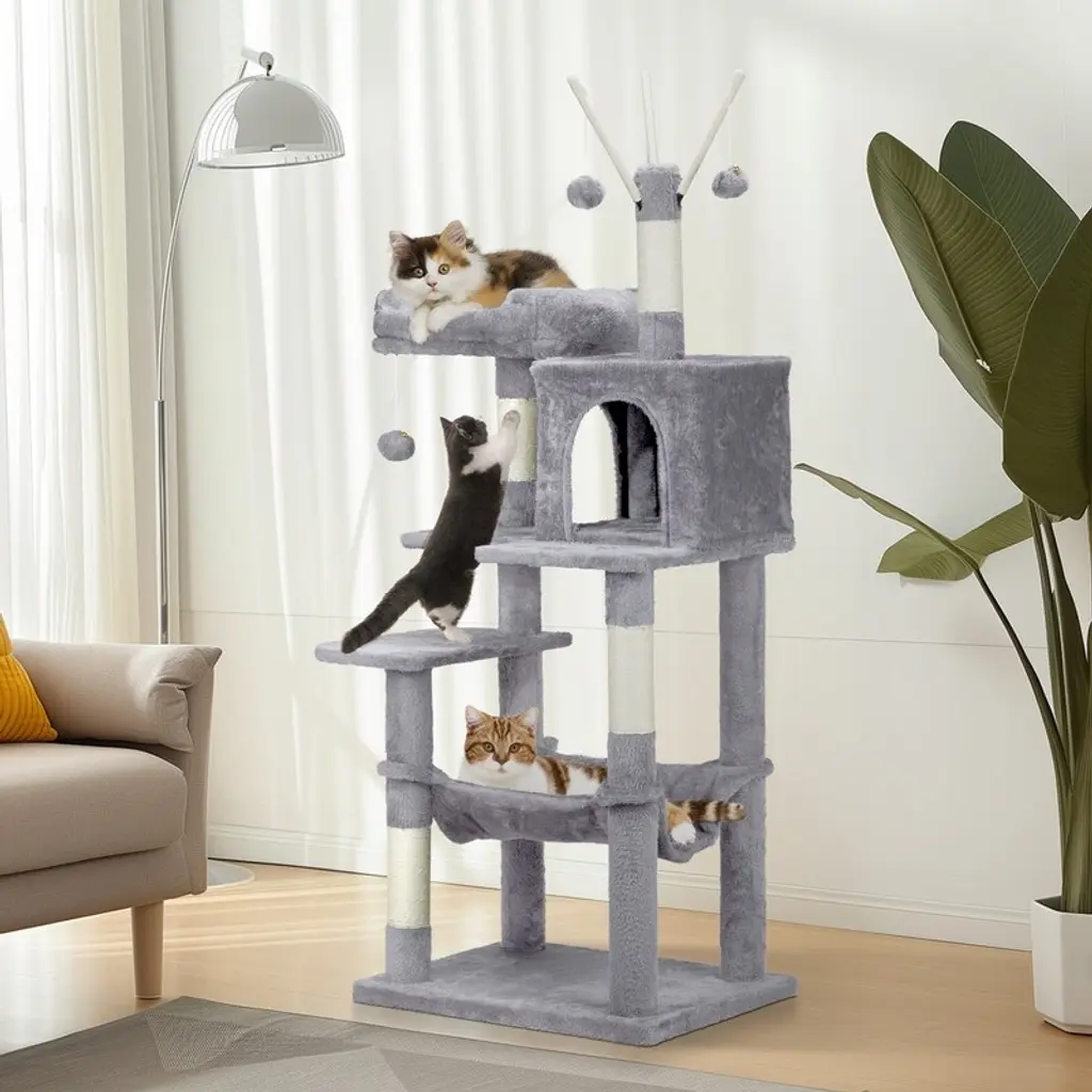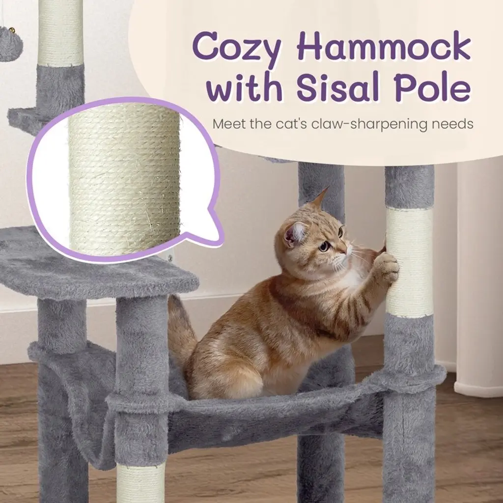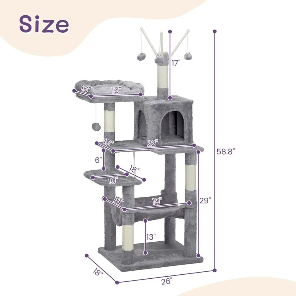 Introductions: Give your feline friends the ultimate playground with our 57 inch Cat Tree Cat Tower. Designed for indoor cats, this multi-level cat house provides endless entertainment and comfort. Featuring a padded platform bed, interactive toy balls, a large cozy condo, and sisal scratching posts, this cat tree caters to all your cat's needs. Its light grey color and stylish design make it a perfect fit for any home decor.Features: 1. Ultimate Cat Play Center: This multi-level cat tree offers endless fun with areas for scratching, climbing, sleeping, and exercising. Your cats will love the well-padded perches, large cozy condo, and interactive toy balls, making it their favorite activity hub. 2. Perfect Scratching Solution: Keep your cats happy and your furniture safe with multiple sisal-wrapped scratching posts. These posts are perfect for satisfying your cats' natural claw-sharpening instincts, providing a dedicated space for them to scratch. 3. Sturdy and Secure: Built with high-quality engineered wood, this cat tower is designed for maximum stability. The reinforced base and anti-toppling fittings ensure a secure and safe environment for your cats to play and rest. 4. Comfortable and Cozy: Featuring a spacious condo and a padded platform bed, this cat tree provides luxurious napping spots. The plush fabric covering adds extra comfort, creating a perfect retreat for your feline friends. 5. Easy to Assemble: This cat tree comes with straightforward assembly instructions, allowing you to set it up quickly and effortlessly. With a low-profile light grey color, this cat tree complements any home decor.Specifications: 1. Overall Dimensions: (26 x 18 x 58.8) in / (66 x 46 x 149.4) cm 2. Material: Engineered wood, plush fabric, sisal rope 3. Net Weight: 13.5 kg / 29.8 lbsPackage Includes: 1 x Cat Tree