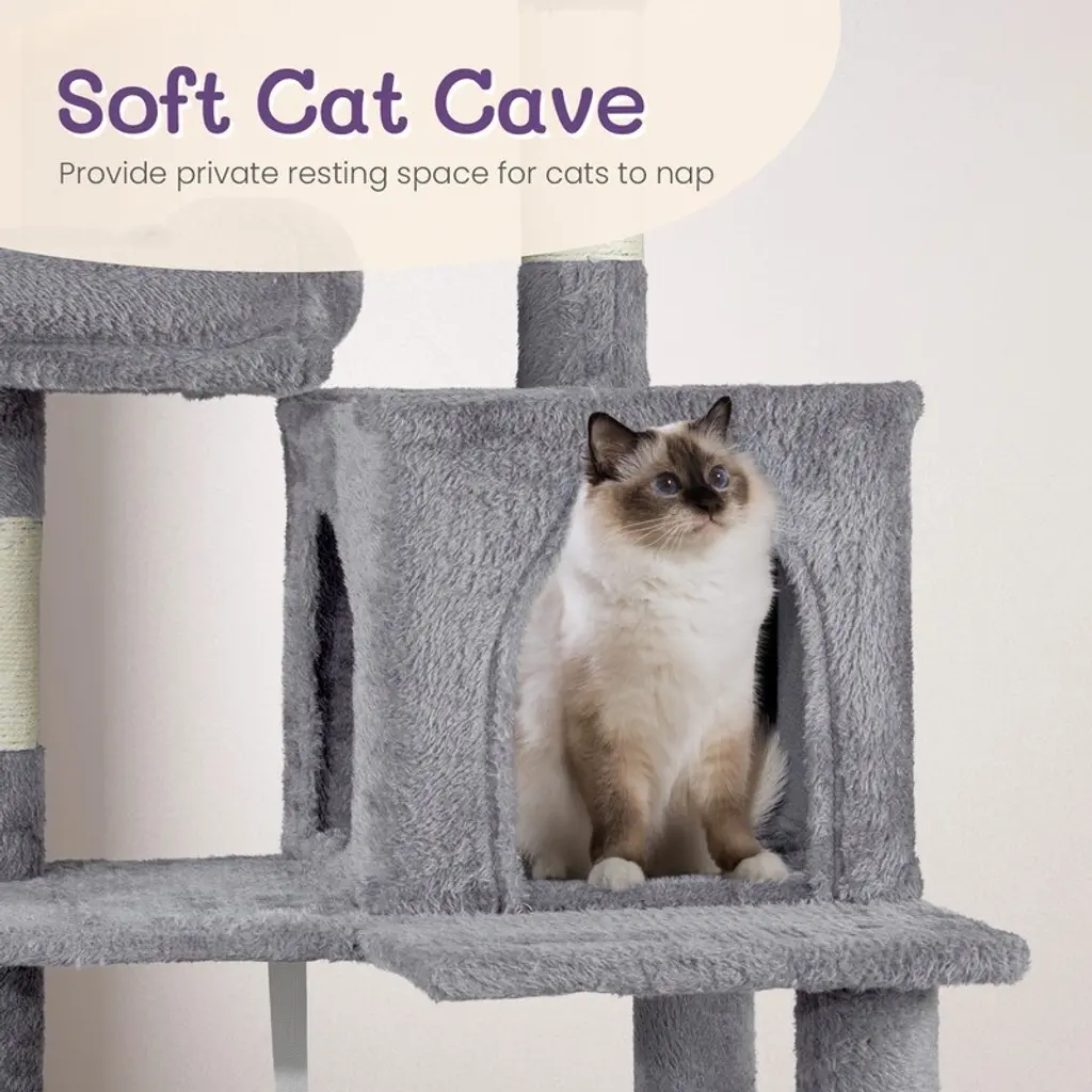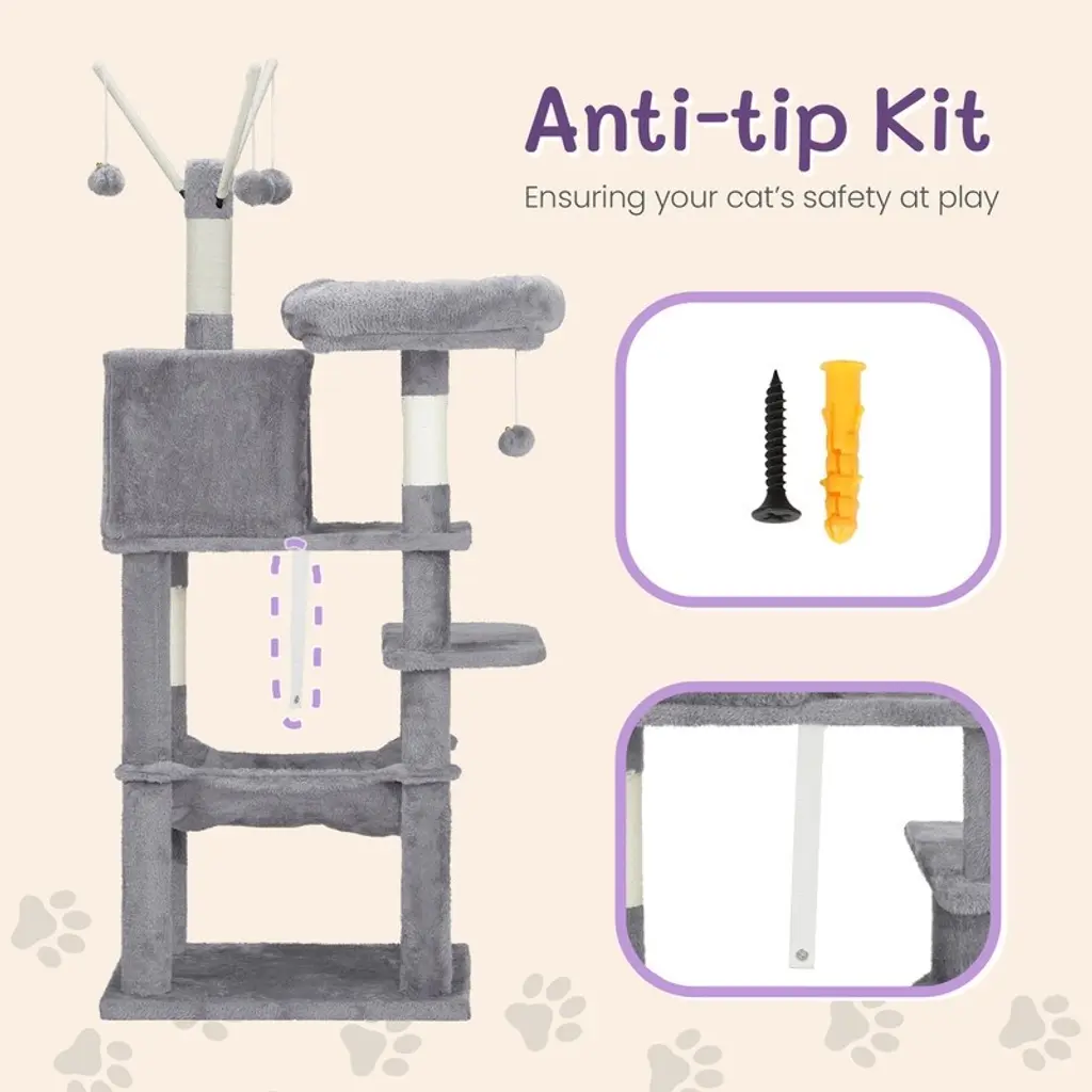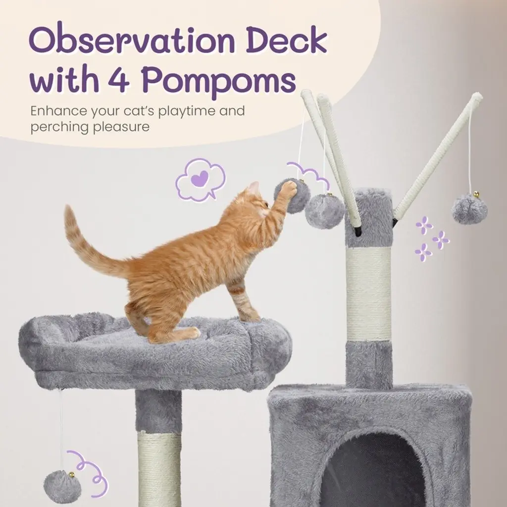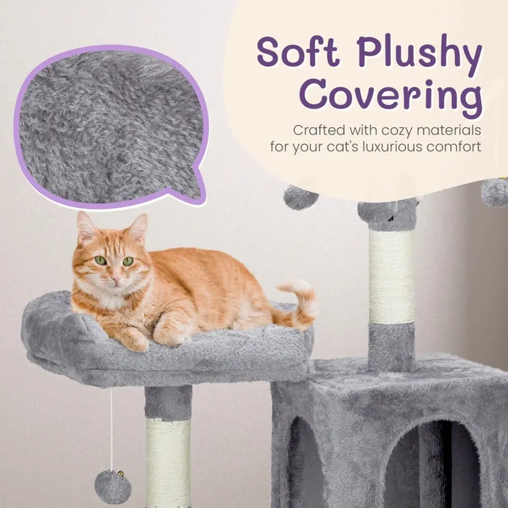 Introductions: Give your feline friends the ultimate playground with our 57 inch Cat Tree Cat Tower. Designed for indoor cats, this multi-level cat house provides endless entertainment and comfort. Featuring a padded platform bed, interactive toy balls, a large cozy condo, and sisal scratching posts, this cat tree caters to all your cat's needs. Its light grey color and stylish design make it a perfect fit for any home decor.Features: 1. Ultimate Cat Play Center: This multi-level cat tree offers endless fun with areas for scratching, climbing, sleeping, and exercising. Your cats will love the well-padded perches, large cozy condo, and interactive toy balls, making it their favorite activity hub. 2. Perfect Scratching Solution: Keep your cats happy and your furniture safe with multiple sisal-wrapped scratching posts. These posts are perfect for satisfying your cats' natural claw-sharpening instincts, providing a dedicated space for them to scratch. 3. Sturdy and Secure: Built with high-quality engineered wood, this cat tower is designed for maximum stability. The reinforced base and anti-toppling fittings ensure a secure and safe environment for your cats to play and rest. 4. Comfortable and Cozy: Featuring a spacious condo and a padded platform bed, this cat tree provides luxurious napping spots. The plush fabric covering adds extra comfort, creating a perfect retreat for your feline friends. 5. Easy to Assemble: This cat tree comes with straightforward assembly instructions, allowing you to set it up quickly and effortlessly. With a low-profile light grey color, this cat tree complements any home decor.Specifications: 1. Overall Dimensions: (26 x 18 x 58.8) in / (66 x 46 x 149.4) cm 2. Material: Engineered wood, plush fabric, sisal rope 3. Net Weight: 13.5 kg / 29.8 lbsPackage Includes: 1 x Cat Tree
