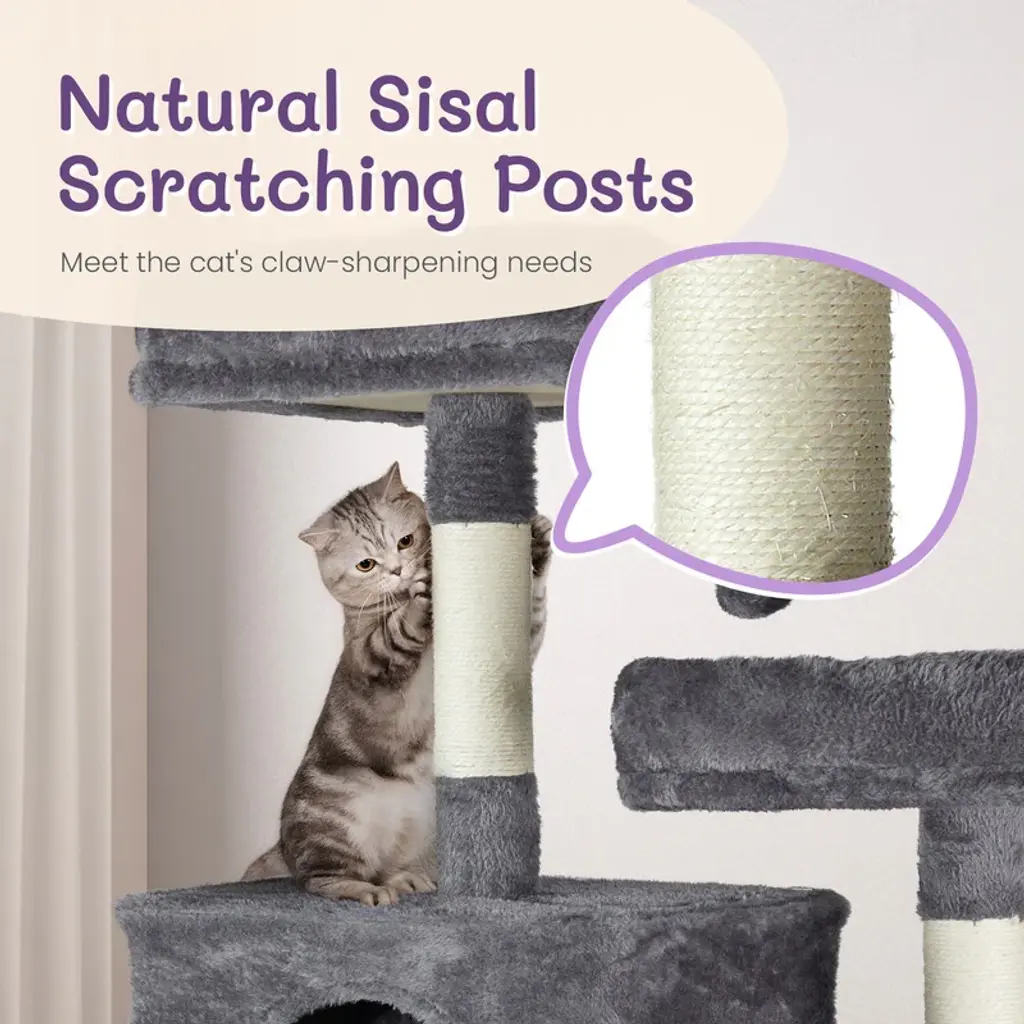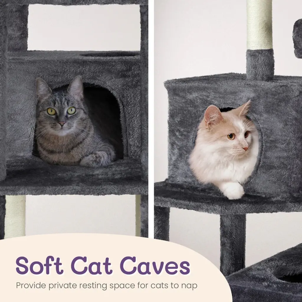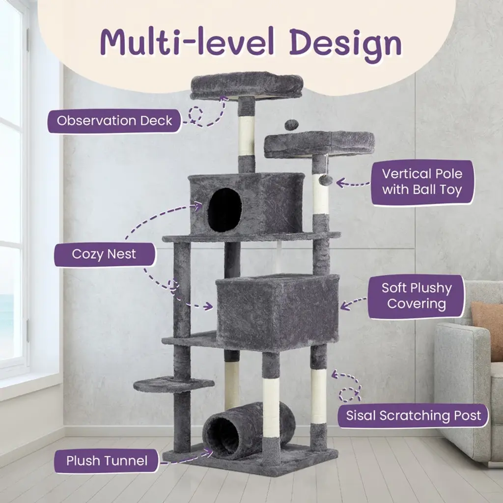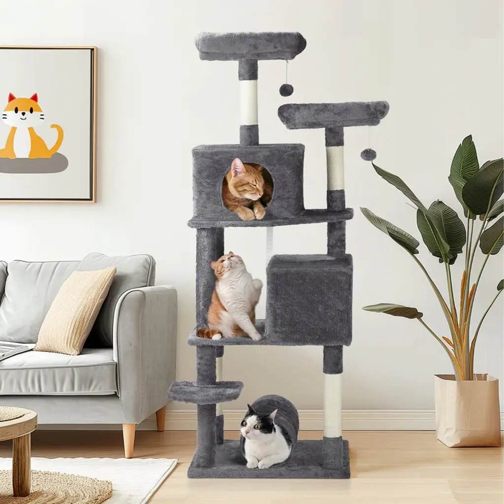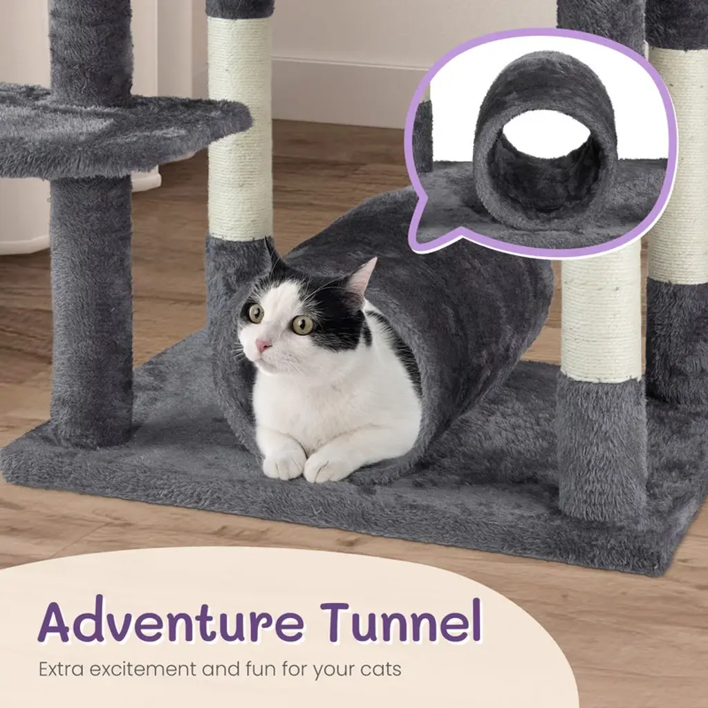Introductions: Give your indoor cats the ultimate playground with our 65 inch Cat Tree Cat Tower. This large multi-level cat play house is designed to keep your feline friends entertained, active, and comfortable. With padded platform beds, spacious cozy condos, sisal-wrapped scratching posts, engaging toy balls, and a fun cat play tunnel, this cat tower provides endless opportunities for play and relaxation. Its elegant dark grey color complements any home decor, making it a stylish and functional addition to your living space.Features: 1. Ultimate Cat Play Center: This large multi-level cat tree offers endless fun with areas for scratching, climbing, sleeping, and exercising. Your cats will love the well-padded perches, large cozy condos, interactive toy balls, and a cat play tunnel on the base, making it their favorite activity hub. 2. Perfect Scratching Solution: Keep your cats happy and your furniture safe with sisal-wrapped scratching posts. They are perfect for satisfying your cats' natural claw-sharpening instincts, providing a dedicated space for them to scratch. 3. Sturdy and Secure: Built with high-quality MDF board, this cat tower is designed for maximum stability. The reinforced base and anti-toppling fittings ensure a secure and safe environment for your cats to play and rest. 4. Comfortable and Cozy: Featuring two spacious condo and two padded platform beds, this cat tree provides luxurious napping spots. The plush fabric covering adds extra comfort, creating a perfect retreat for your feline friends. 5. Easy to Assemble: This cat tree comes with straightforward assembly instructions, allowing you to set it up quickly and effortlessly. With a low-profile dark grey color, this cat tree complements any home decor.Specifications: 1. Overall Dimensions: (26.5 x 26 x 67) in / (67.3 x 66 x 170.2) cm 2. Cat Condo Dimensions: 16 x 16 in / 40.6 x 40.6 cm 3. Left Condo: (16 x 12 x 11) in / (40.6 x 30.5 x 27.9) cm 4. Right Condo: (19.5 x 12 x 11) in / (49.5 x 30.5 x 27.9) cm 5. Play Tunnel Dimensions: 8 x 16 in (Diameter x Length) / 20.3 x 40.6 cm 6. Material: MDF, Plush Fabric, Sisal RopePackage Includes: 1 x 65 inch Cat Tree Cat Tower