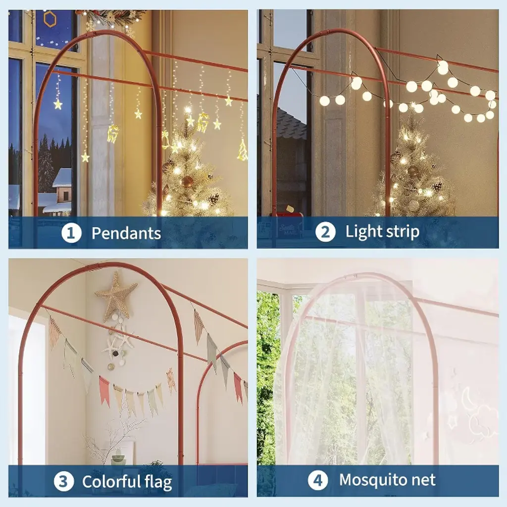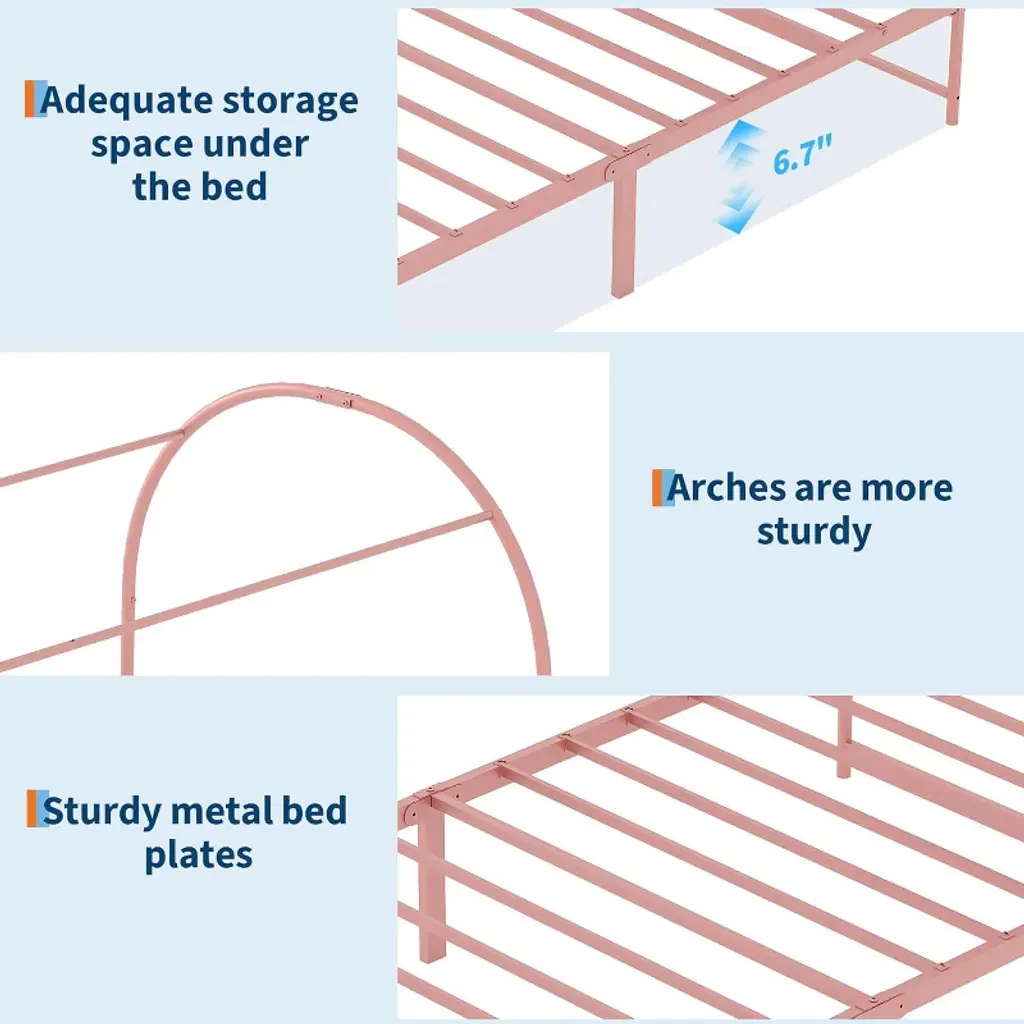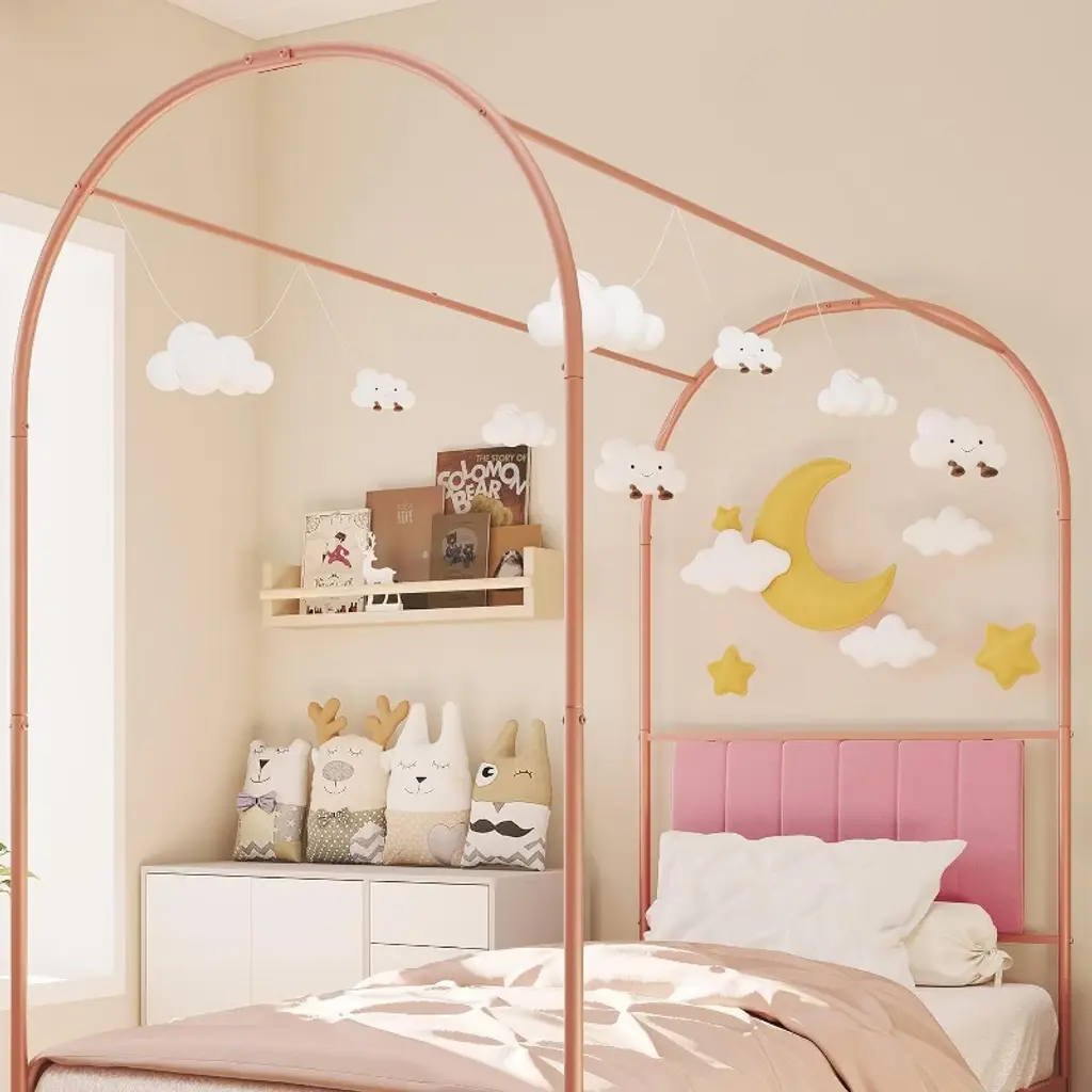 Acekool twin canopy bed adds charm to a child’s room. The arched frame sets a calm, playful scene. A soft headboard supports reading and rest. Decorate the canopy with flags, garlands, or a sheer net. Available colors include purple, pink, and white.Metal slats and reinforced arches support a twin mattress. No box spring is needed. The low height helps kids get in and out. Foot pads help protect floors and reduce sound. Smooth edges promote a kid-friendly space.Setup is simple with a clear manual and labeled hardware. Fits a standard twin mattress and common room layouts. Pairs well with many bedding styles and themes. Playful design meets steady support for everyday rest.