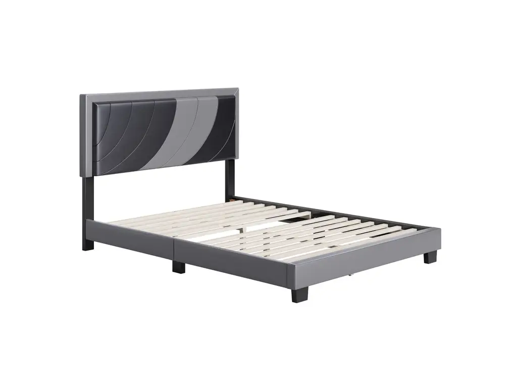 Sail away on this nautical-themed two-toned upholstered platform bed. The headboard features a bold color blocked design of an upward-moving wave to inspire only the best dreams. The headboard is framed in a contrast color, along with the sides and foot of the bed for a uniform, pulled-together look. Frame is fully wrapped and slightly padded for a premium look and feel. Bed comes with a full 14-slat system that will support up to 700 lbs. No box spring or foundation required. Ships in 1 box for easy transport. Assembles in under 15 minutes, and all hardware is conveniently zipped up behind the headboard. 1 Year Limited Warranty.