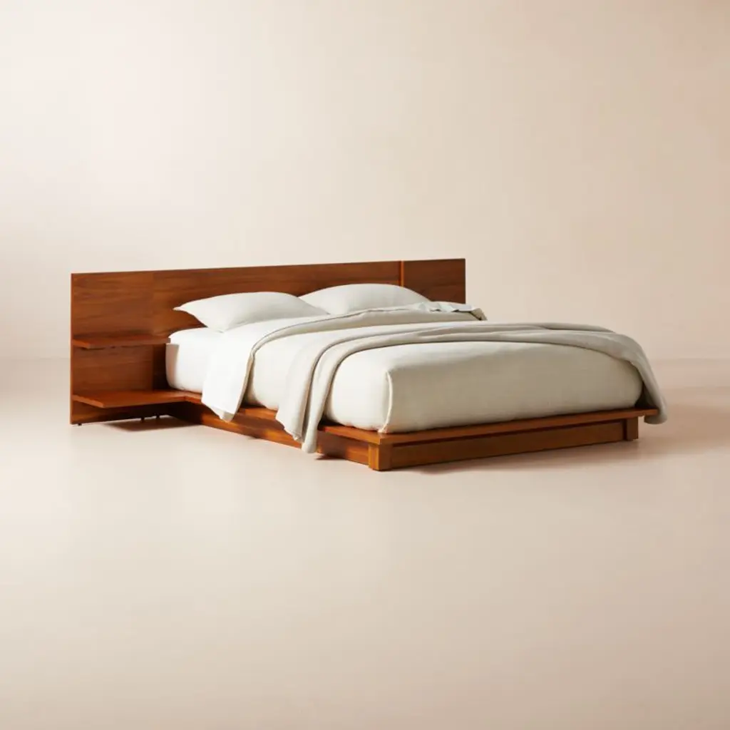 Acacia veneer platform bed integrates headboard nightstands with two cantilevered shelves eachone wide for books, one narrow with discreet cord cutouts for your light/phone/alarm clock. Ledge extends around mattress and hovers over corner block feet. Headboard is just the right height for pillow propping, too. Learn about Mark Daniel on our blog. CB2 exclusive.