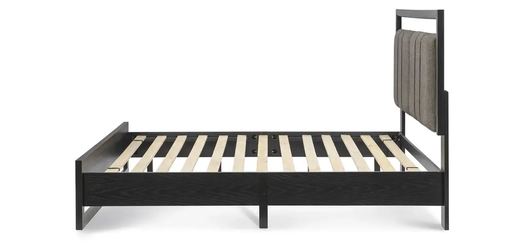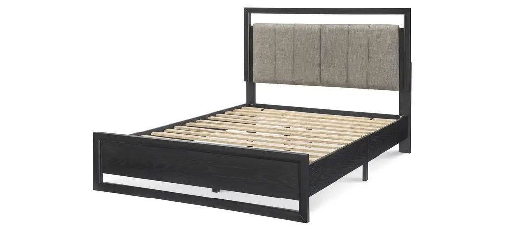 The Avery Queen Platform Bed features plenty of modern style. The light beige fabric on the headboard pops against a smooth black finish. Scaled perfectly for smaller bedrooms or guestrooms, this contemporary bed is inviting and stunning.