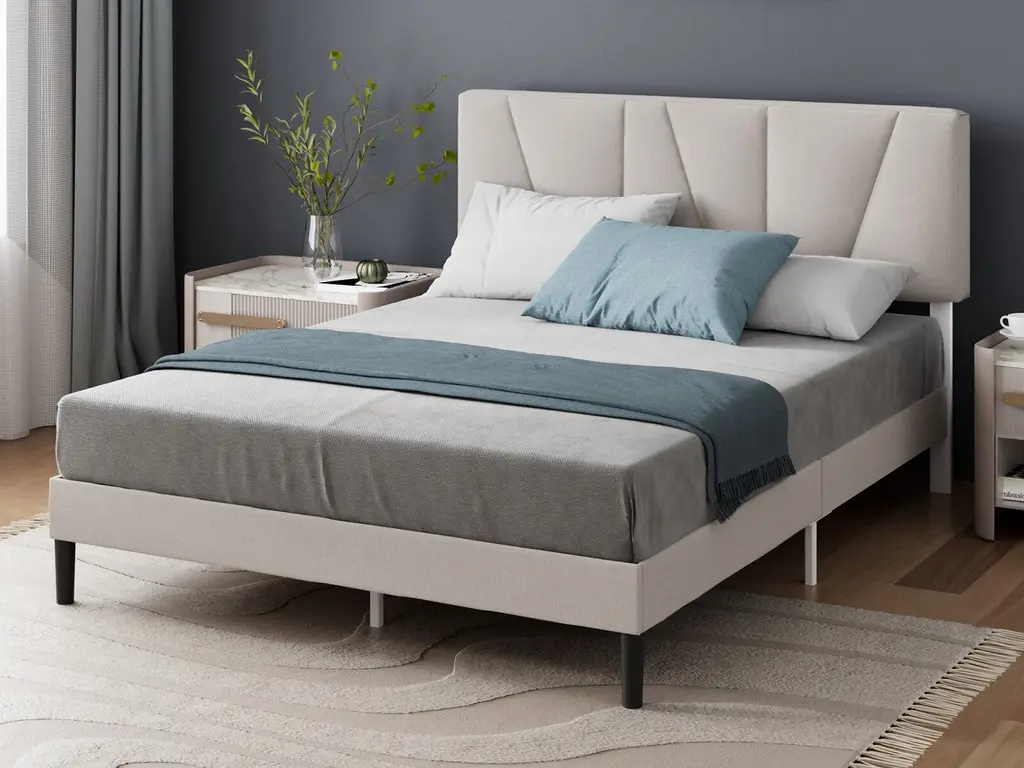 Its soft grey upholstery, adorned with subtly eclectic stitching, promises to elevate your bedroom's aesthetic to new heights. Lean back against a comfy headboard and enjoy your favorite book or binging your favorite show. Built to last, the Sleepy's Basics Upholstered Geo Platform Bed beautiful frame is reinforced with strong steel for night after night of noise-free sleep. Its platform features sturdy wooden slats, no box spring needed and helps extends the life of any mattress. Need another reason to relax? Your new bed comes neatly packed in one box designed for a smaller carbon footprint with easy assembly instructions and a worry-free warranty.