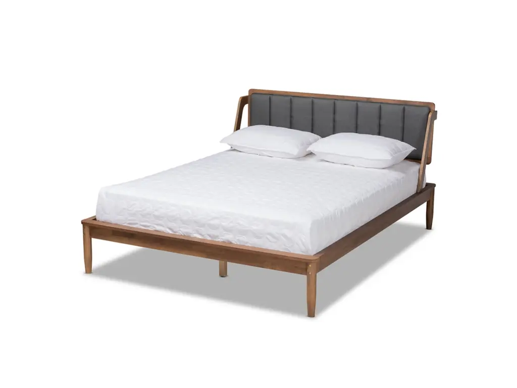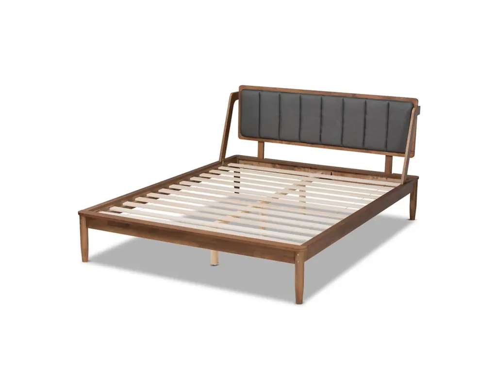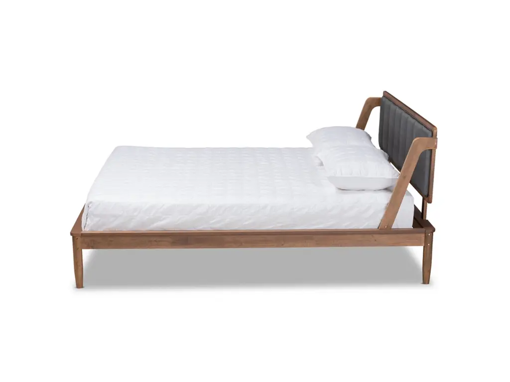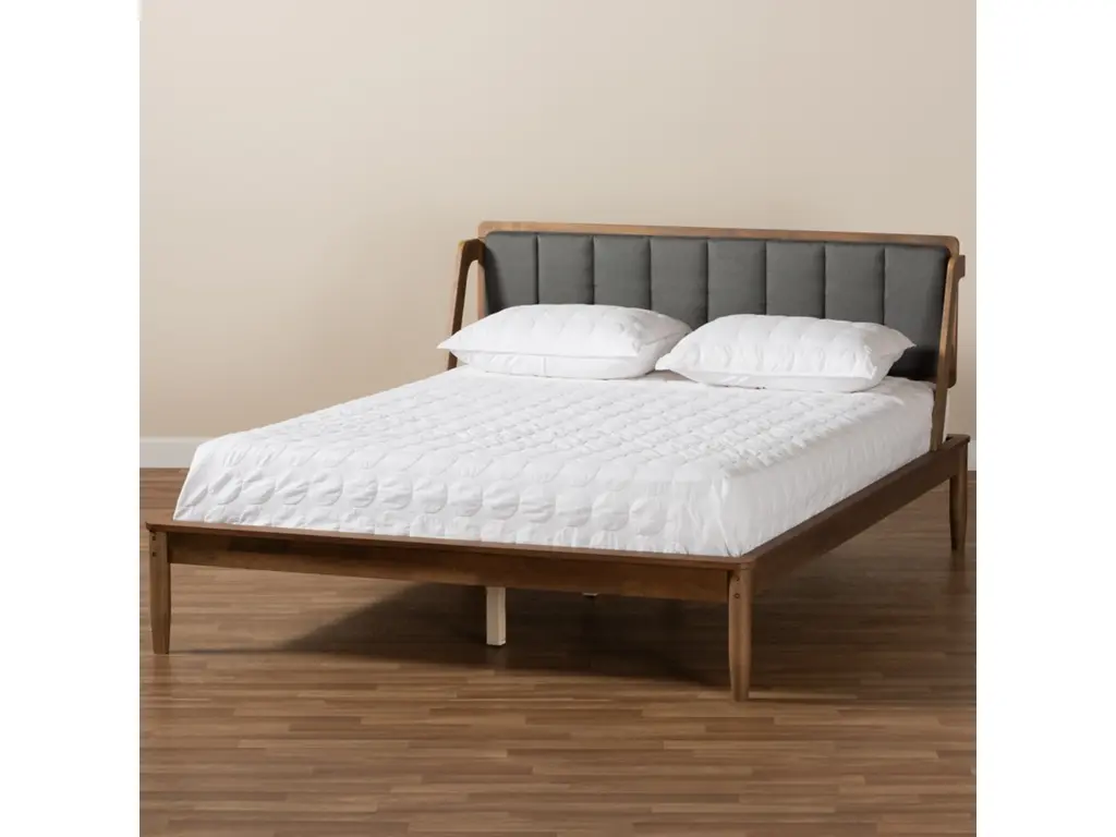 A wonderful combination of simplicity and comfort, the Helsa bed adds mid-century inspired design to any space. Made in Malaysia, the Helsa is constructed from sturdy wood finished in a neutral walnut brown to easily blend in with a large variety of room layouts and styles. The headboard is padded with soft foam and upholstered in smooth gray fabric for lavish support when sitting up in bed. Assembly is required and a box spring is not needed, as the bed comes with internal slats for mattress support. Plush channel tufting enhances the retro charm of the piece, making the Helsa bed a cozy and attractive addition to any bedroom.