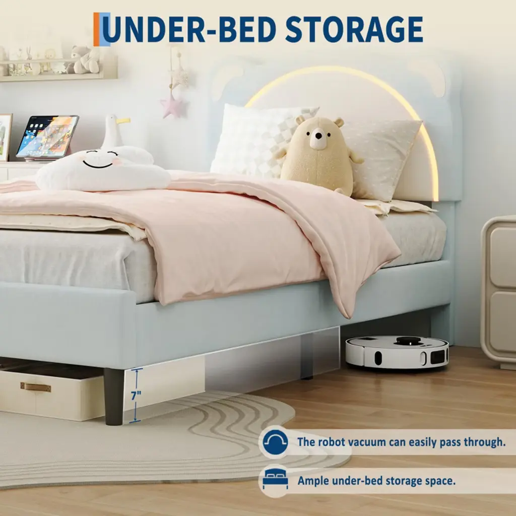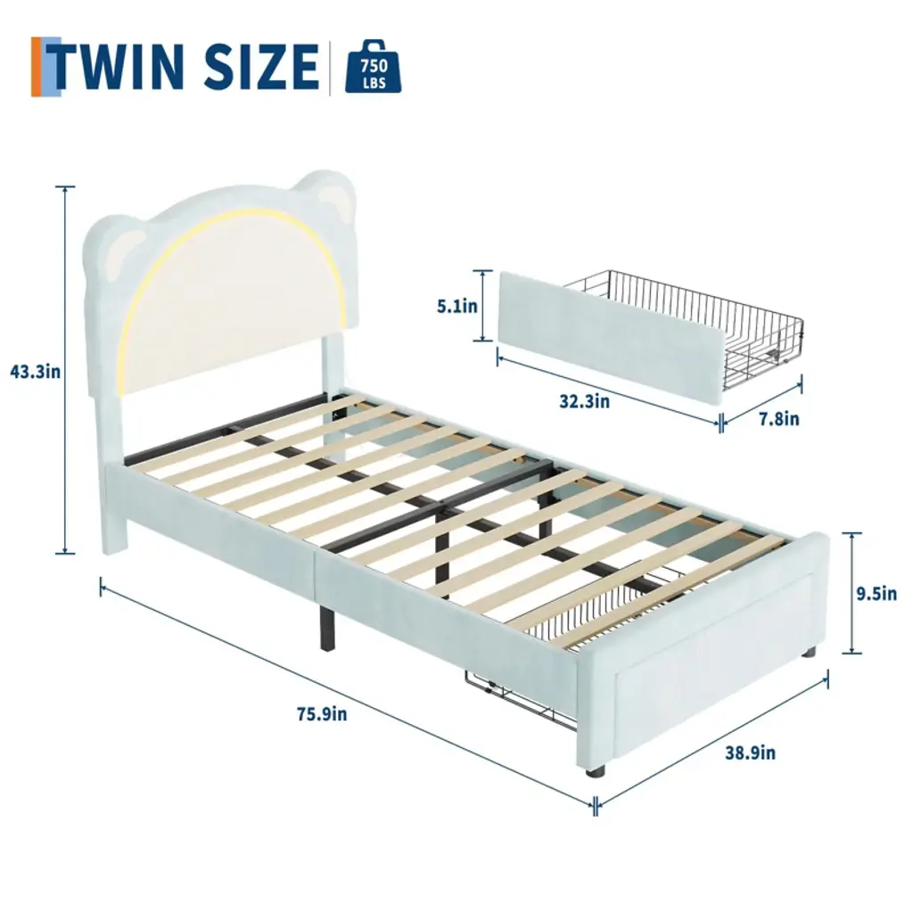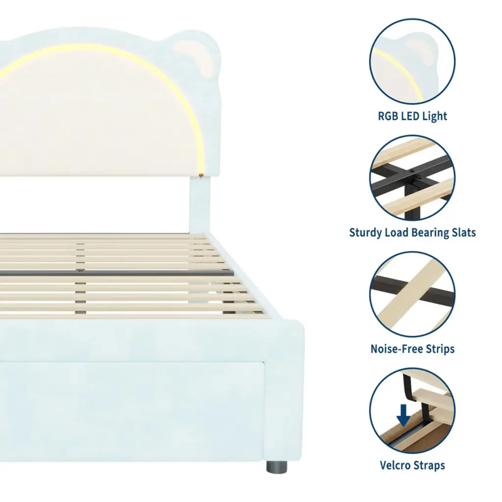 Bed Frame, Kids Upholstered Platform Bed Frame With Adjustable Headboard & Led Light, Blue Twin Size With Drawer